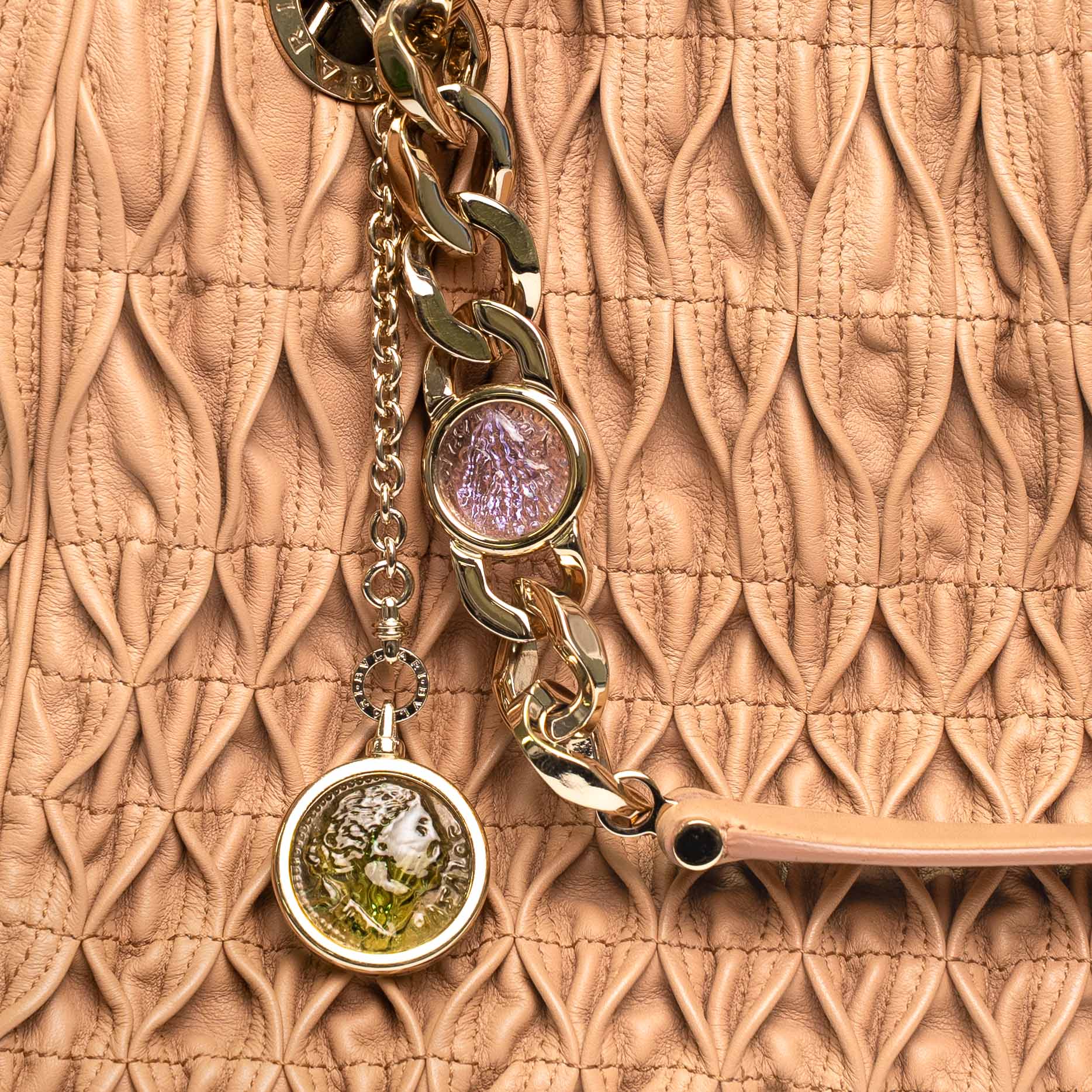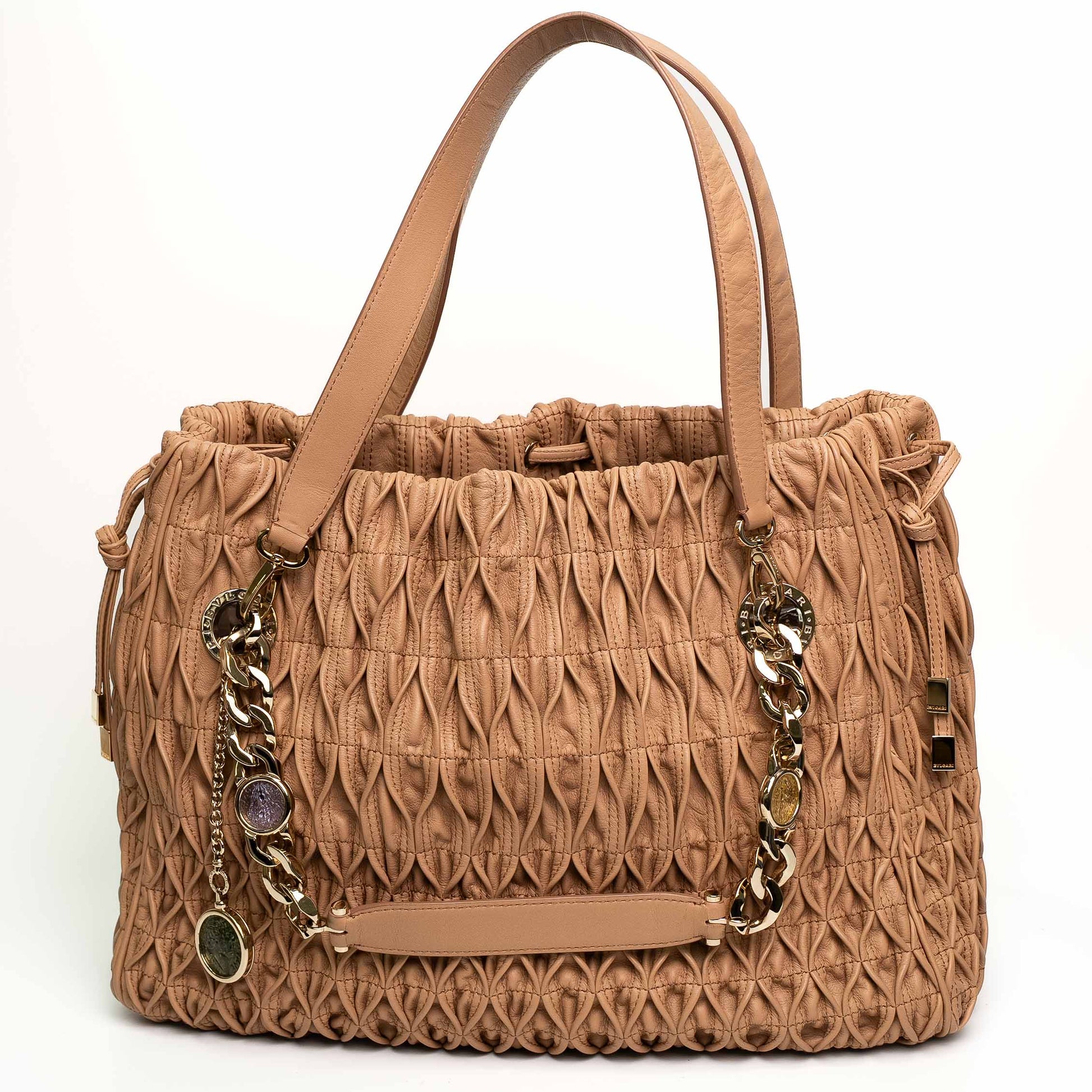 Elegant Bvlgari Willow tote crafted in softly pleated beige leather with statement chain charms and refined drawstring silhouette.