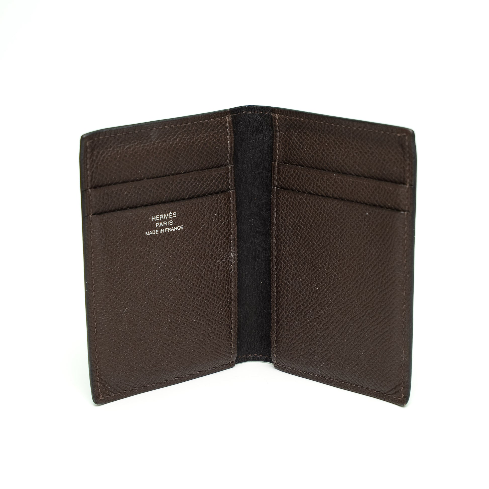 Elegant Hermès MC² Euclide wallet crafted in textured olive green and brown leather — minimalist sophistication in every detail.