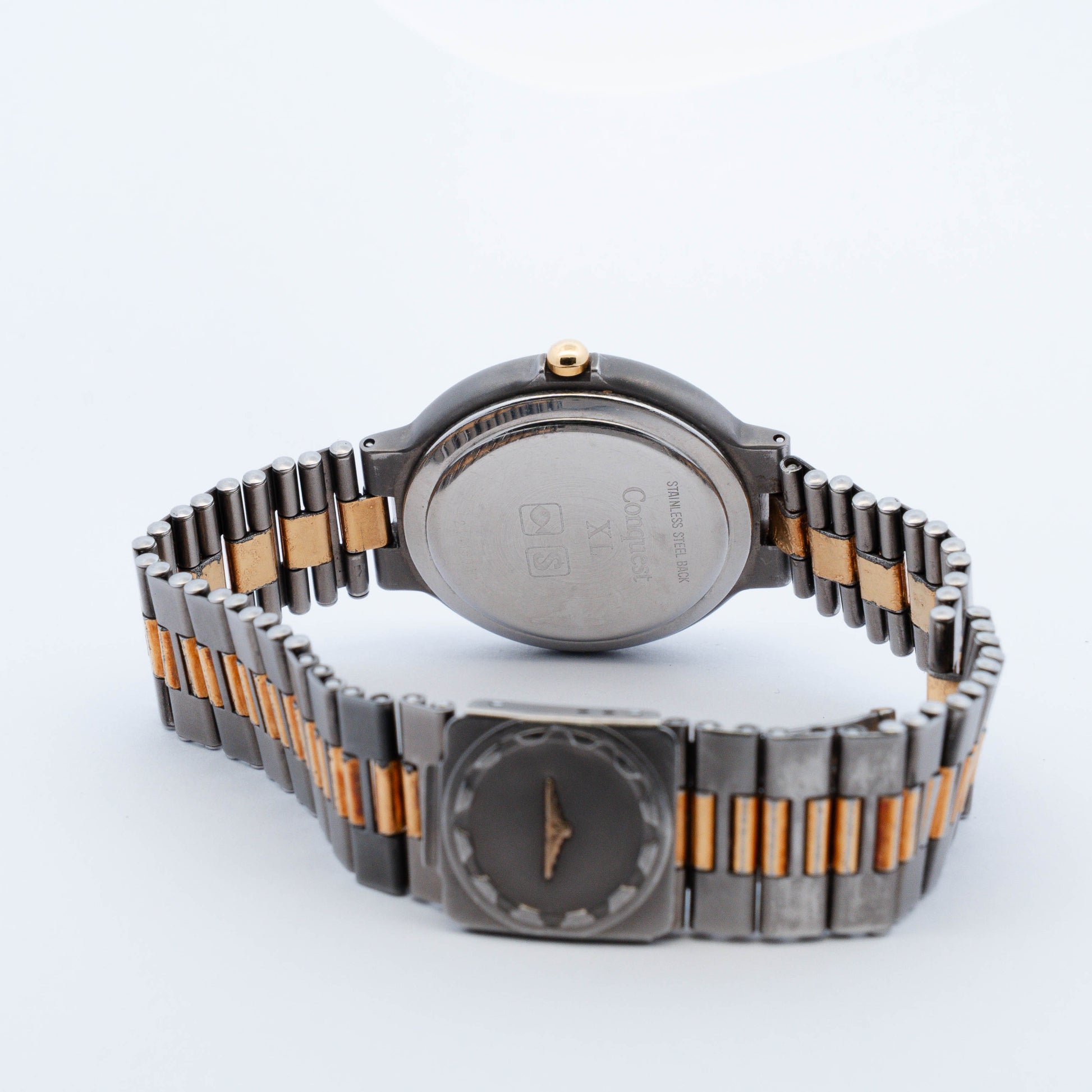 Vintage Longines Conquest V.H.P. Quartz with gold-tone dial, Roman numerals, and date at 3 o’clock. Features a gold-plated bezel, two-tone bracelet, and signed Conquest caseback.