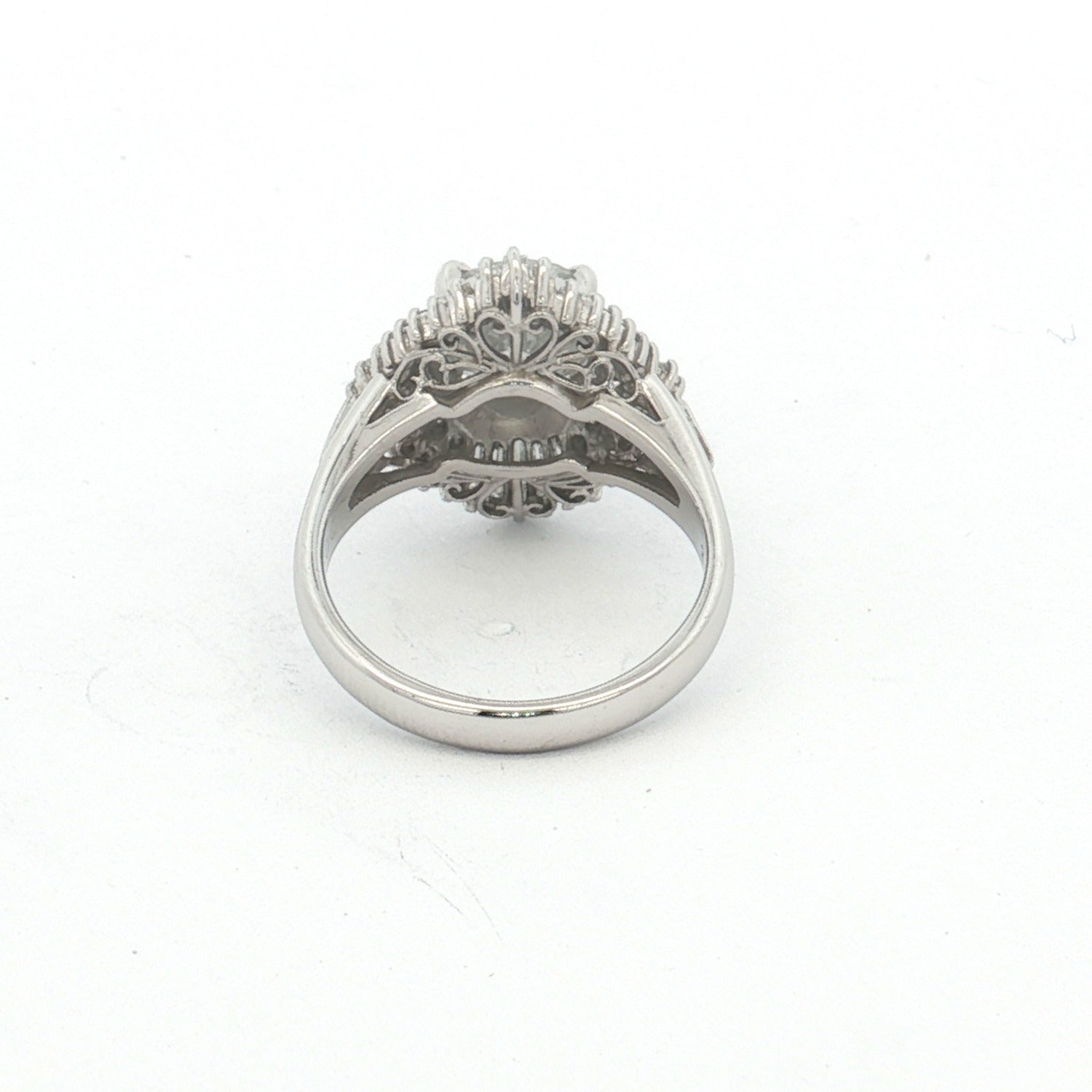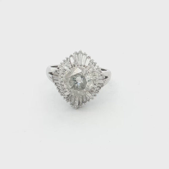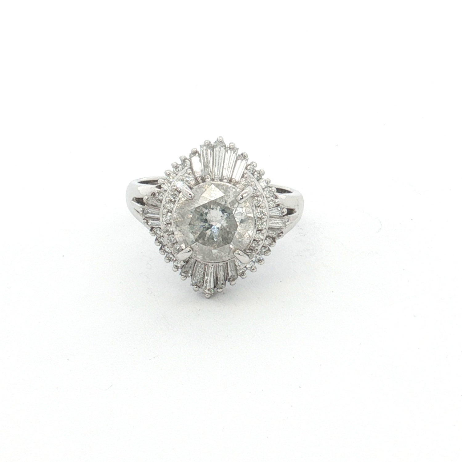 Luxurious platinum diamond cluster ring featuring a 2.04ct round brilliant diamond surrounded by baguette and round brilliant accent stones for an exquisite, statement finish.