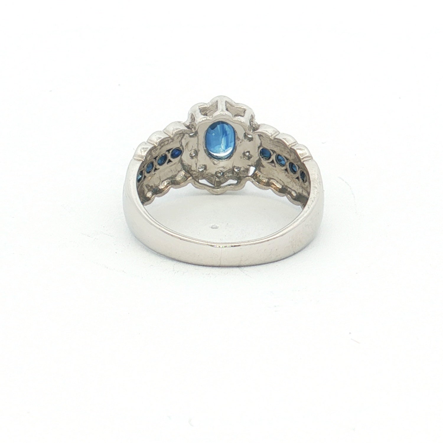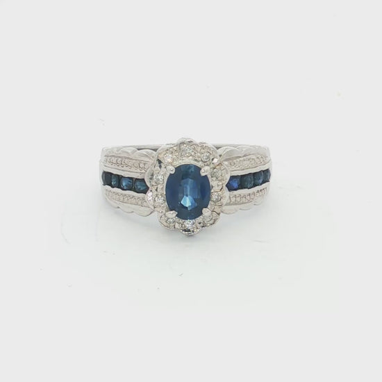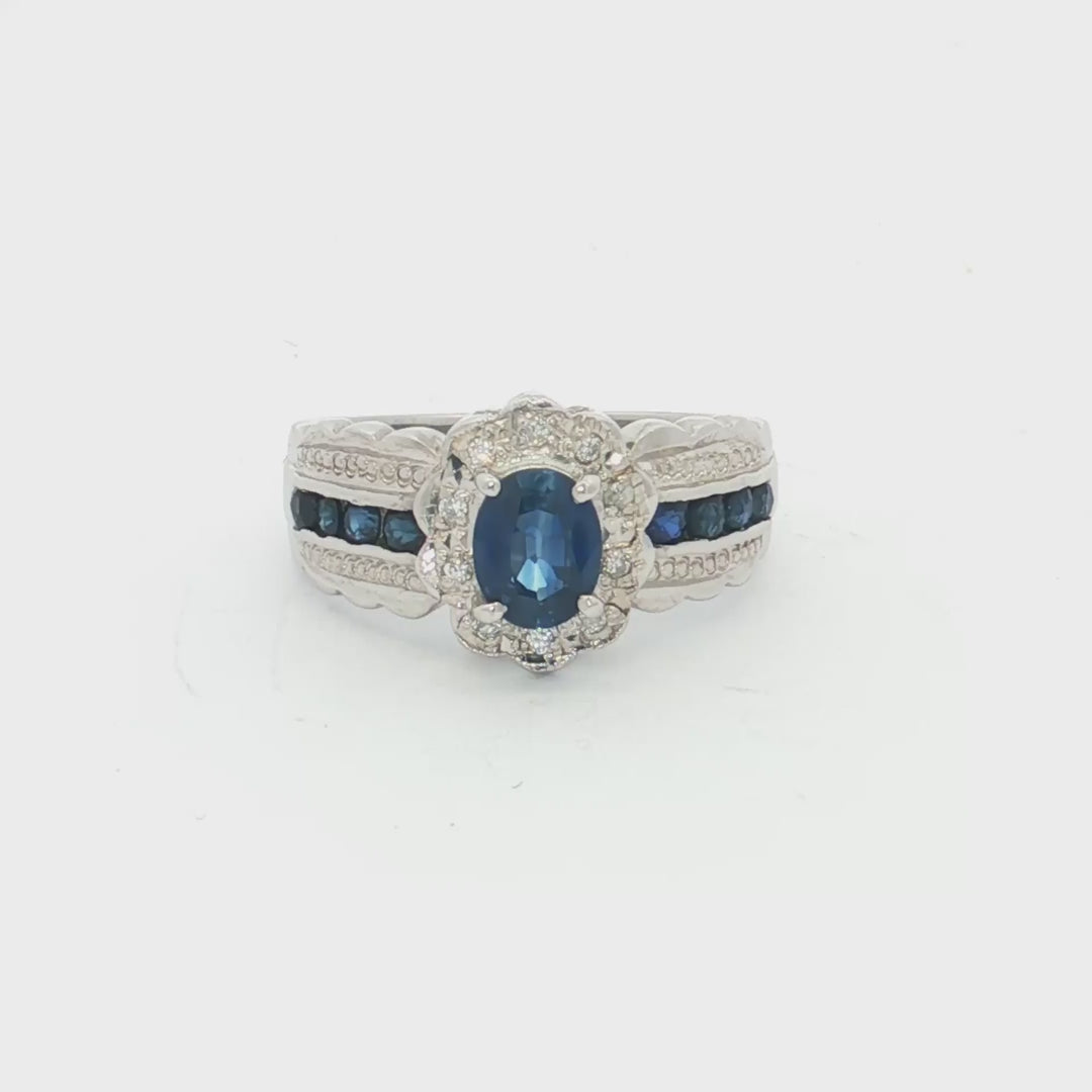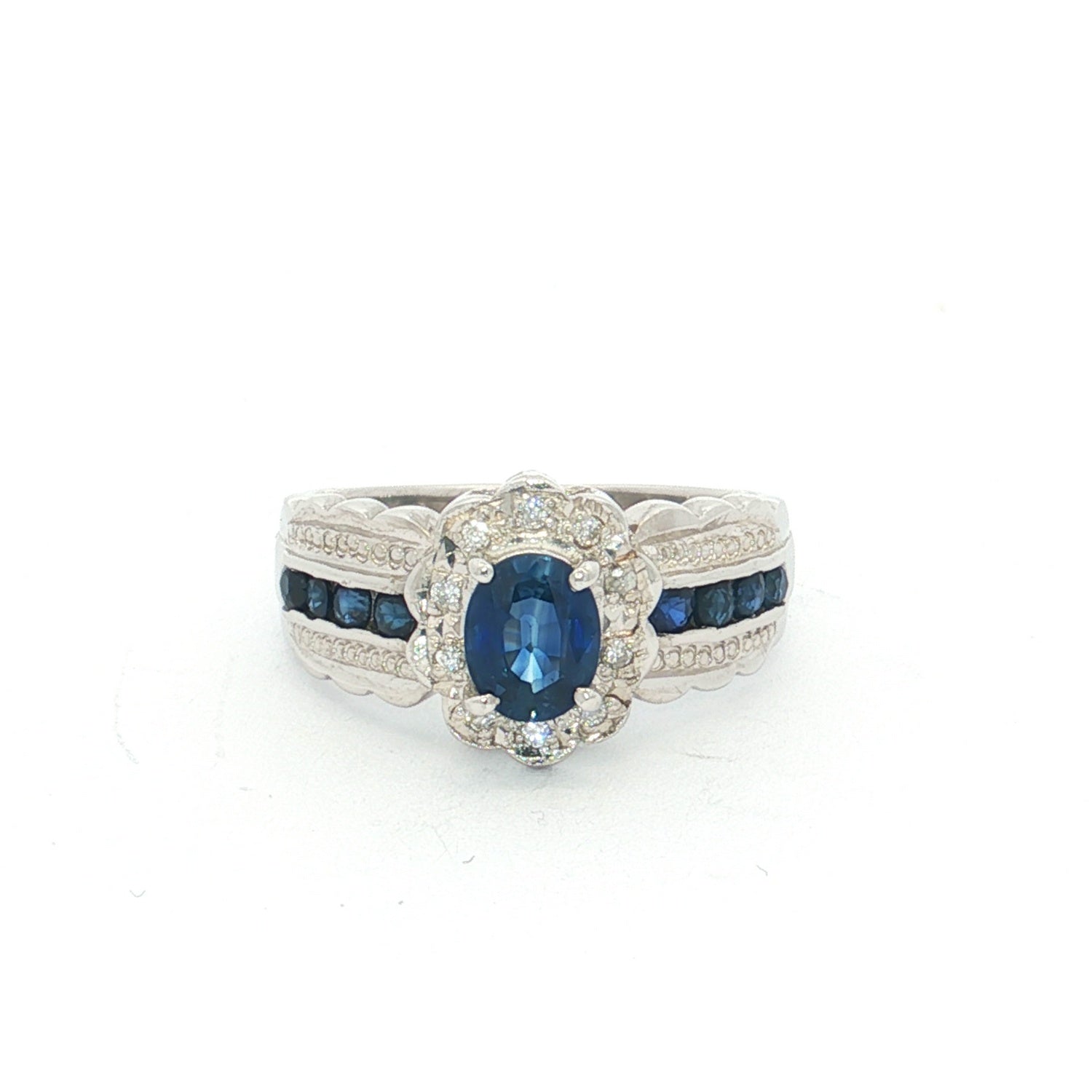 A classic platinum dress ring featuring an oval sapphire at the centre, bead-set diamond surround, and channel-set sapphire shoulders. Elegant and refined.