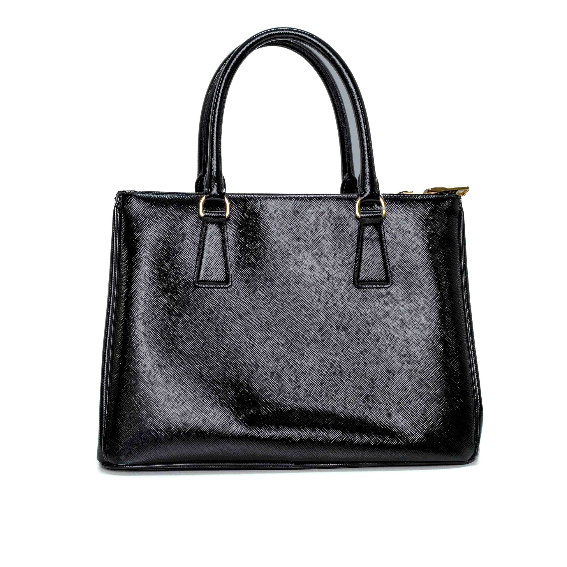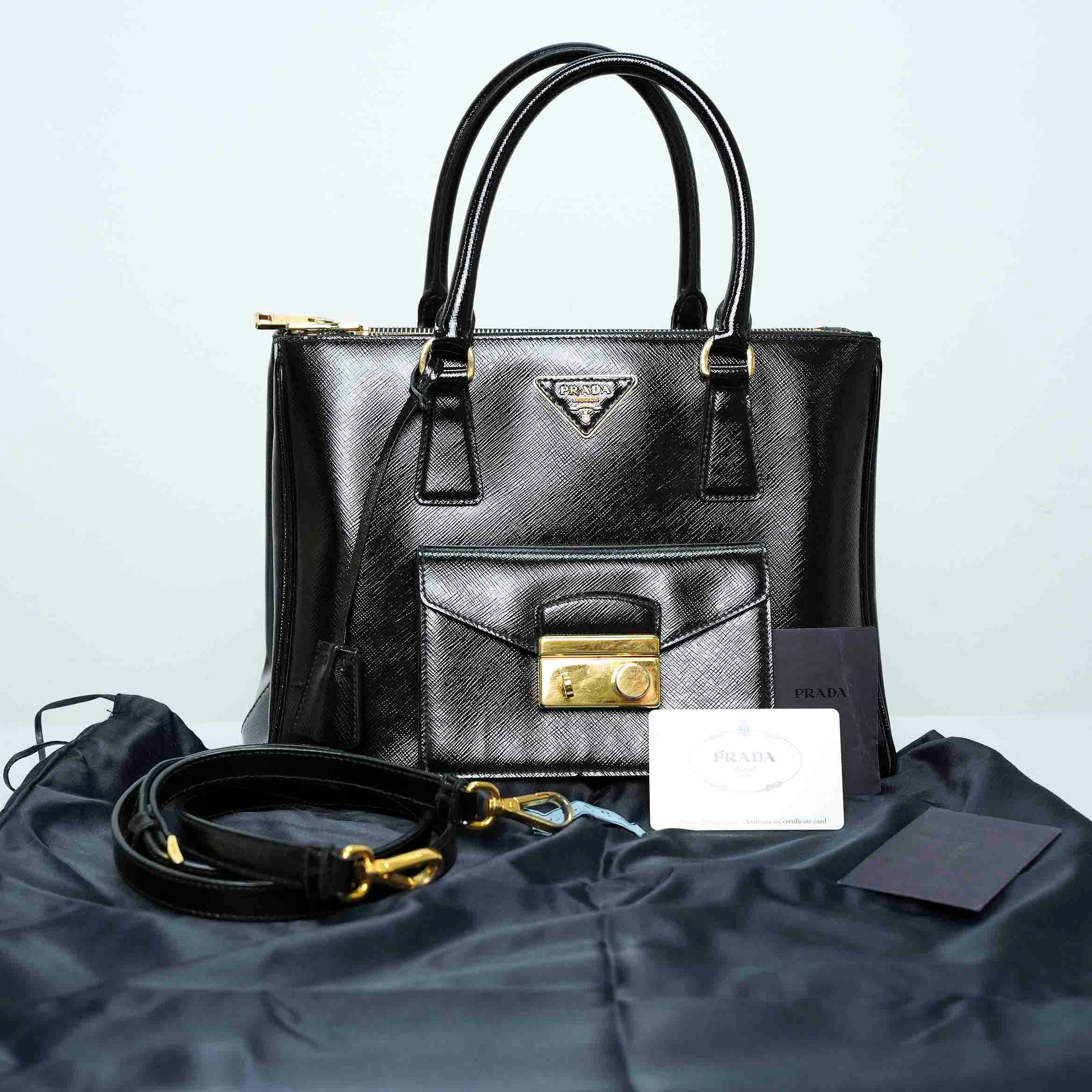 Prada Nero Saffiano Vernice Tote – Crafted from glossy textured leather with a front cargo pocket, rolled handles, and detachable strap. Spacious interior with multiple compartments, in like-new condition with inclusions.