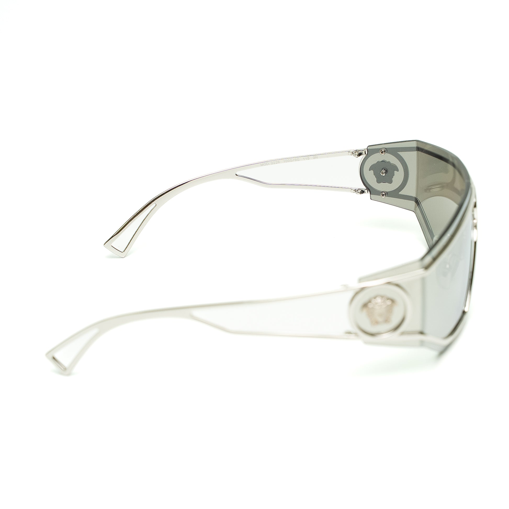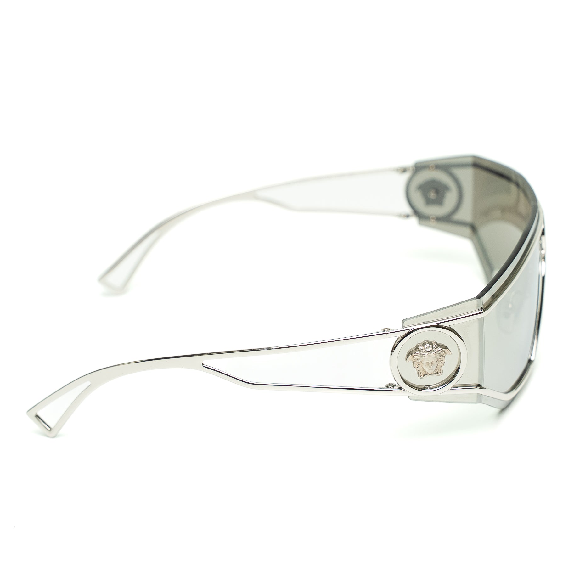 Bold Versace shield sunglasses featuring a futuristic silver frame with iconic Medusa medallions and wrap-around tinted visor lens — a standout unisex statement piece with luxury edge.