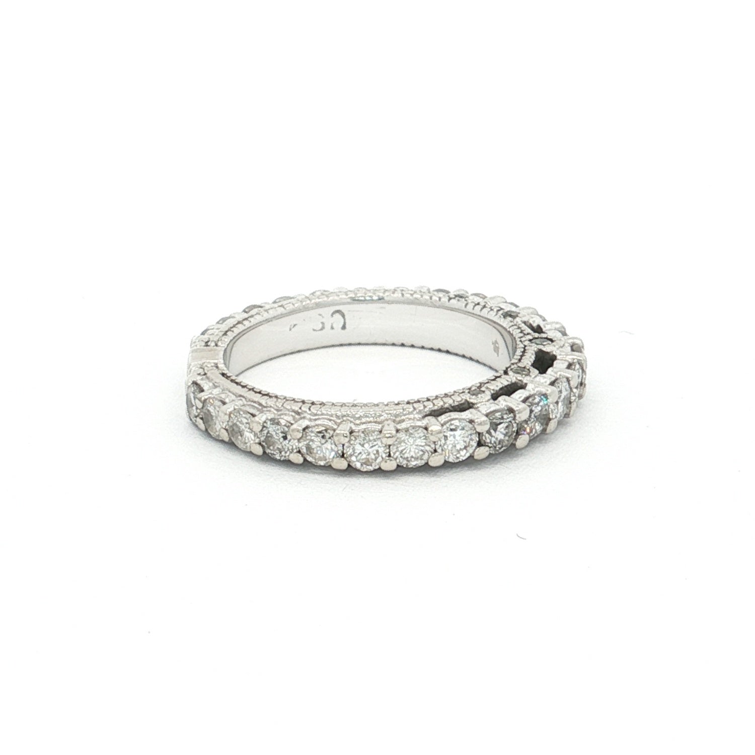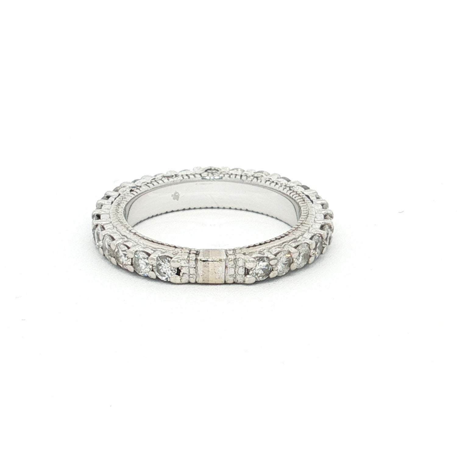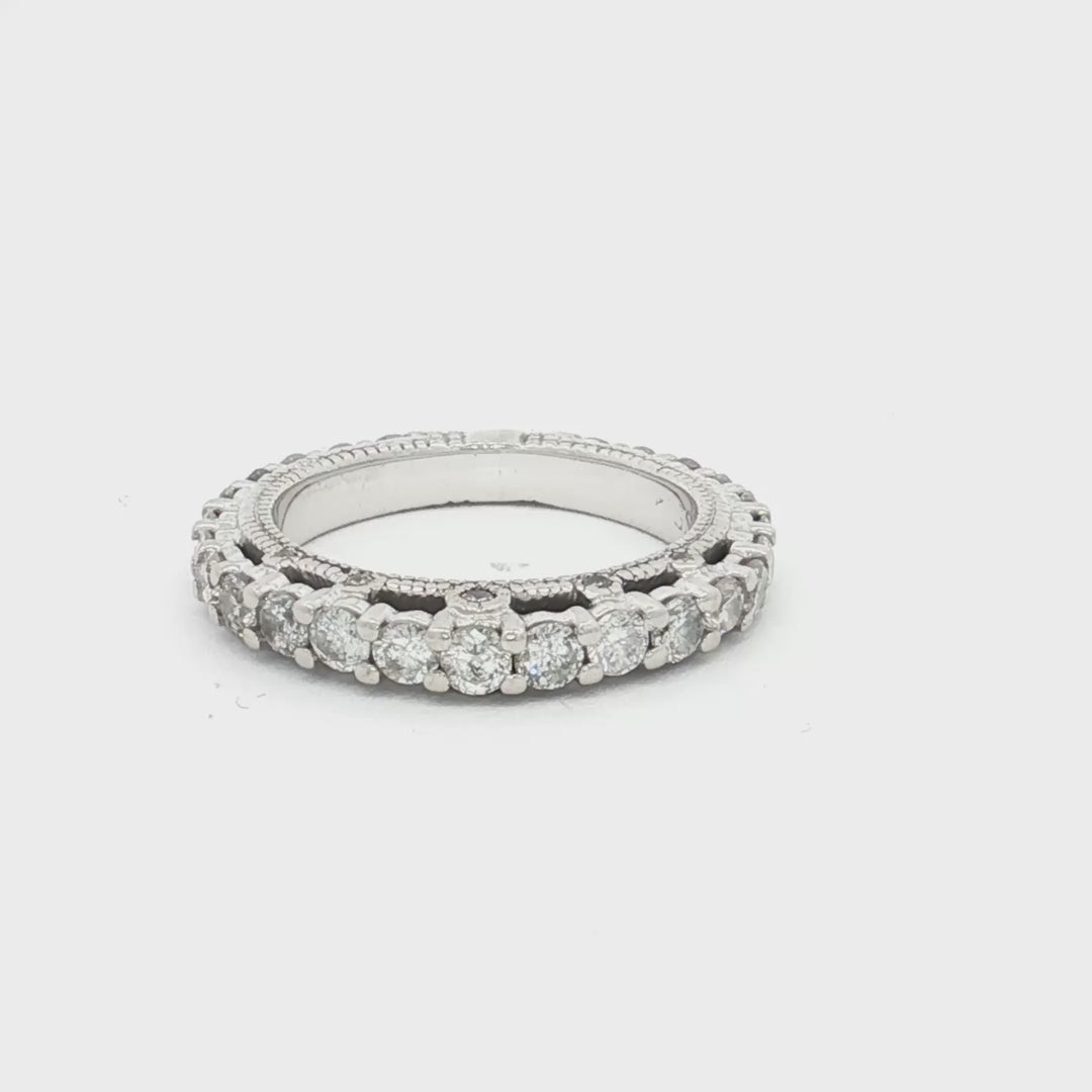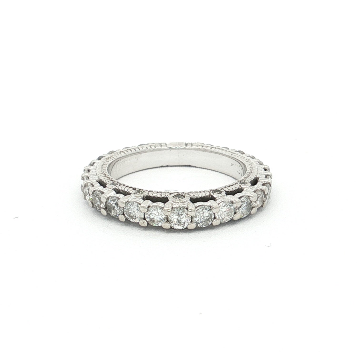 A striking 14ct white gold 35-stone diamond ring featuring shared claw-set diamonds across the band with additional grain-set diamonds in the gallery. Elegant and timeless.
