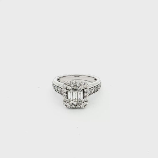 A striking 9ct white gold ring featuring a rectangular cluster of baguette and round brilliant-cut diamonds, surrounded by diamond-set shoulders for a bold, elegant sparkle.