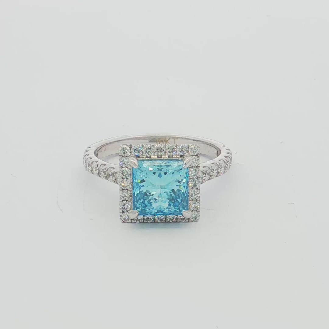 A magnificent 18ct white gold ring centred with a lab-grown Fancy Intense Blue princess-cut diamond, framed by a brilliant halo and shoulders set with sparkling colourless diamonds.