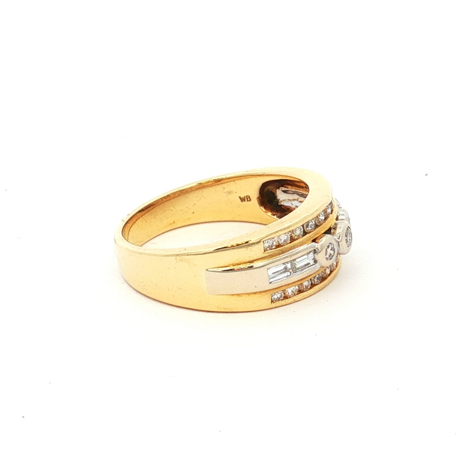 A bold 18ct yellow gold 29-stone diamond ring combining multiple diamond shapes and settings for a striking yet elegant appearance. This substantial piece offers a beautiful balance of sparkle and craftsmanship, suitable for special occasions or refined daily wear.