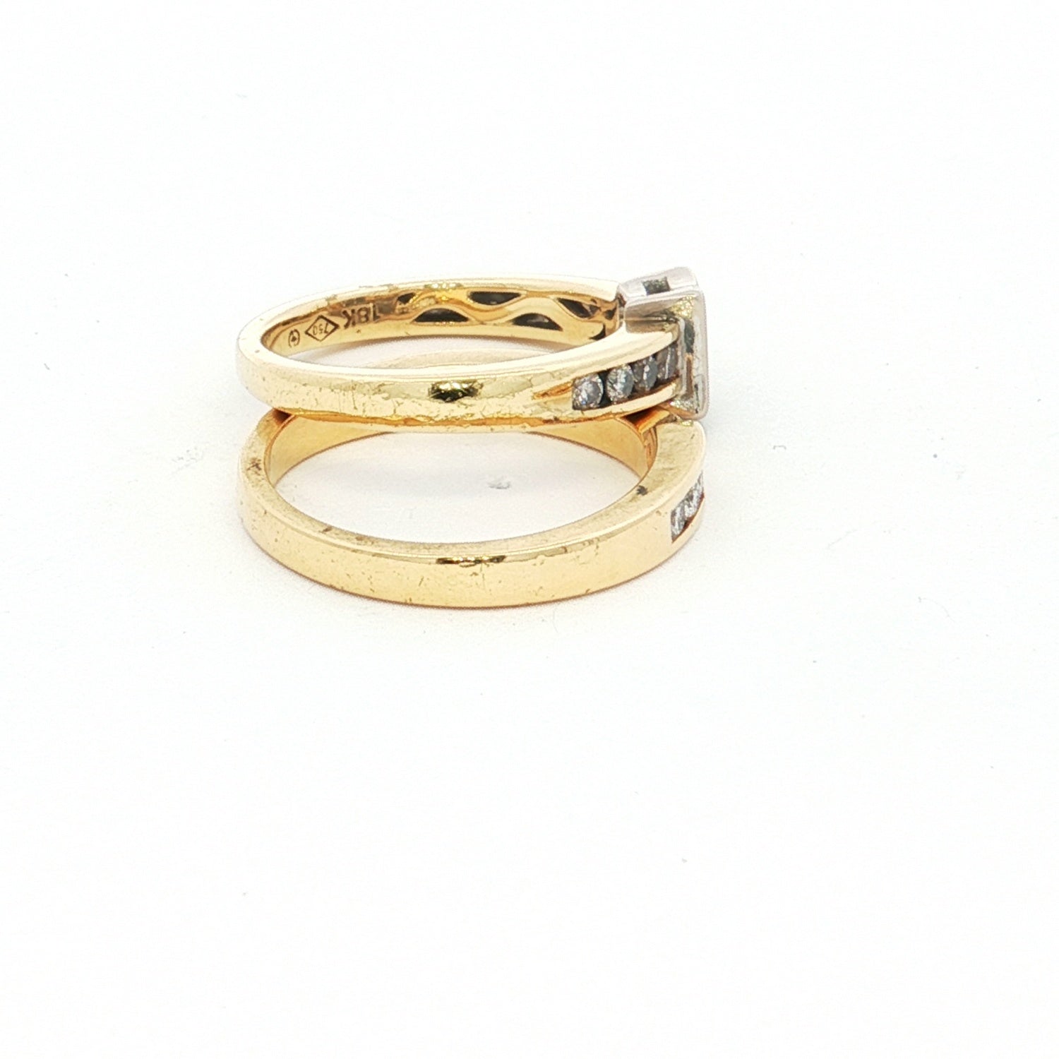 An 18ct yellow and white gold two-ring set featuring princess-cut diamonds invisibly set in a white gold square mount, accented by round brilliant-cut diamonds channel set in yellow gold tapered bands.