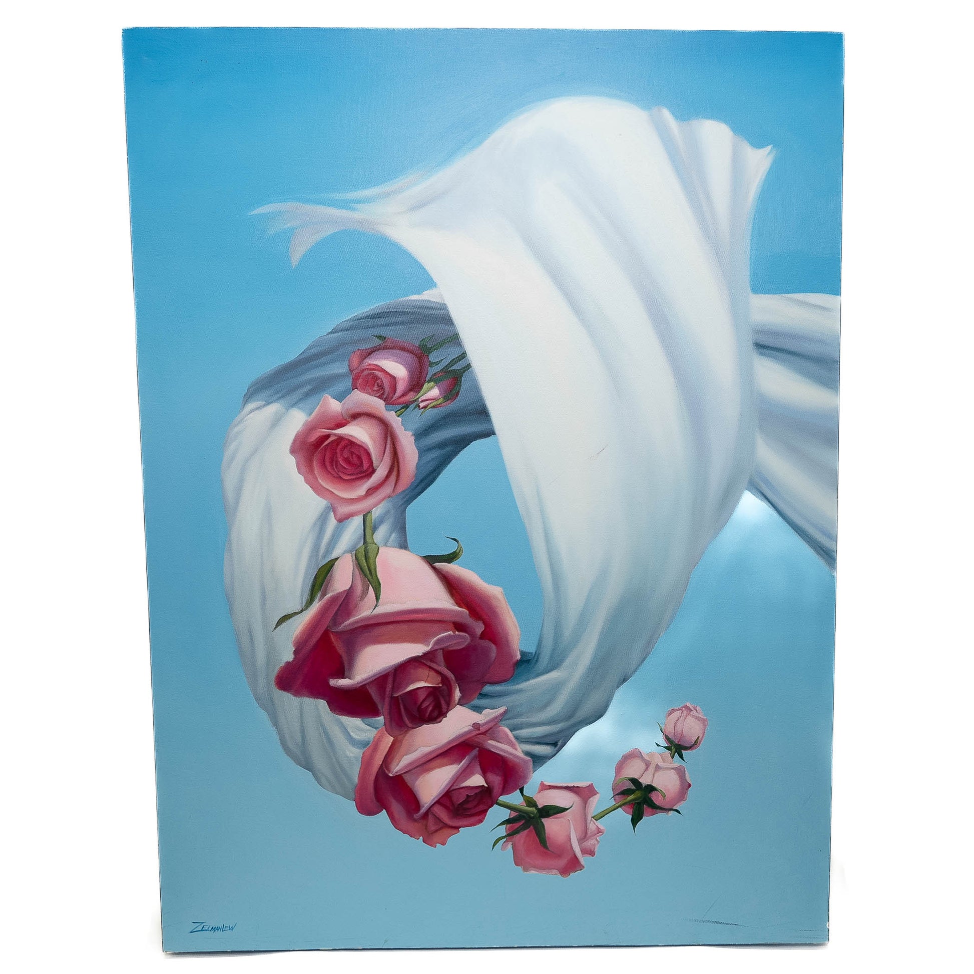 Original Zelman Lew painting “Love Lifts Us Up,” an elegant surreal composition featuring rose blooms carried by flowing white fabric against a clear blue sky. Painted in oil on canvas, this piece showcases Lew’s refined realism and gentle movement.
