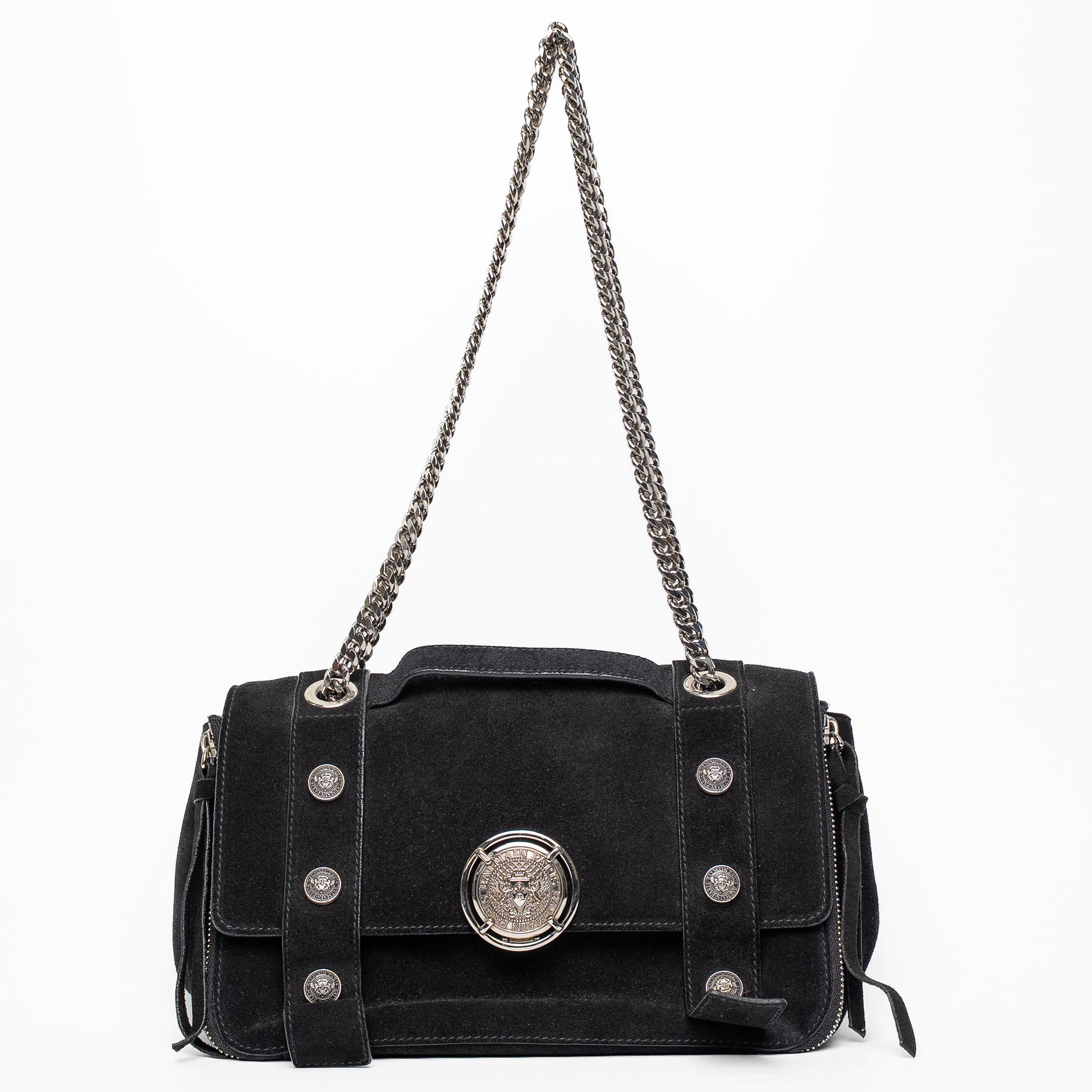 Statement Balmain suede shoulder bag with medallion clasp and chain strap.