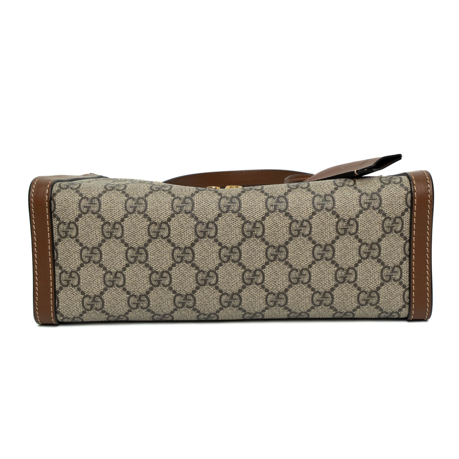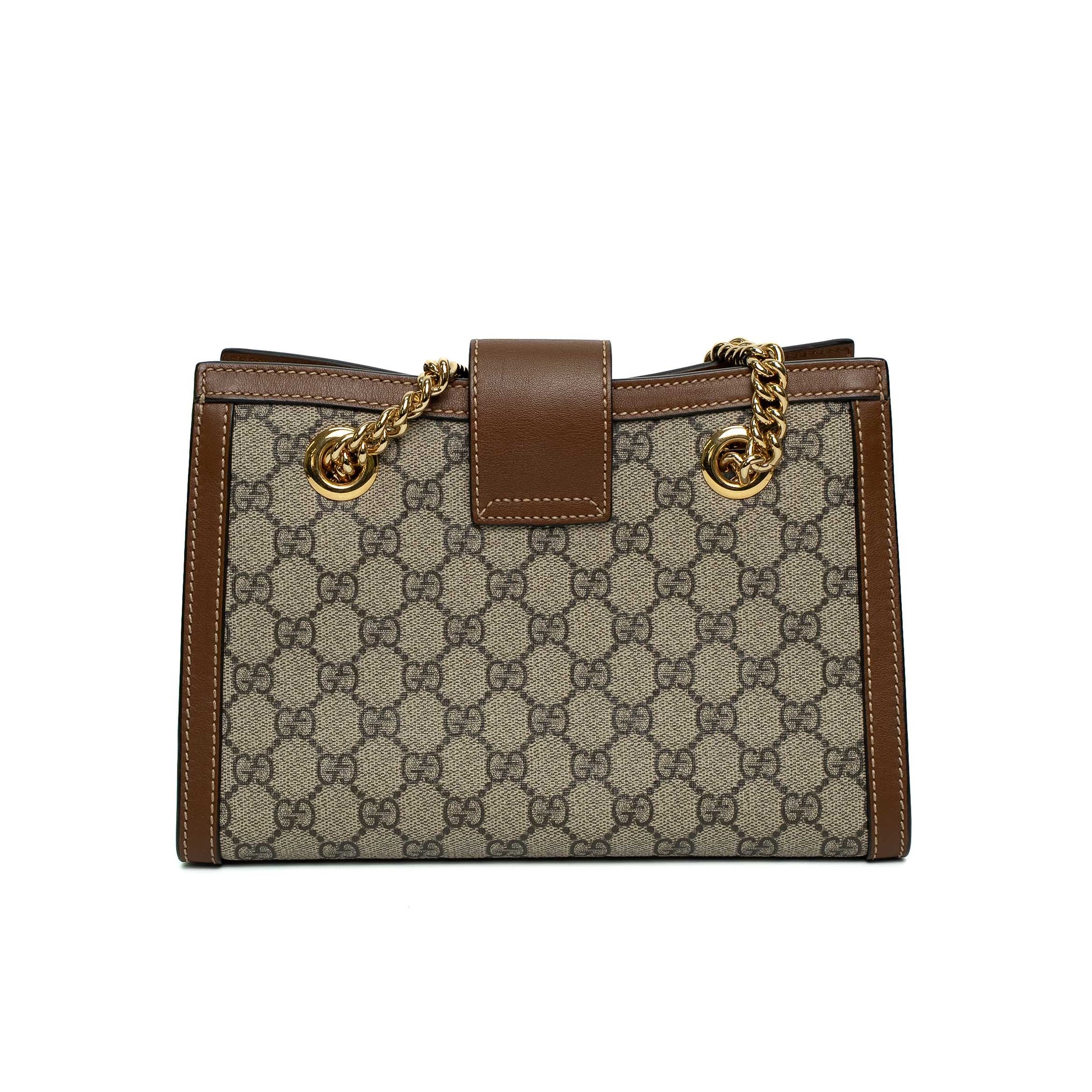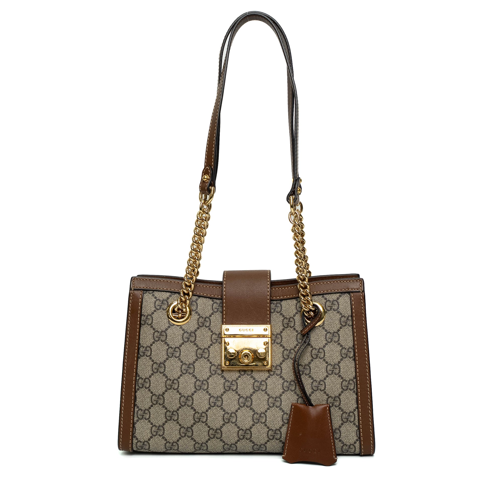 Classic Gucci Padlock bag in GG Supreme canvas with leather trim, gold-tone hardware and structured shoulder silhouette.
