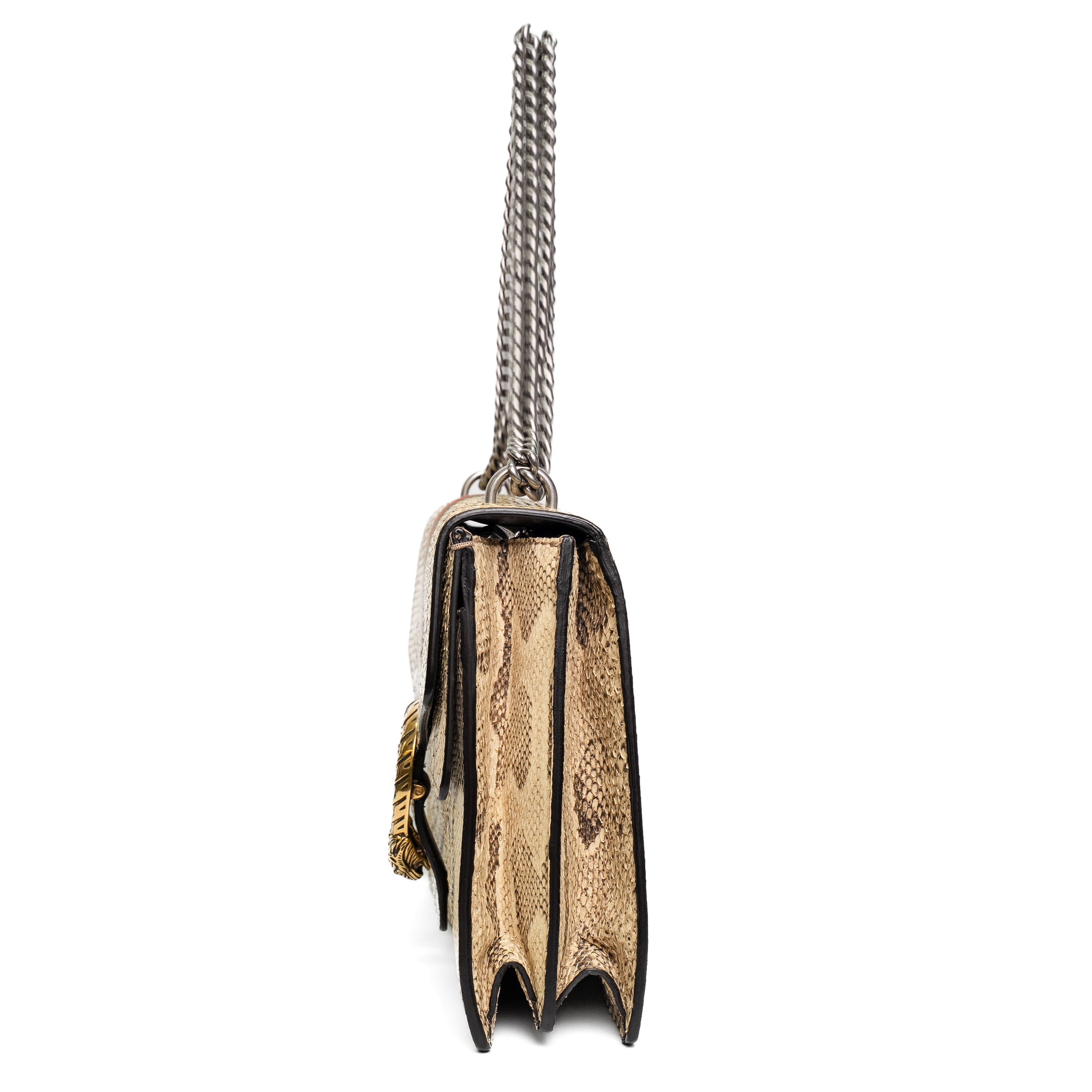 A striking Gucci Dionysus shoulder bag crafted in luxurious beige python leather featuring the iconic tiger head closure.