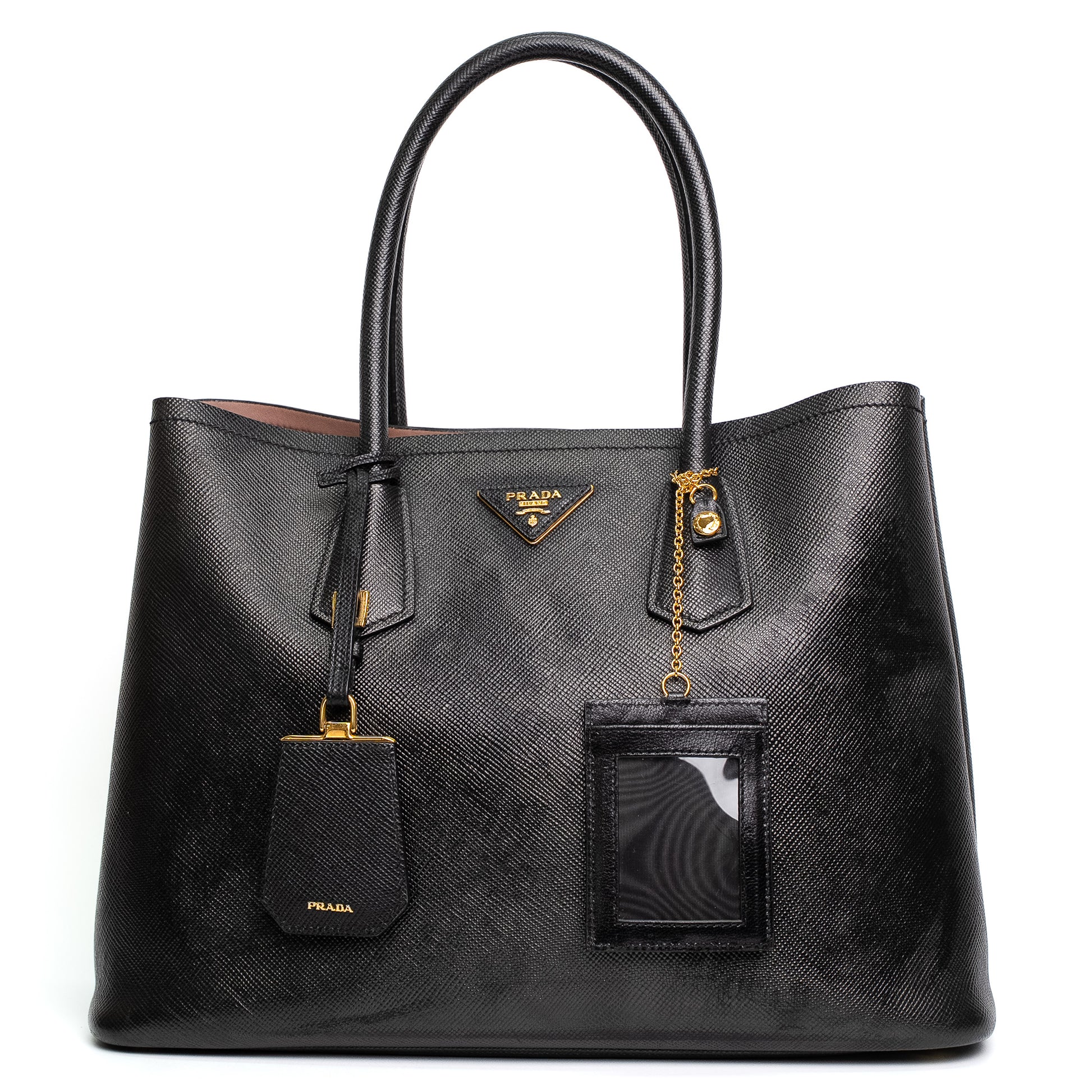 • Branding: Prada triangle logo, embossed handle branding