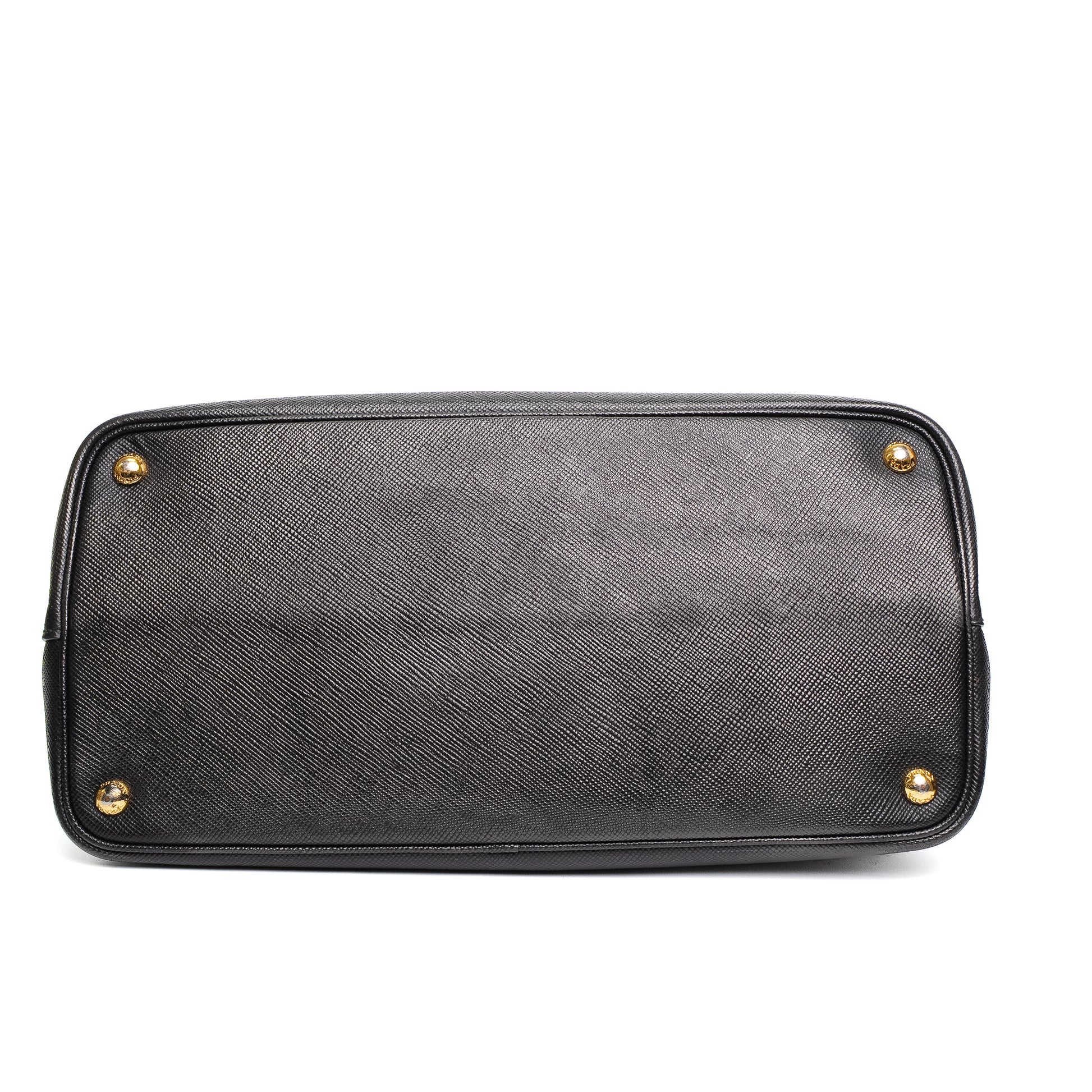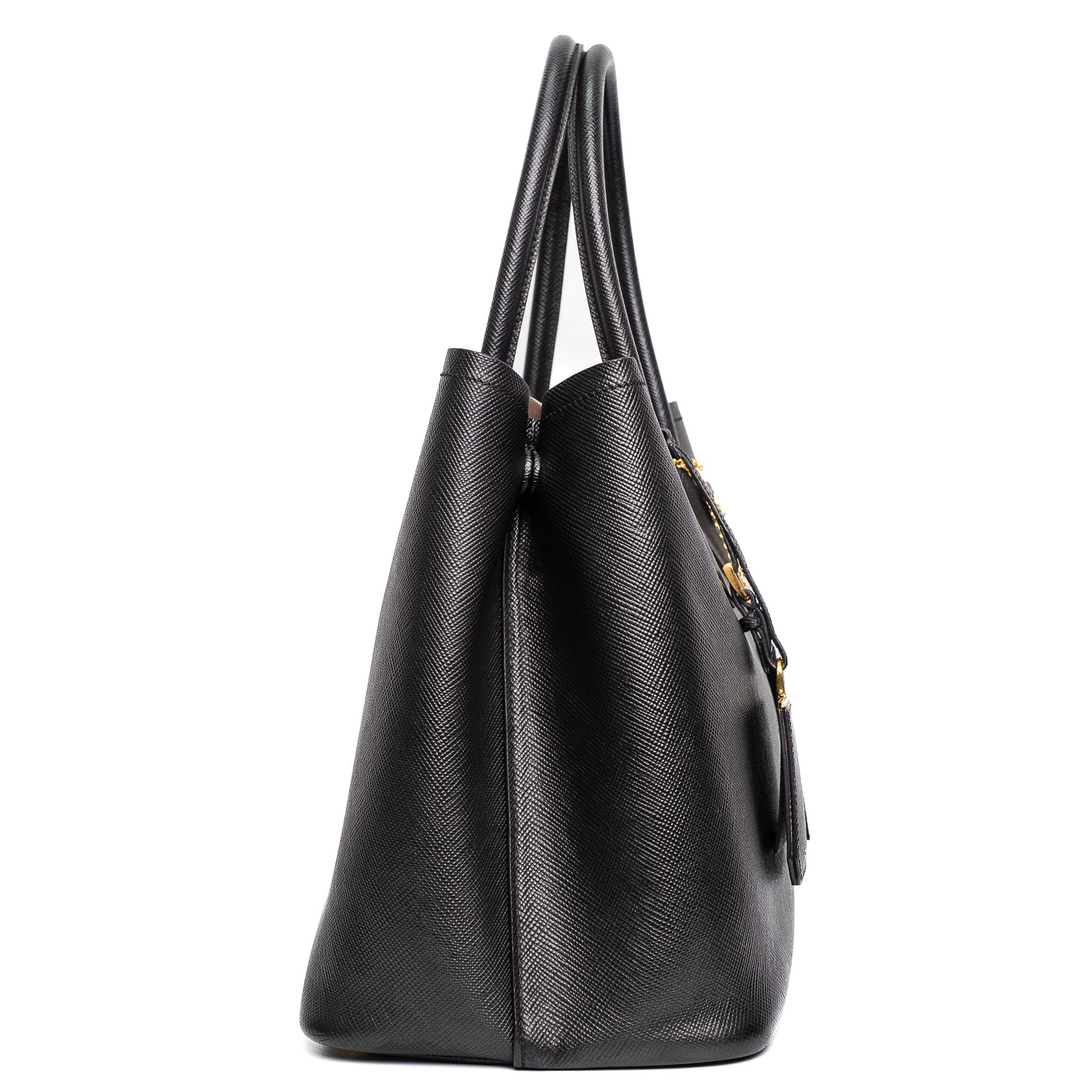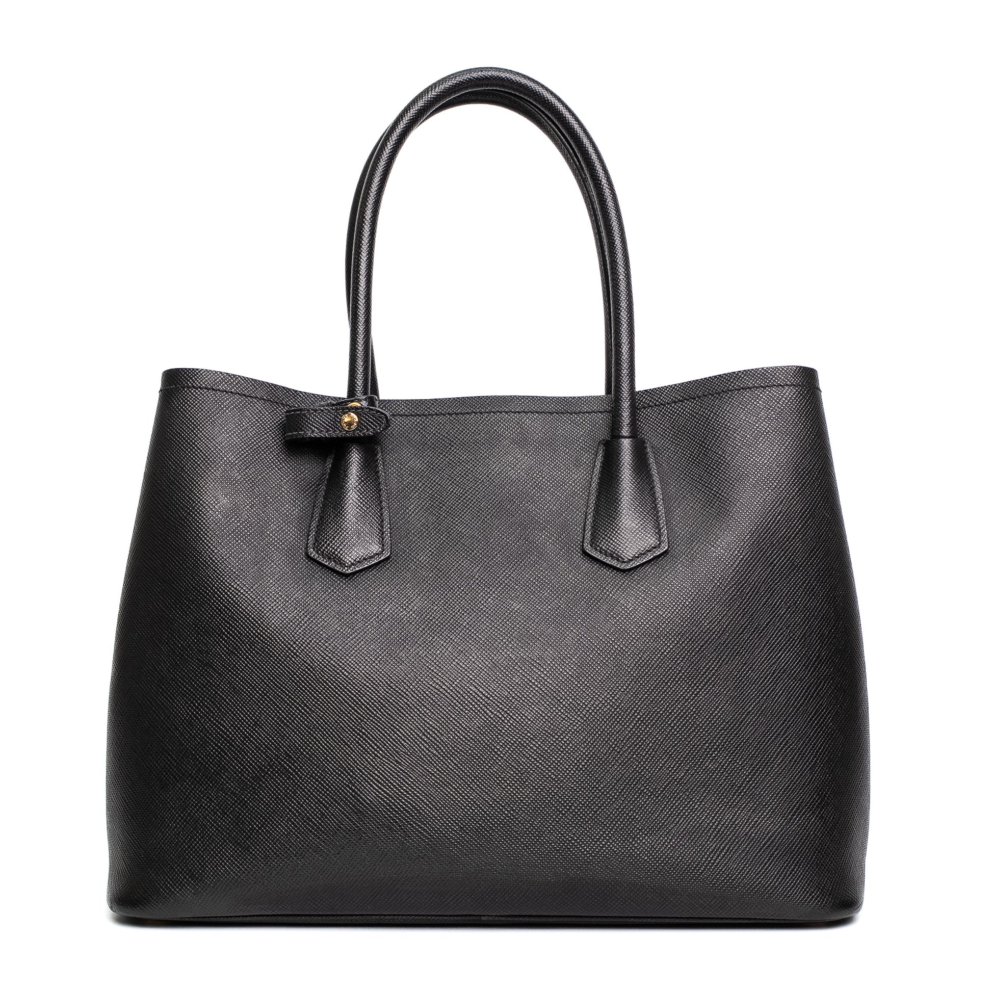 Structured saffiano leather tote with elegant gold hardware and classic Prada detailing.