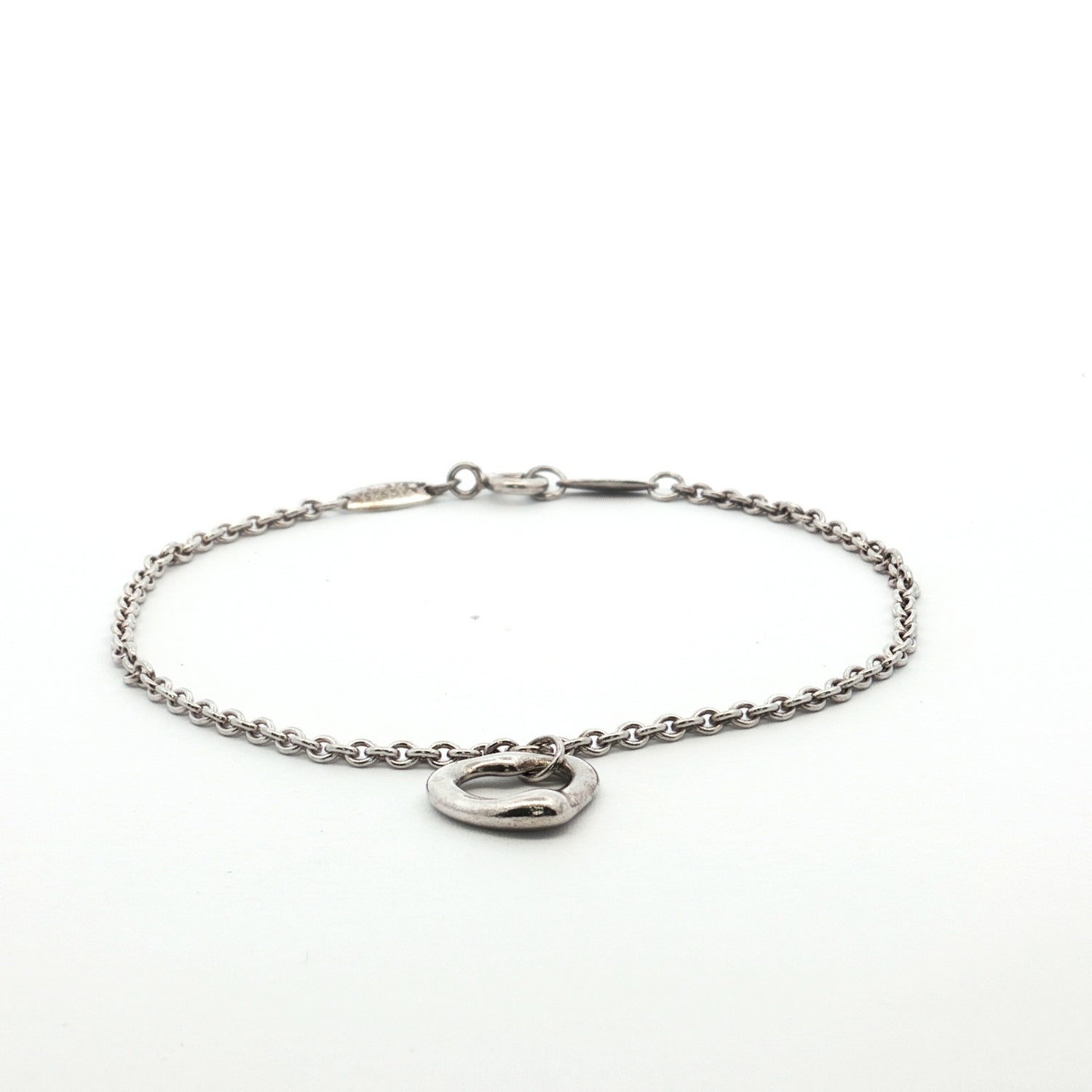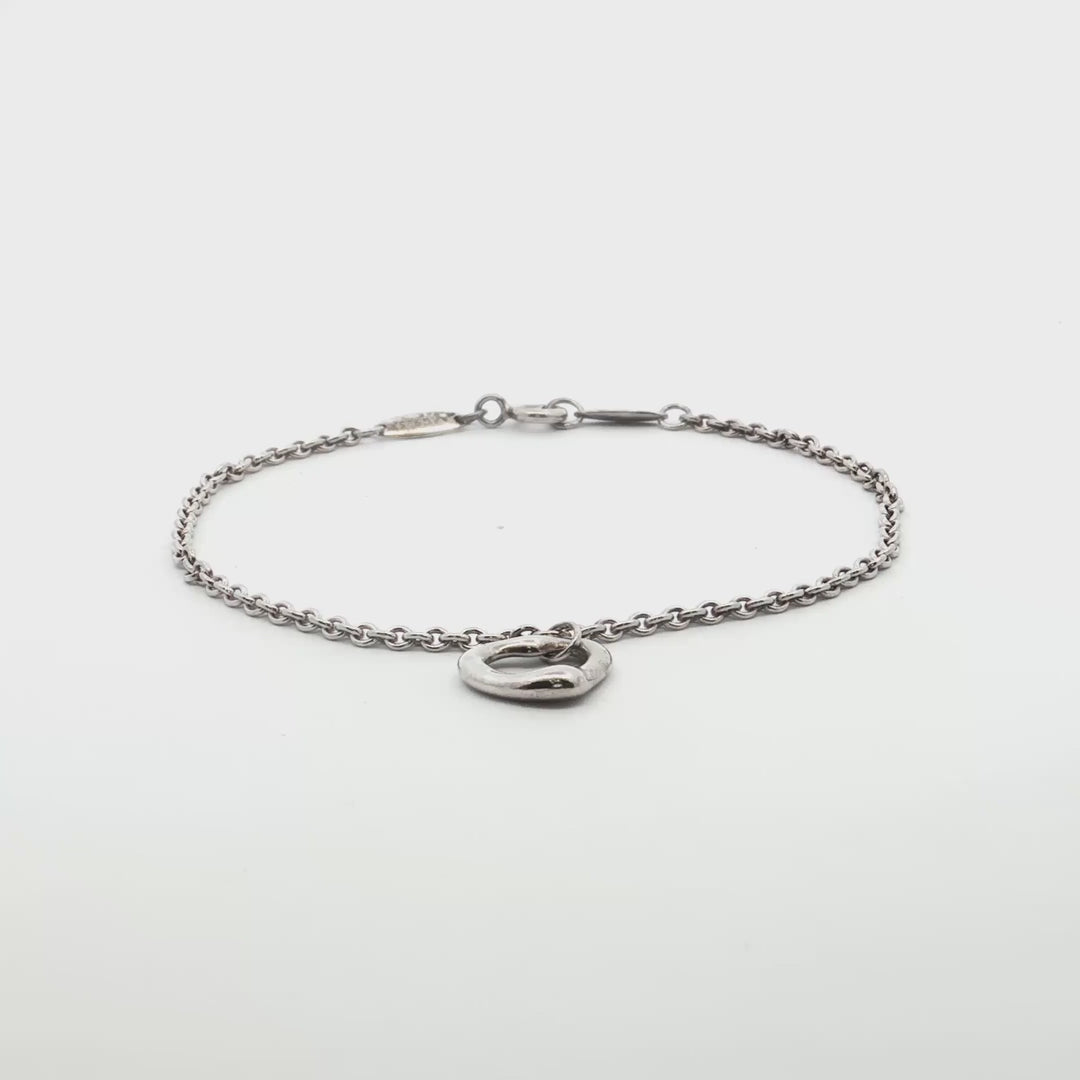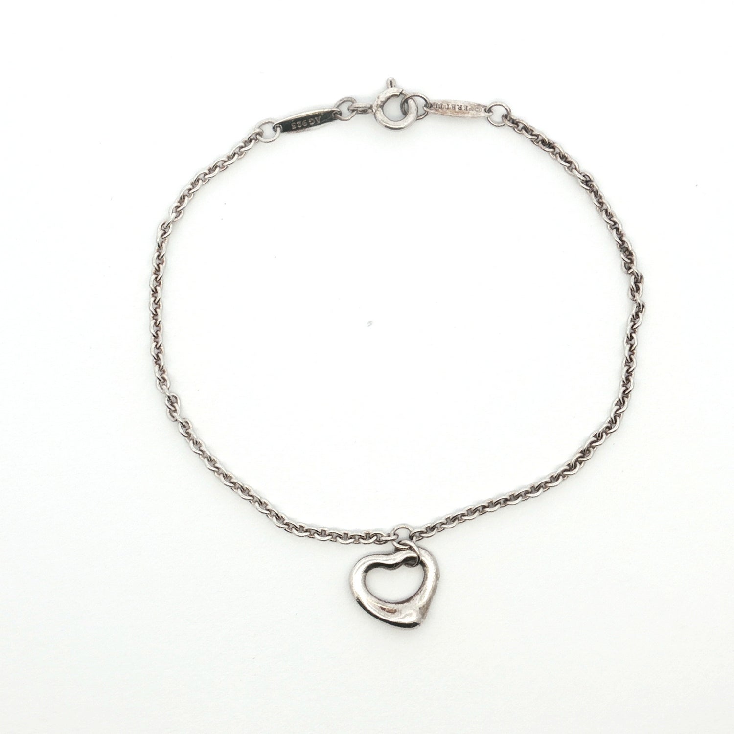 Delicate Tiffany & Co. chain bracelet featuring Elsa Peretti’s iconic open-heart charm in polished sterling silver.