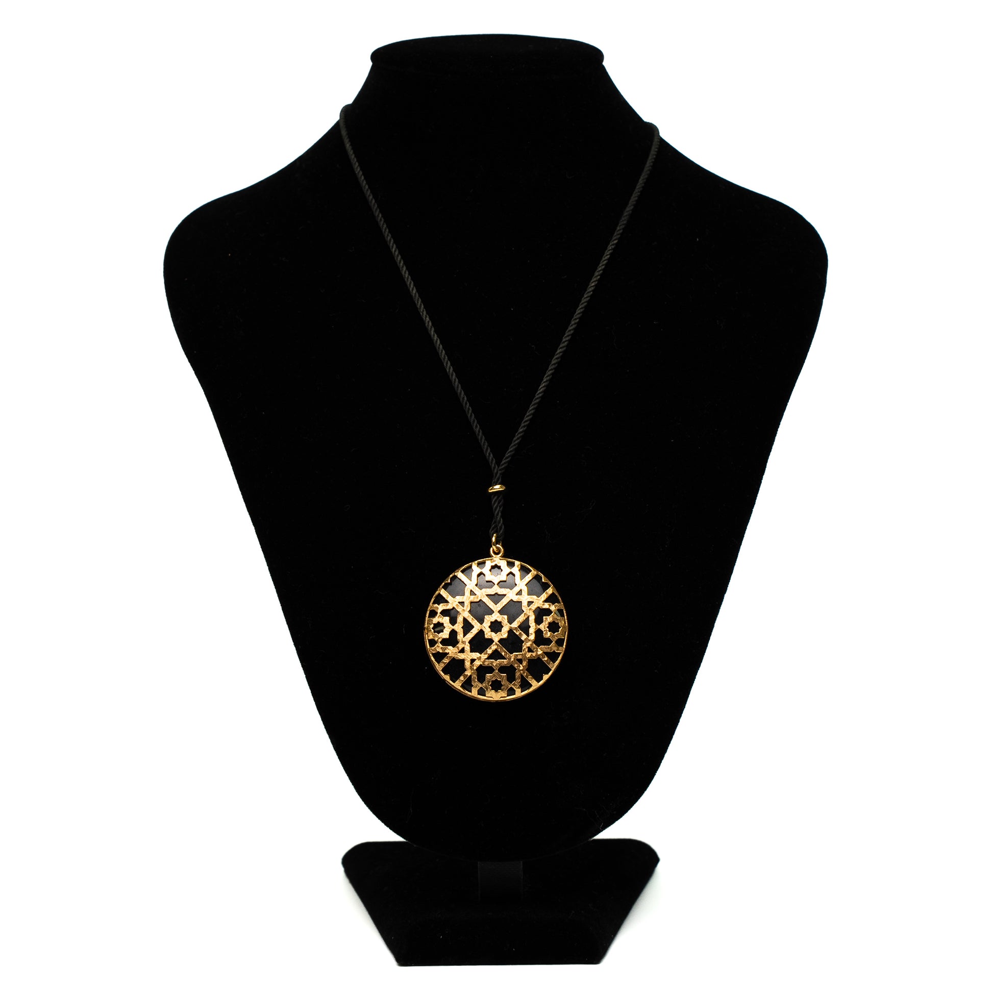 Crafted by the renowned Tiffany & Co., this exquisite Picasso Marrakesh pendant necklace embodies timeless luxury and artistry. Featuring a rich black onyx disc adorned with an 18K yellow gold floral lattice motif, it reflects Paloma Picasso’s signature Marrakesh design. The pendant hangs from a sophisticated black cord necklace with gold fittings, offering a blend of bold style and understated elegance. A true collector’s piece signed by Tiffany & Co.
