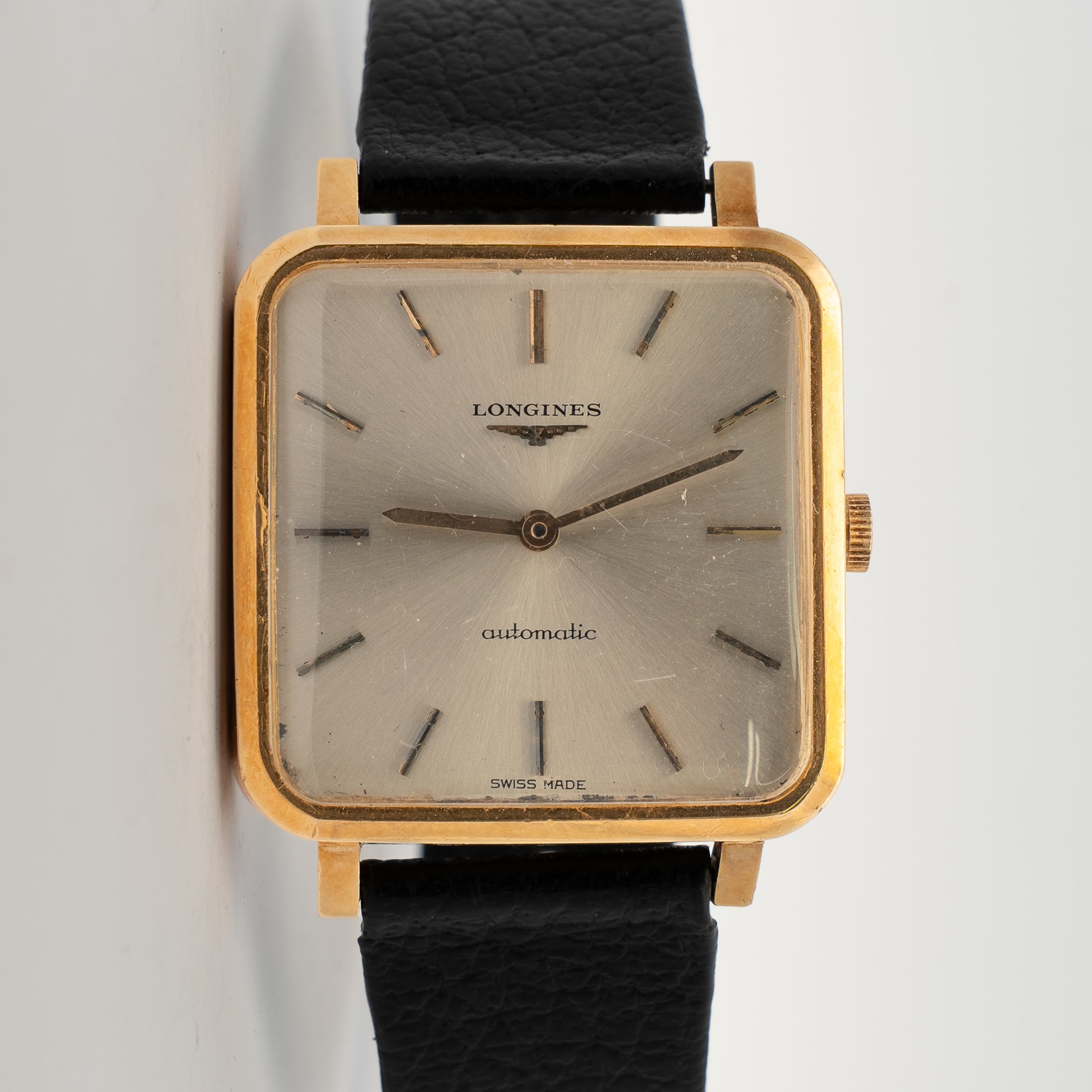 Elegant and timeless, this vintage Longines automatic features an 18ct solid gold square case paired with a clean silver sunburst dial. Its minimalist design captures the understated sophistication of the 1960s–1970s era, complemented by a classic black leather strap.