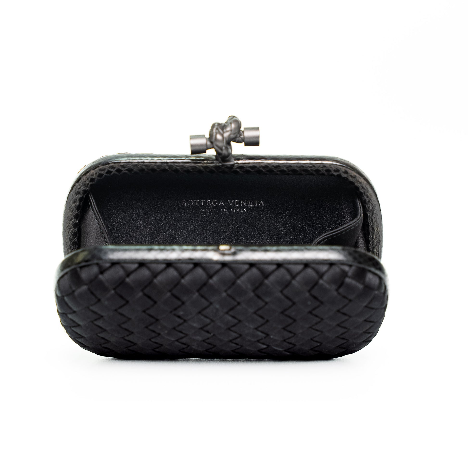 A signature Bottega Veneta evening clutch featuring the iconic woven Intrecciato design, finished with sleek snakeskin trim and the signature knot clasp. A timeless and elegant piece for formal occasions.