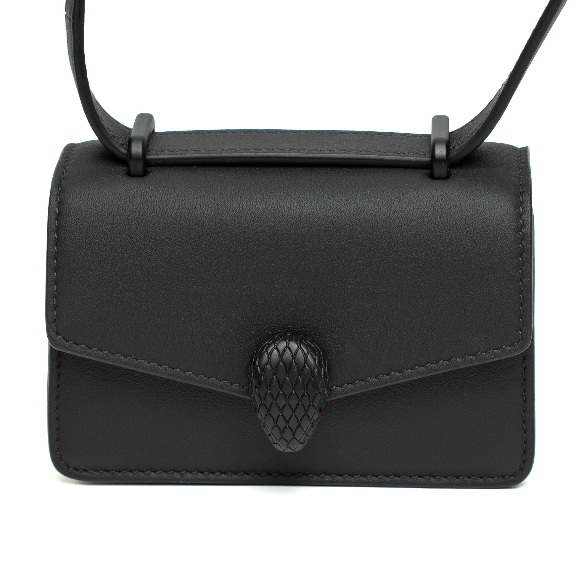 Iconic Bvlgari Serpenti Forever nano bag in black calf leather with signature snakehead magnetic closure.