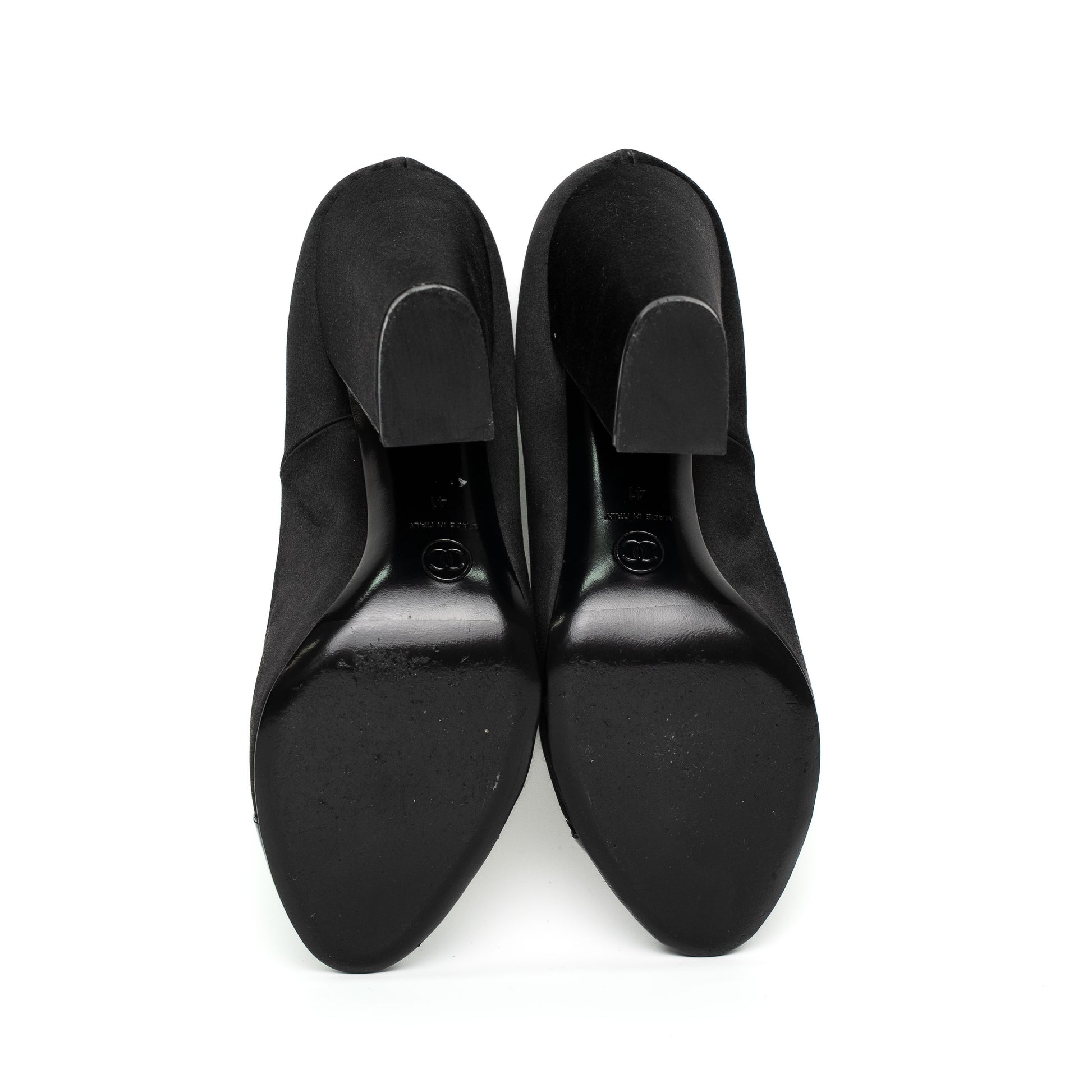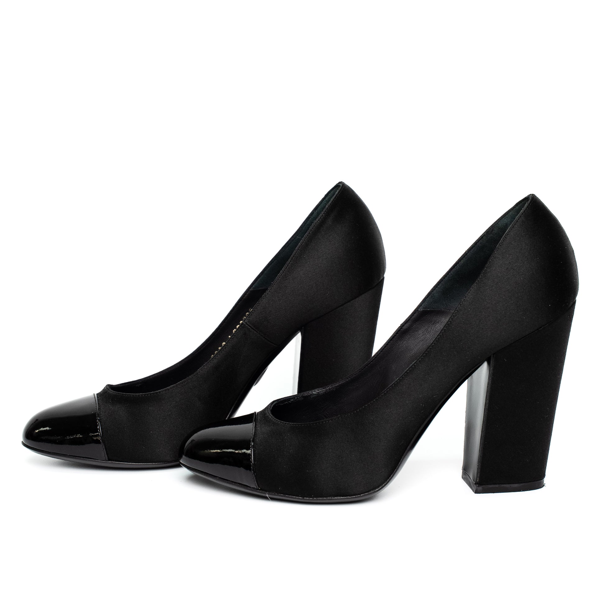 Chanel Black Satin Patent Cap Toe Heels
