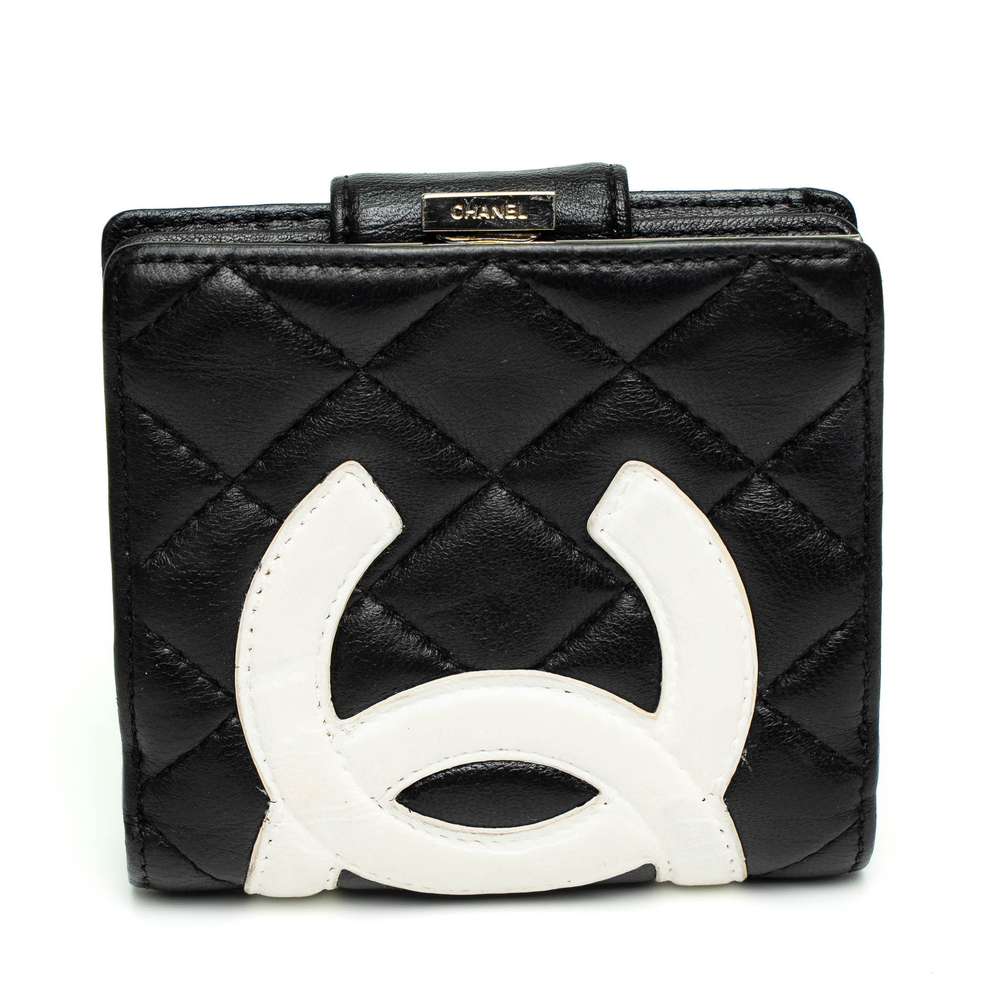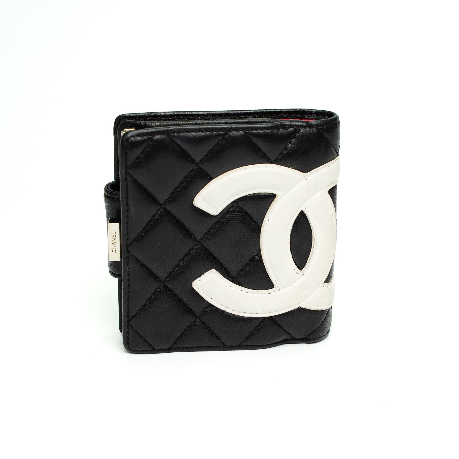 Iconic Chanel Cambon Ligne bi-fold wallet crafted in black quilted calfskin leather with contrasting white interlocking CC logo and pink interior — a perfect balance of elegance and everyday utility.