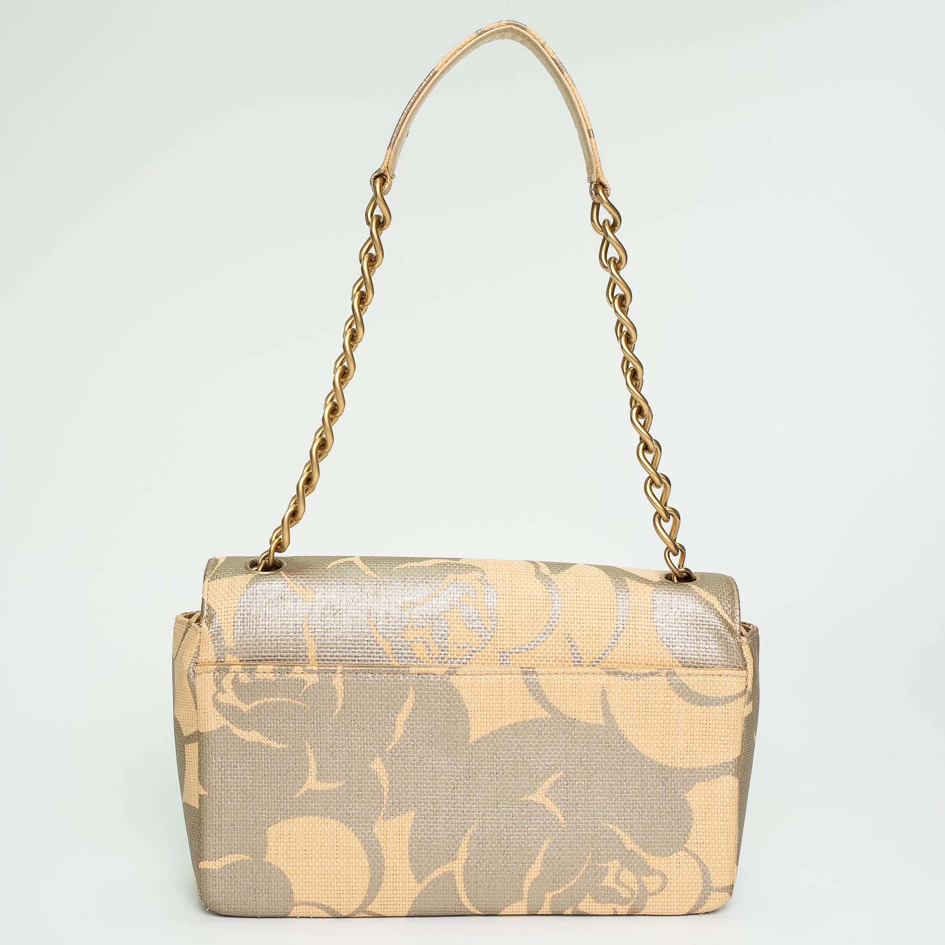 A rare and elegant Chanel creation featuring the iconic Camellia floral pattern in soft metallic gold and cream raffia. Designed with interwoven leather-and-chain shoulder straps, the piece exudes effortless sophistication while maintaining Chanel’s timeless charm.