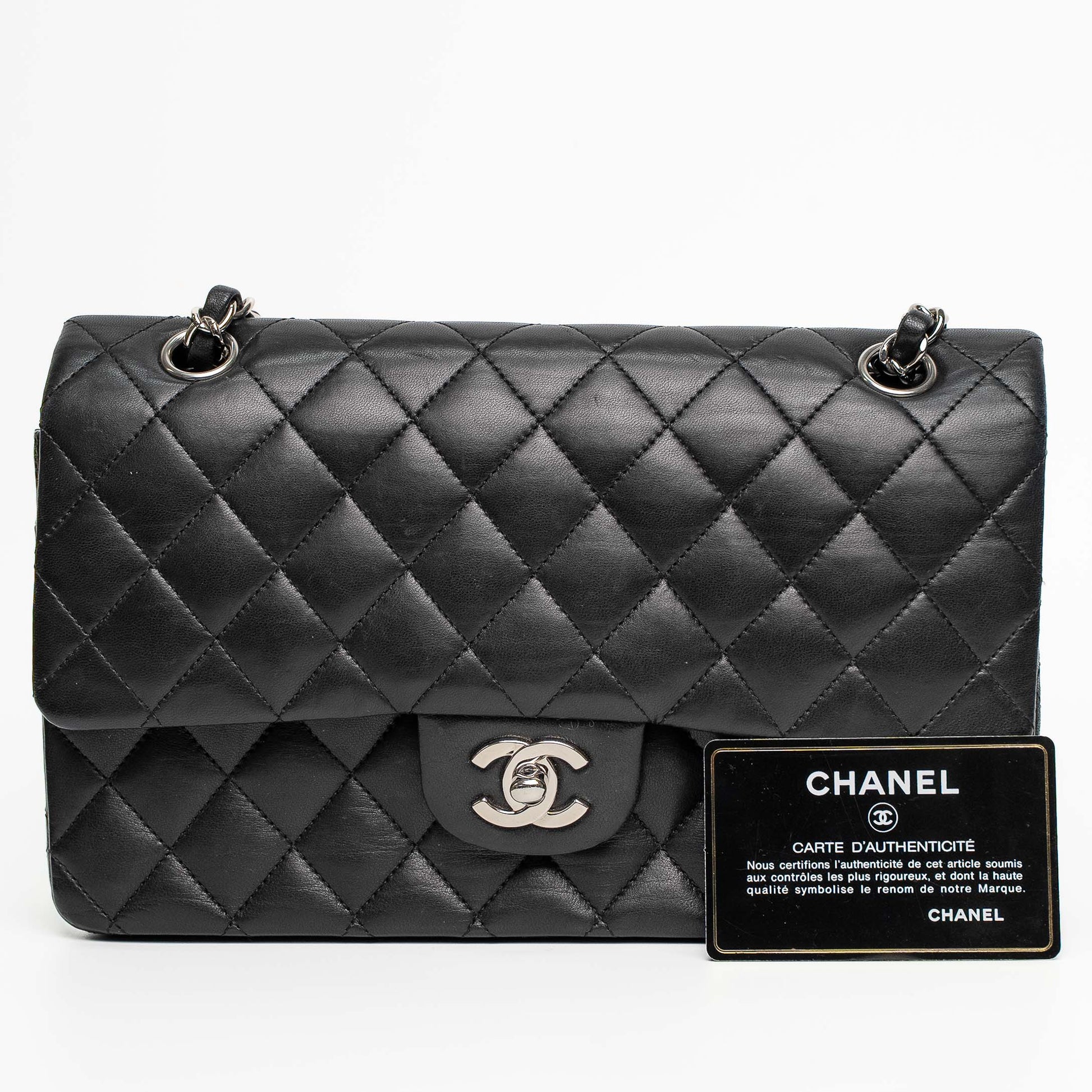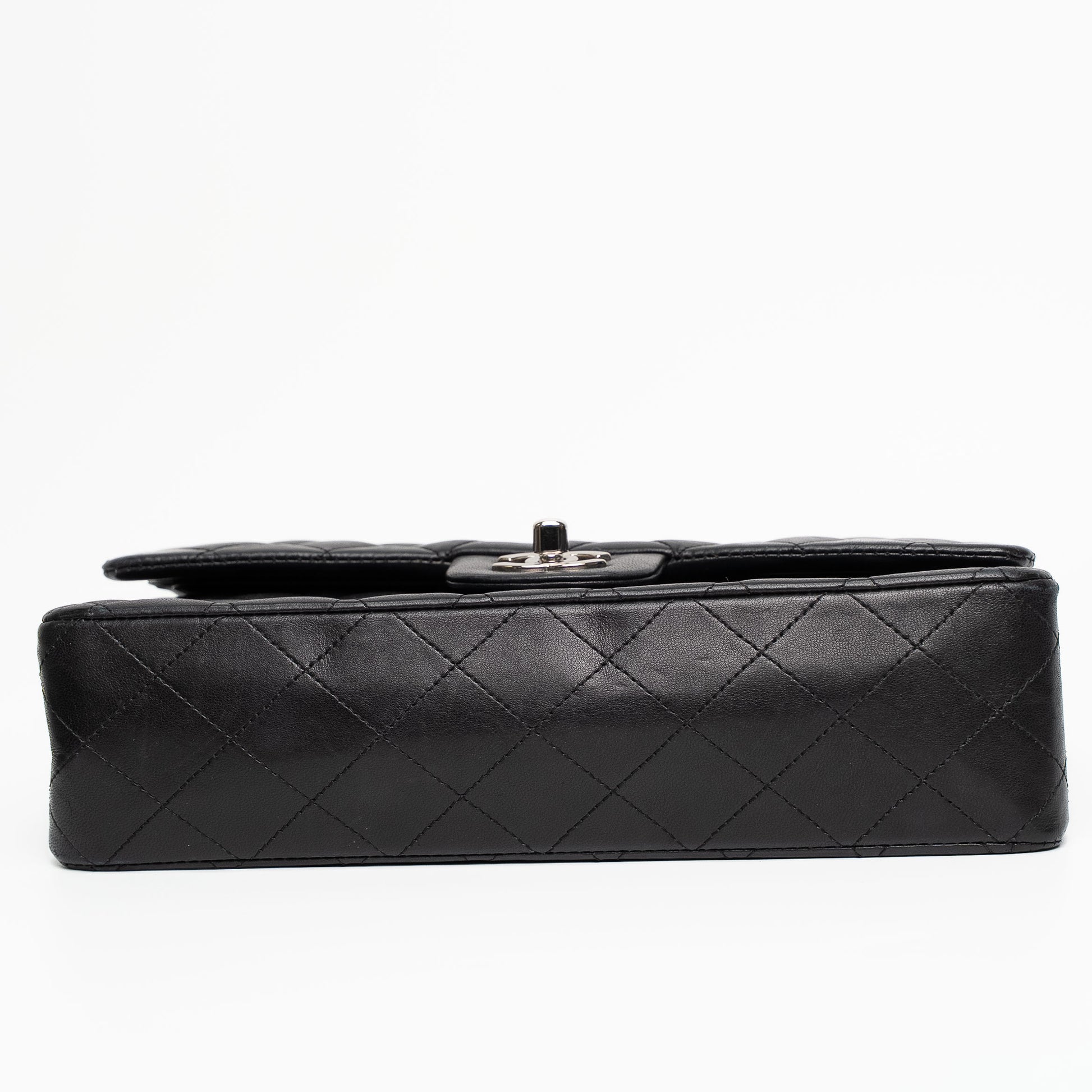 A timeless Chanel Classic Flap in black lambskin with elegant silver-tone hardware.