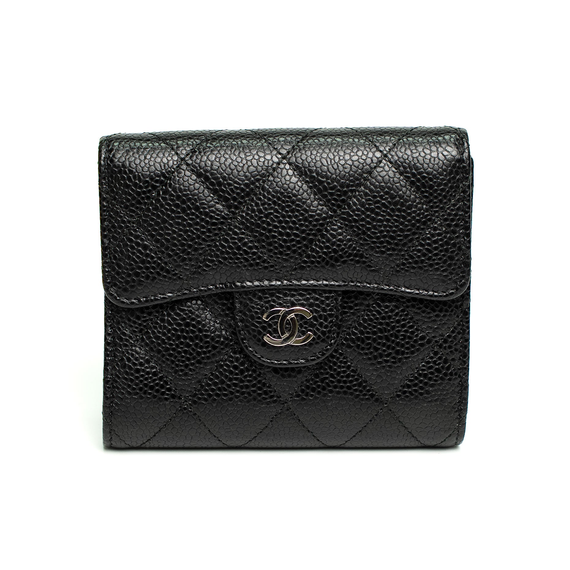 Refined and timeless, crafted in black caviar grained leather with diamond quilting and silver CC clasp — an elegant compact piece for everyday sophistication.
