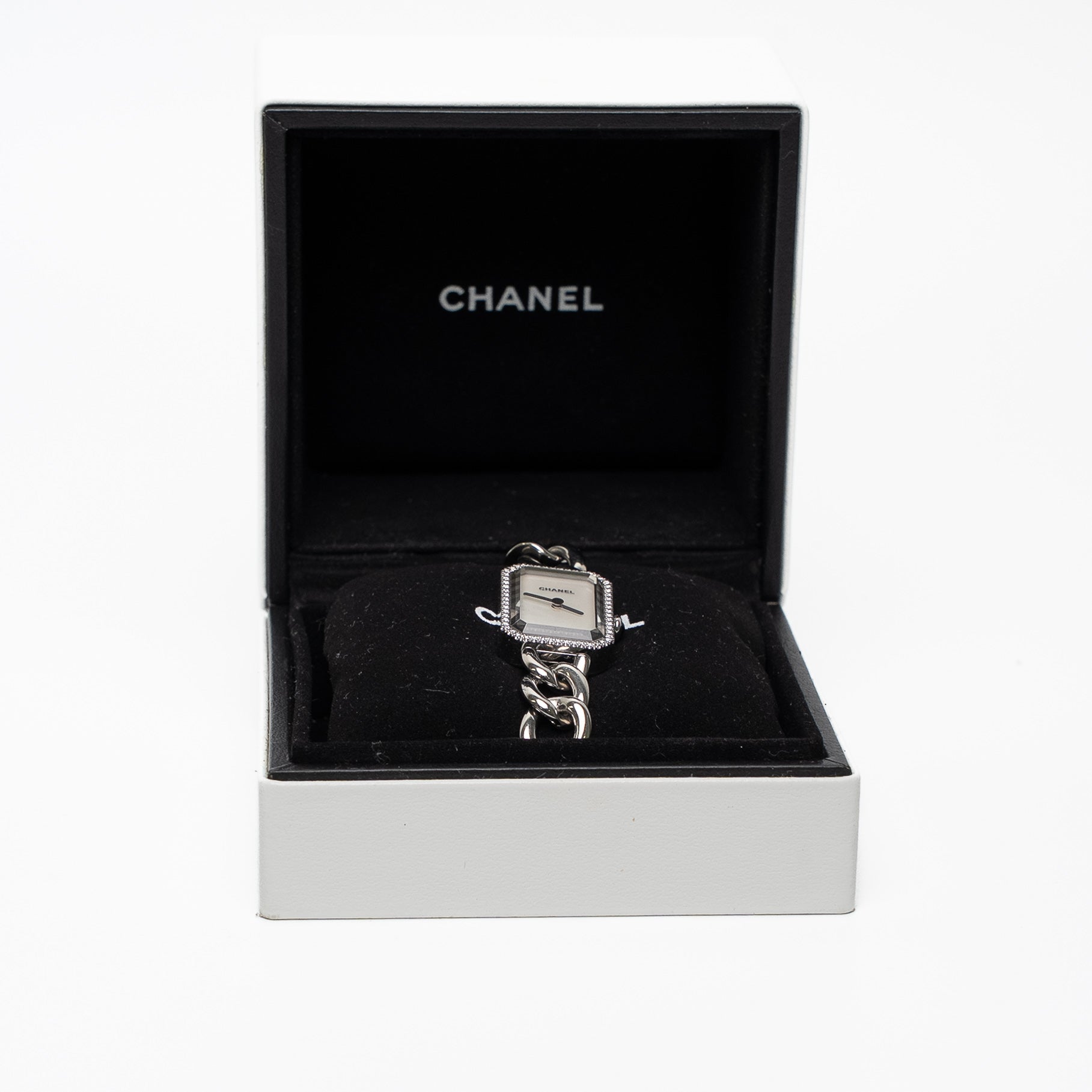 Elegant Chanel Première Swiss-made wristwatch featuring a luminous white mother-of-pearl dial framed by a diamond-set rectangular case, paired with the iconic Chanel steel chain bracelet — timeless jewellery-inspired design with refined Parisian luxury appeal.