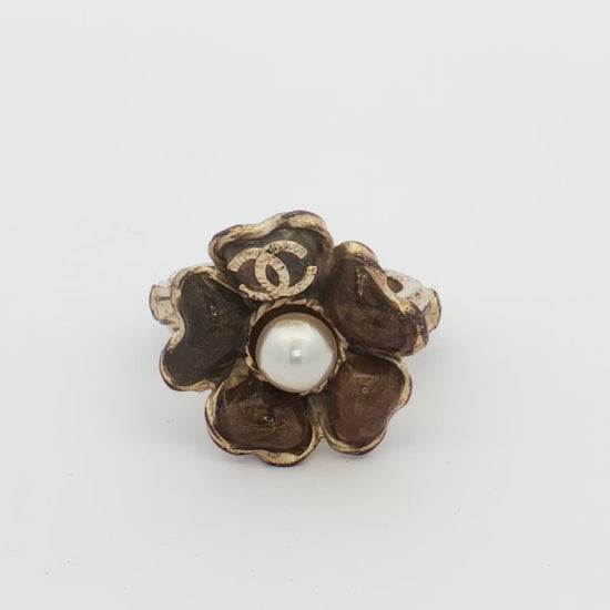 Elegant vintage Chanel statement ring featuring the signature CC logo and faux pearl centre.