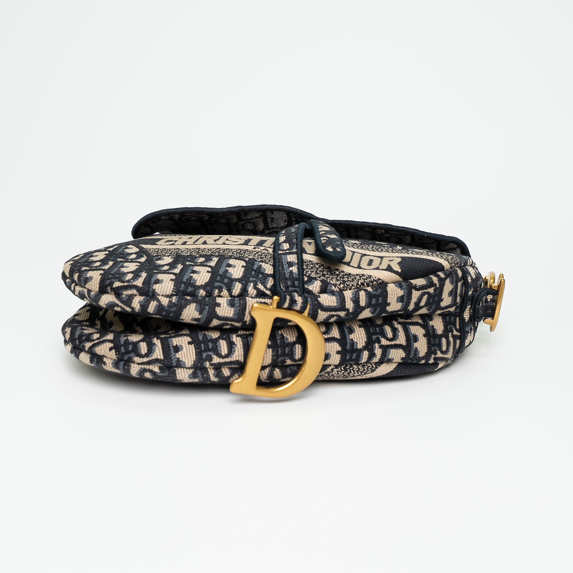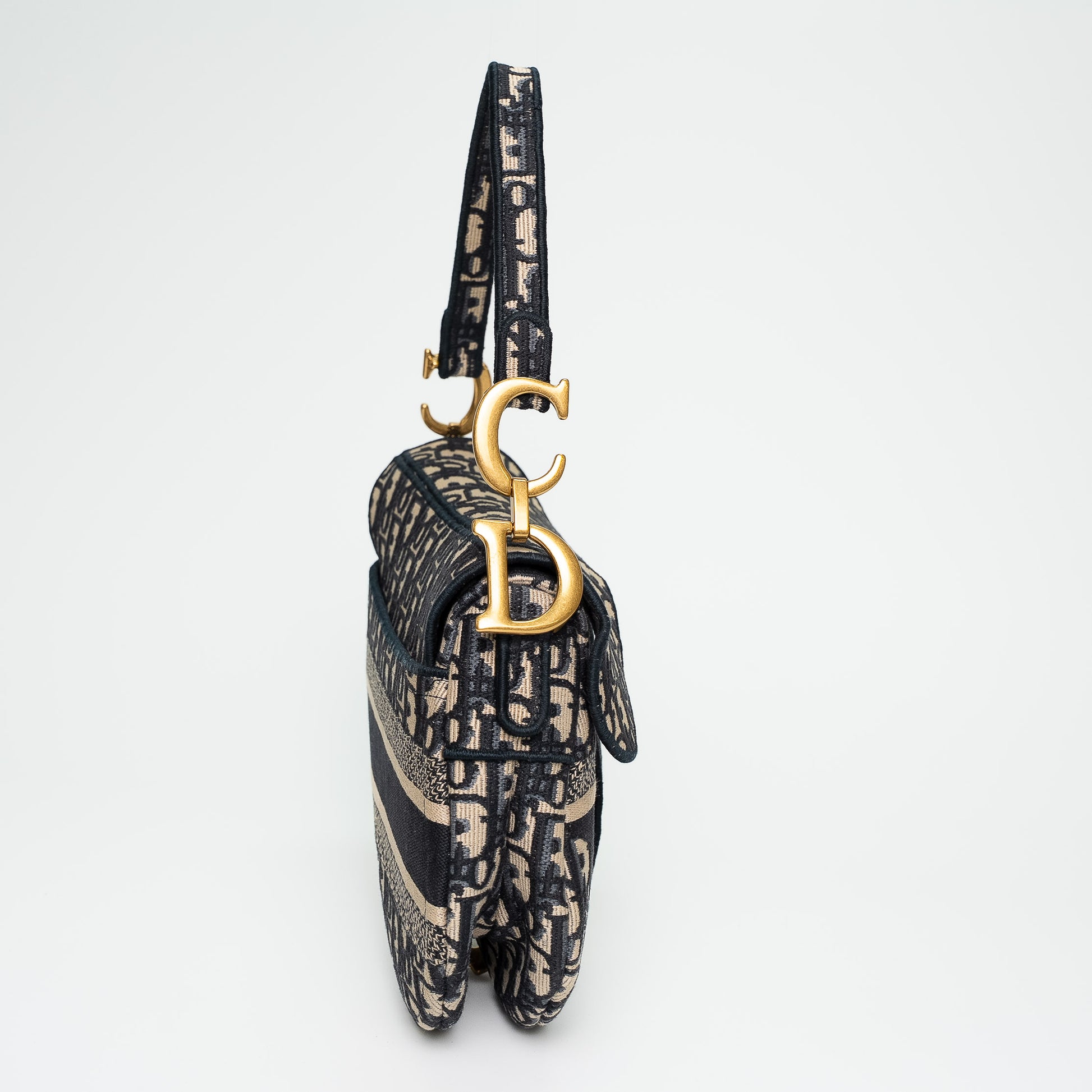 Iconic and bold, the Christian Dior Saddle Bag in navy blue Oblique jacquard canvas features gold-tone hardware, a magnetic flap closure, and the signature “C” and “D” charms — a timeless statement of Dior heritage.