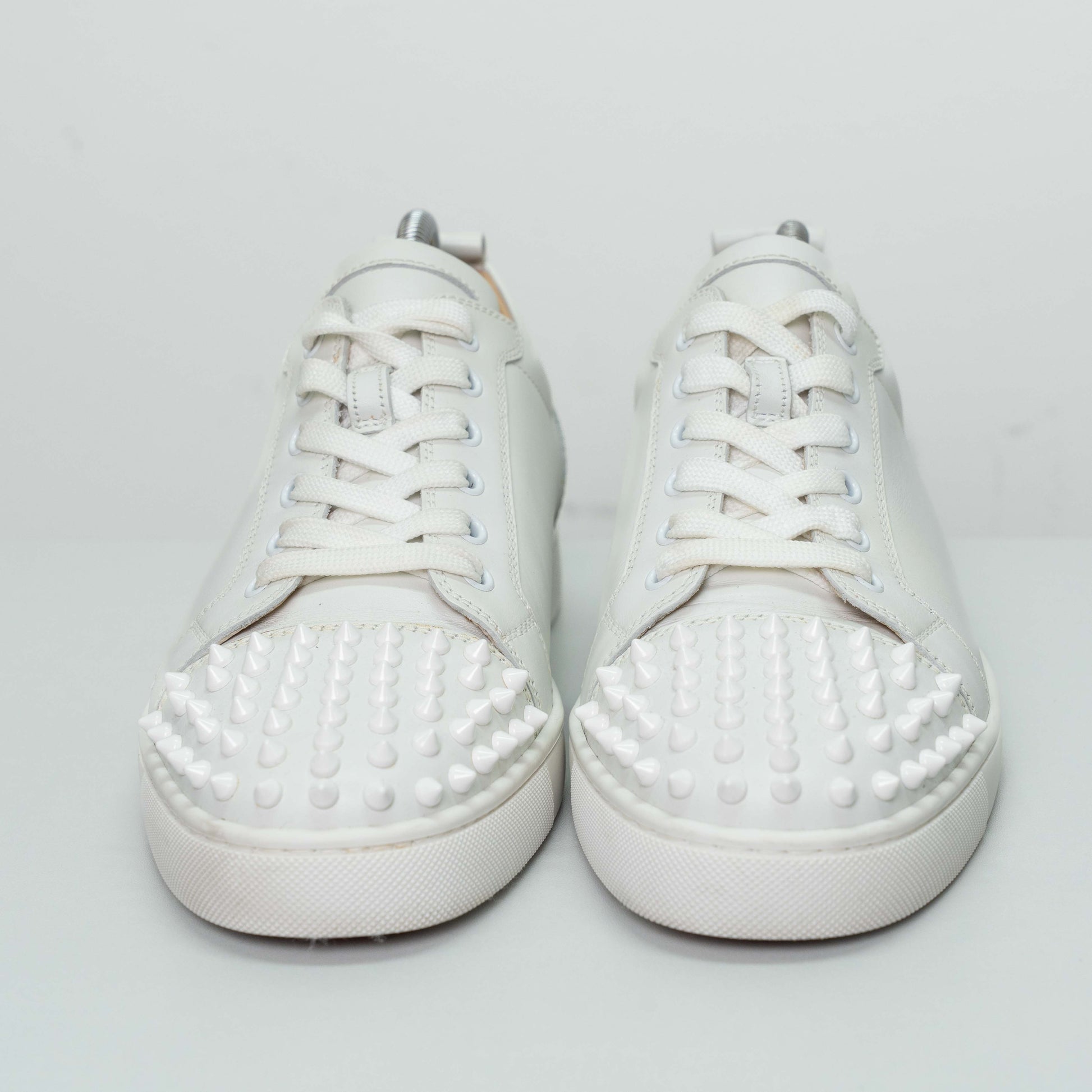 - Sleek white leather low-top sneakers with signature tonal spike embellishments on the toe, adding an edgy yet luxurious touch.