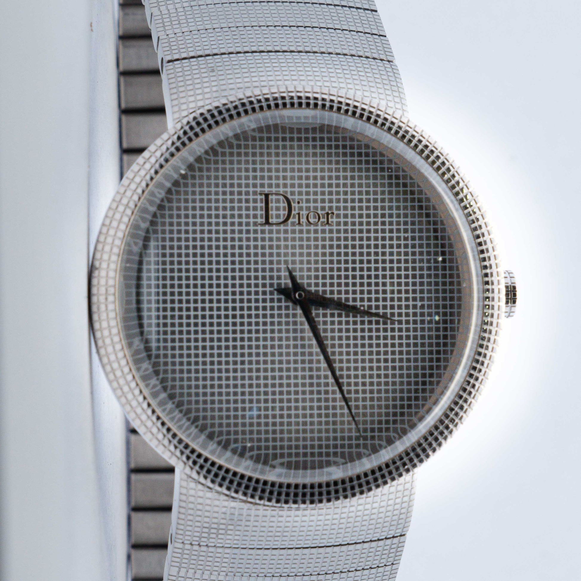 Minimalist Dior Chiffre Rouge with a 38mm stainless steel case and full mesh-pattern dial, bezel, and bracelet. A bold monochrome design showcasing Dior’s signature avant-garde style.