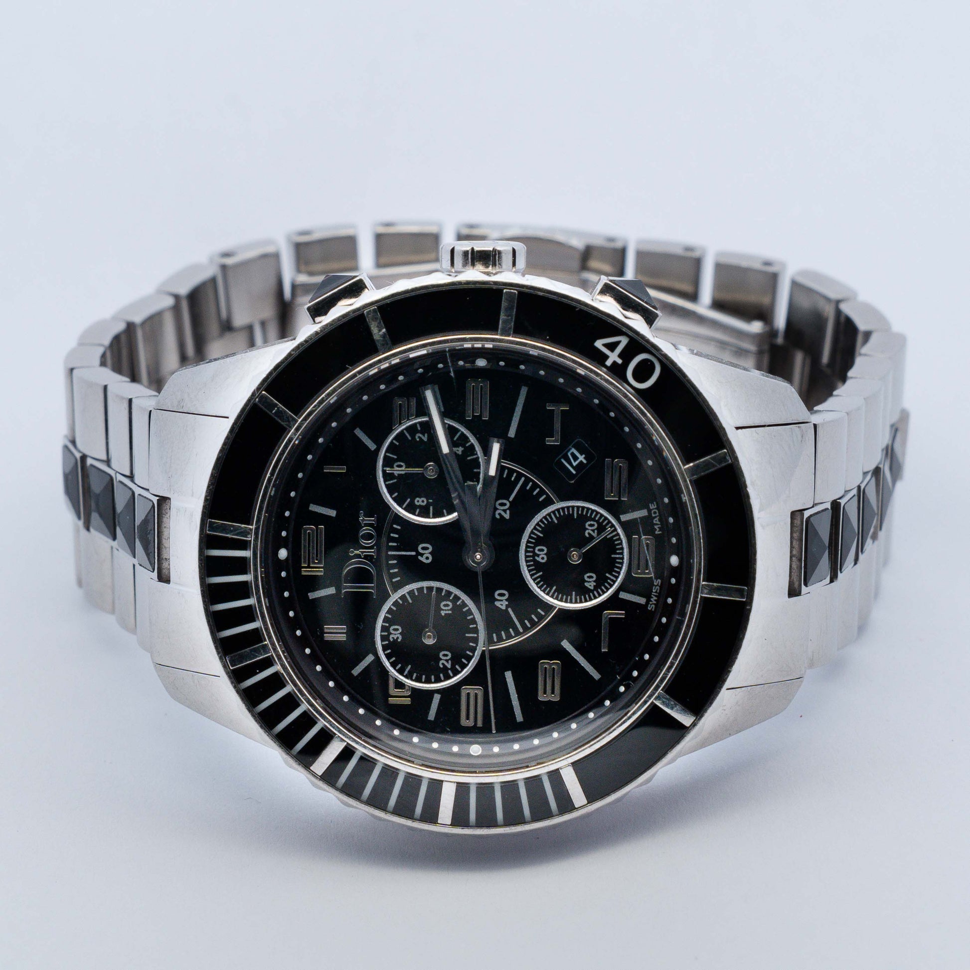 Sport-luxury Dior Christal Chronograph in a 34mm stainless steel case with black ceramic inlays, black dial with chronograph sub-dials, and steel bracelet accented with pyramid ceramic links.