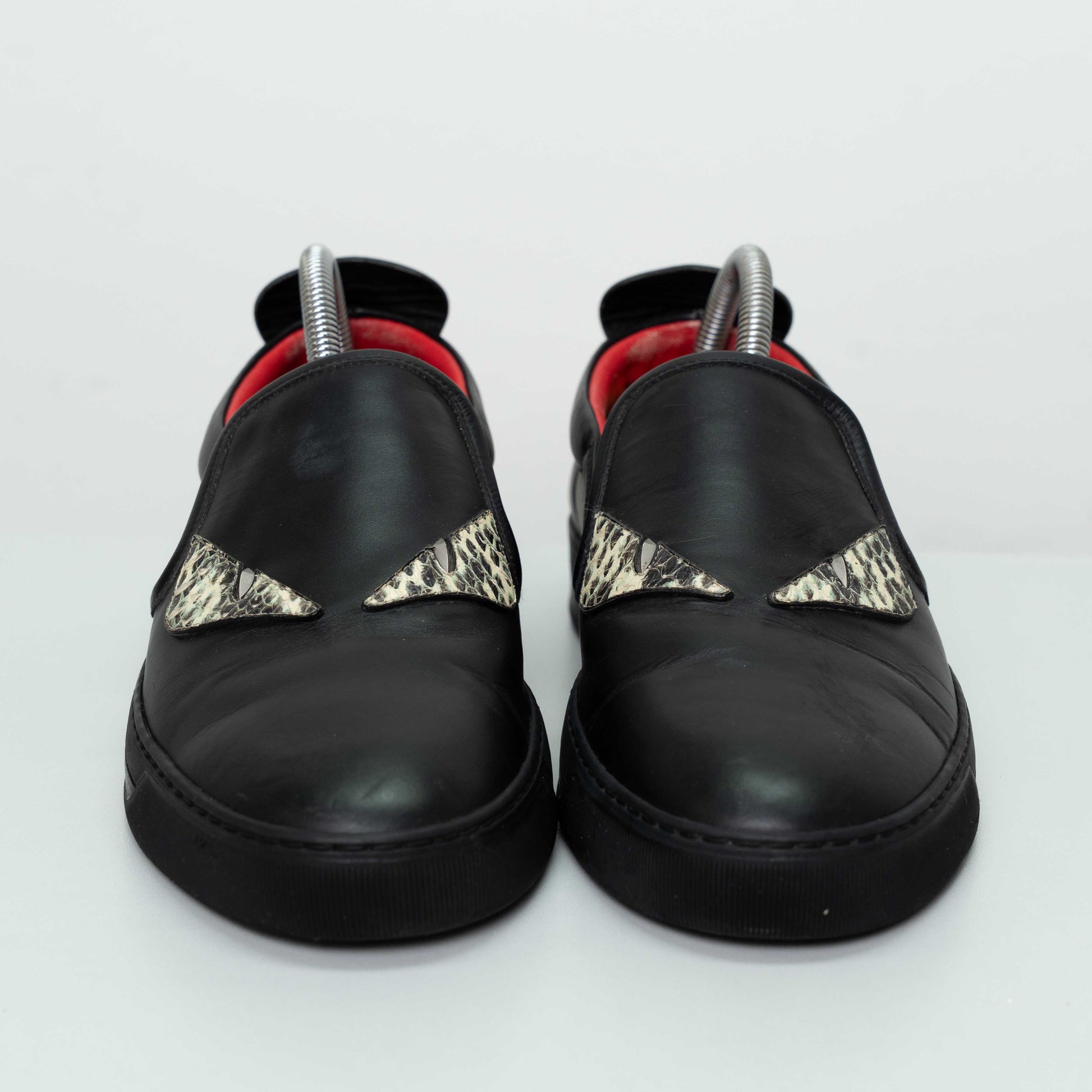Black leather slip-on sneakers with Fendi Monster Eyes, snakeskin accents, and silver-tone spikes.