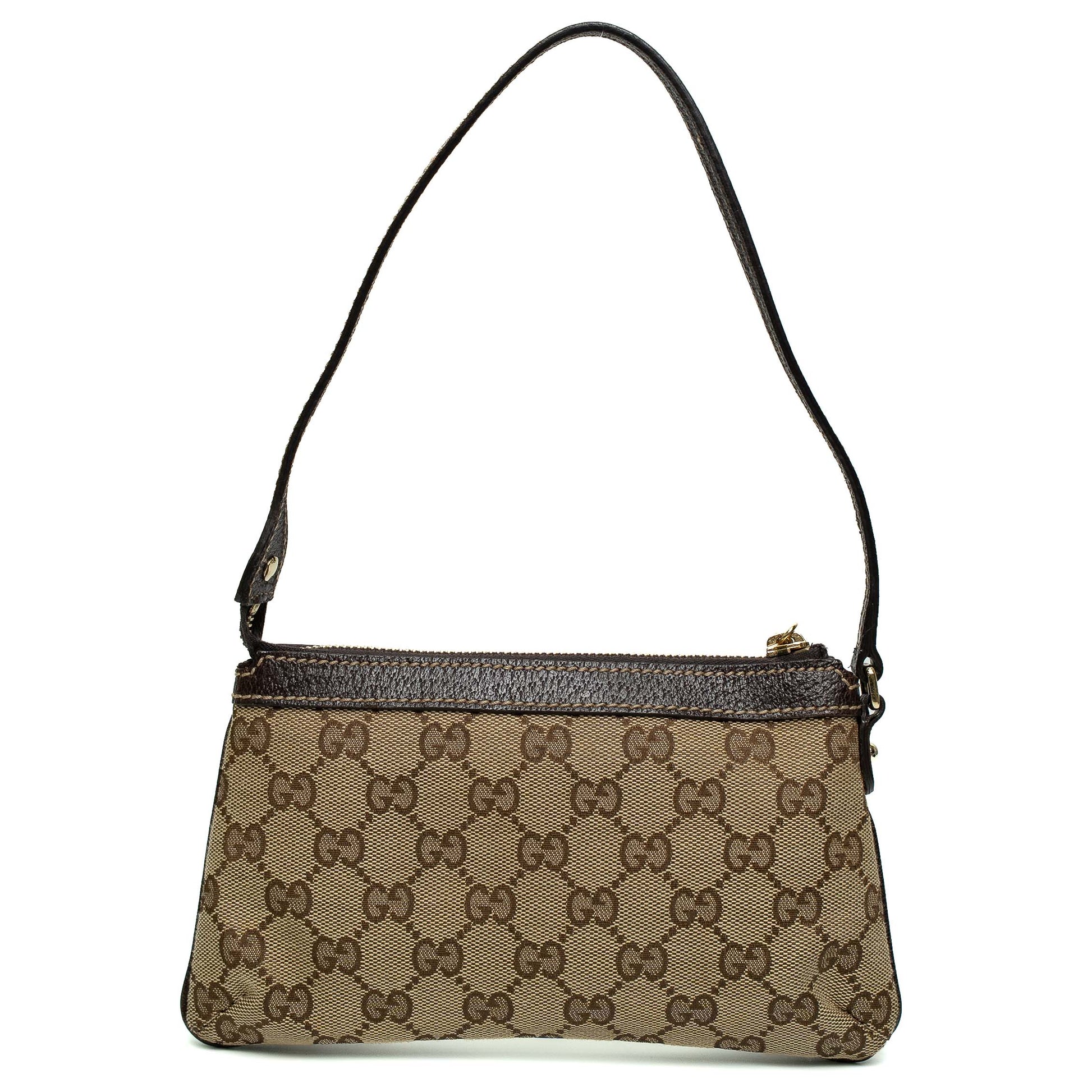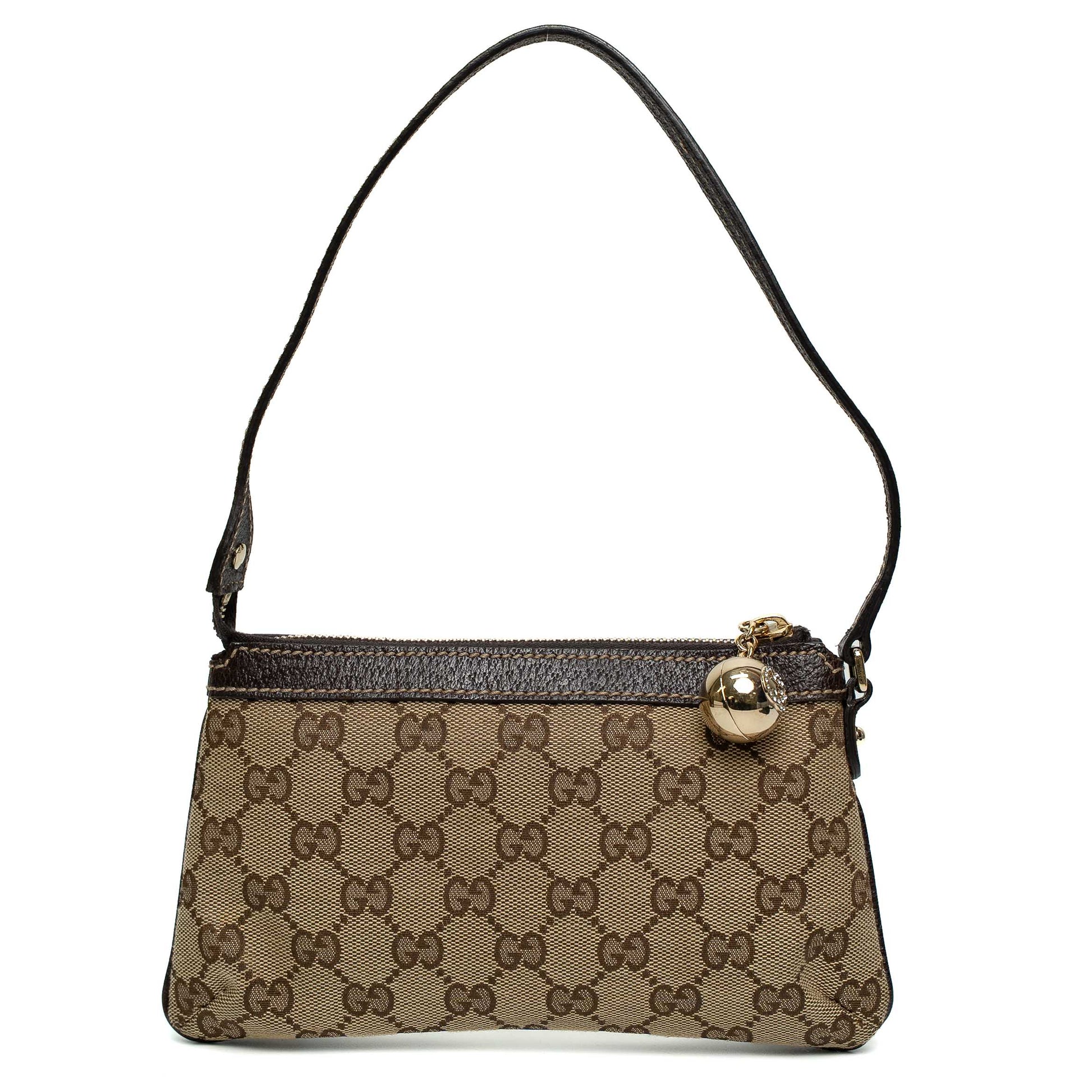 Classic Gucci GG canvas pochette featuring leather trim, gold-tone hardware, and compact zip-top silhouette.