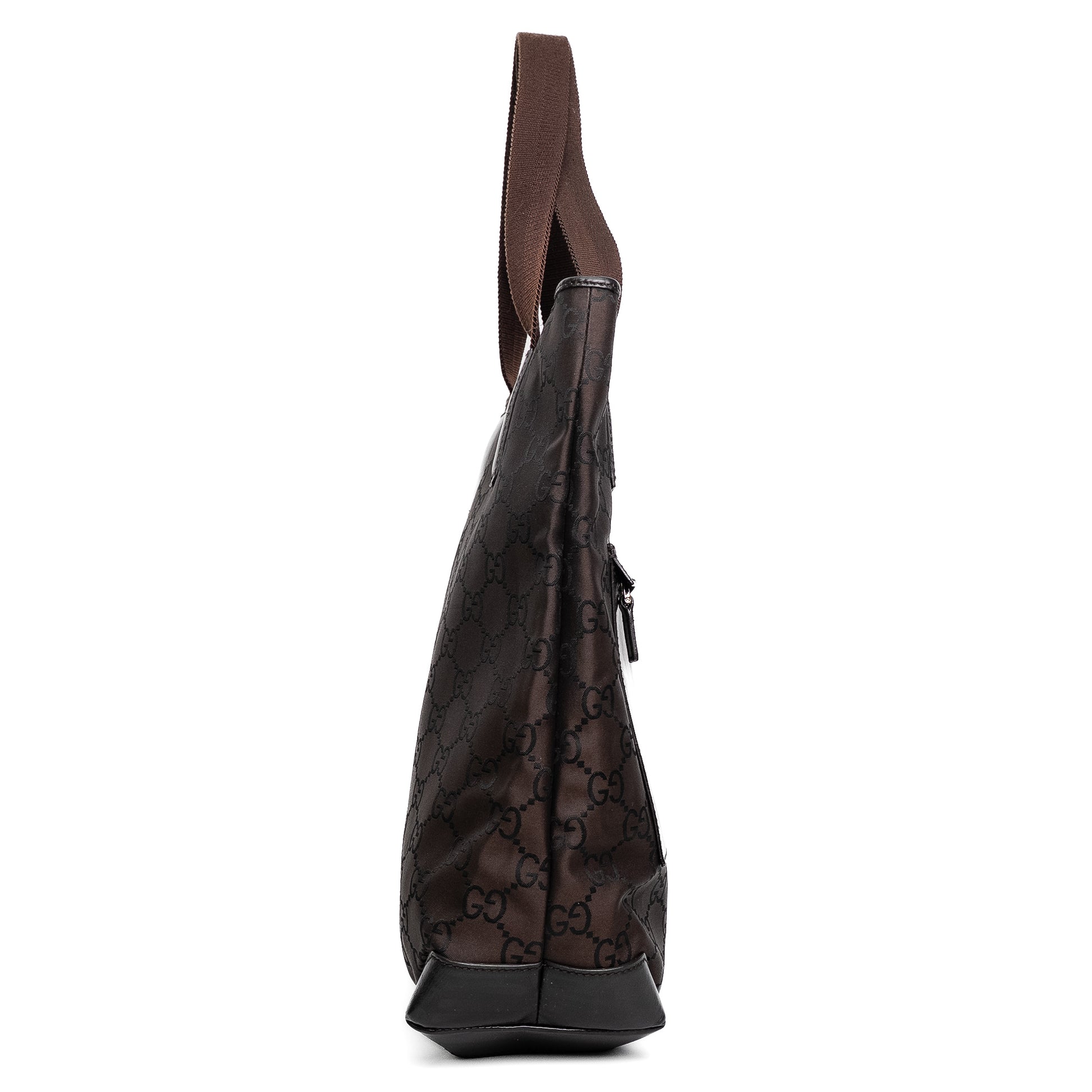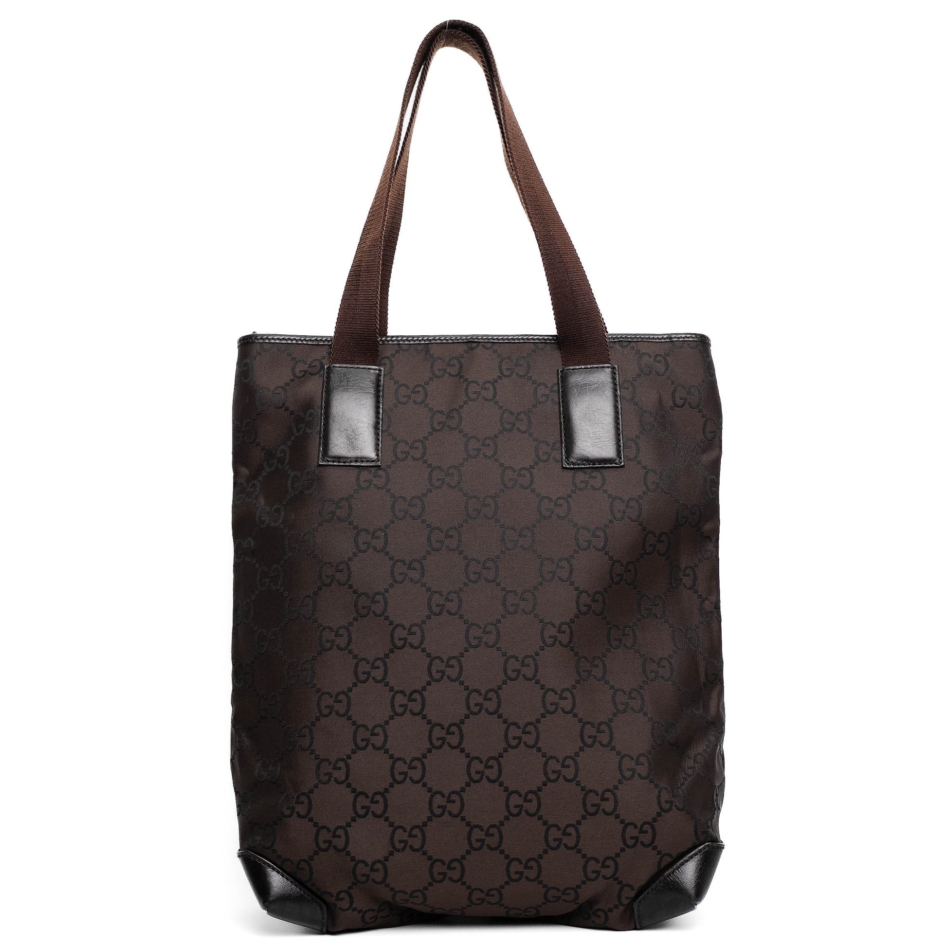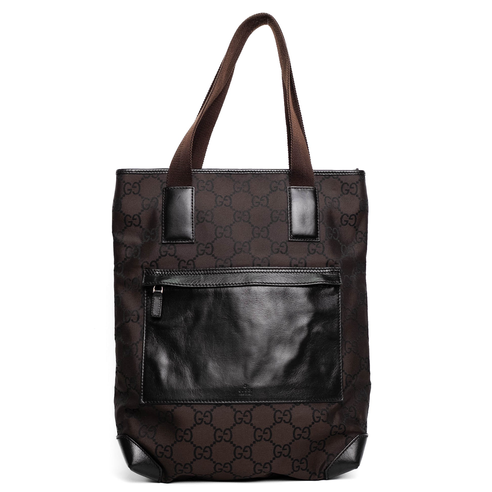 A classic Gucci tote crafted in signature GG canvas with brown leather trim and spacious everyday functionality.