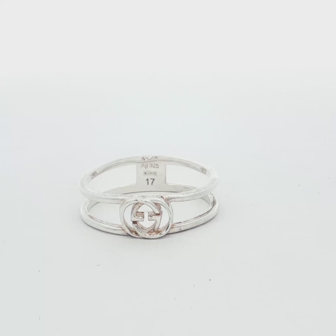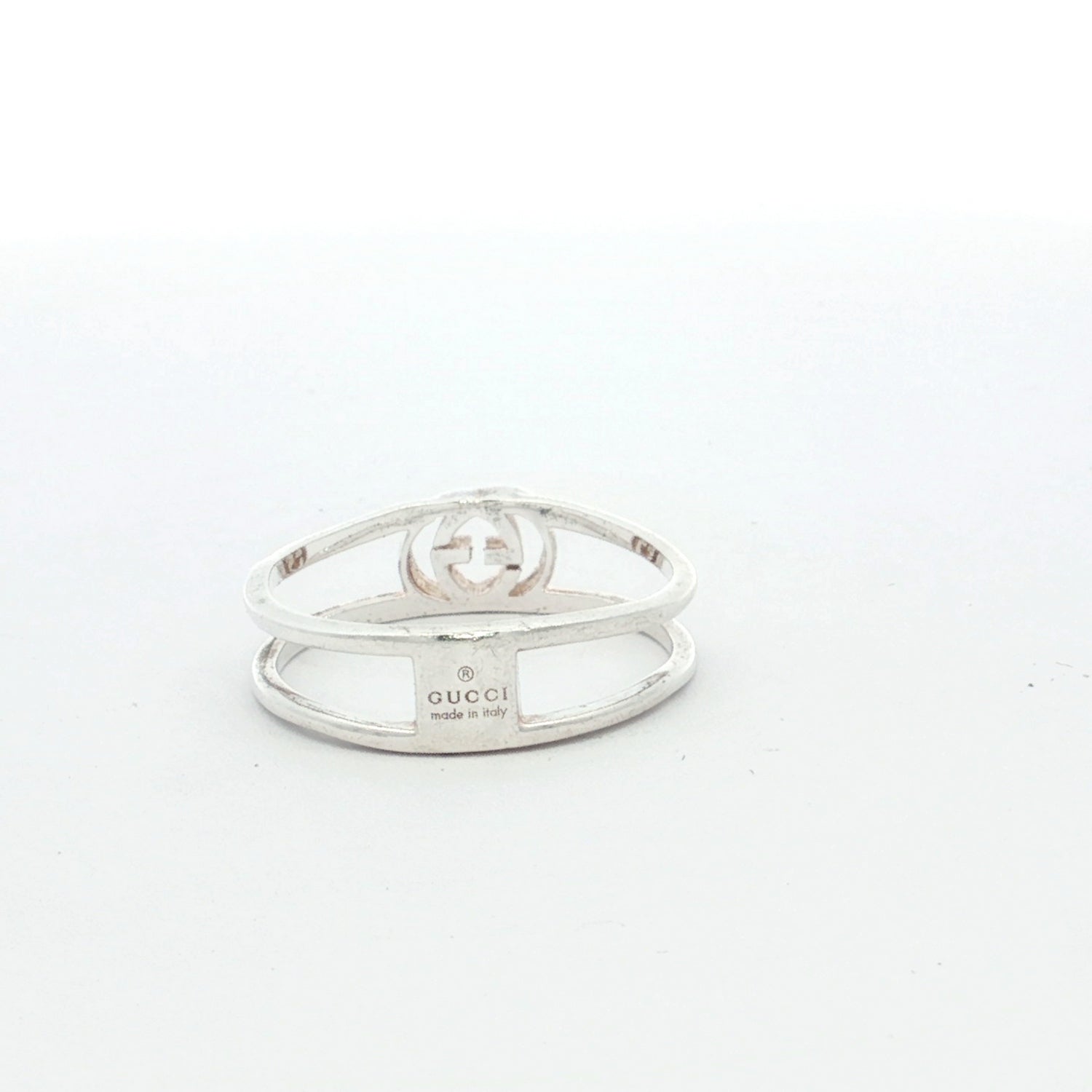 Classic Gucci Interlocking G Silver Band Ring crafted in solid 925 sterling silver. Features the iconic Gucci double-G logo within an open geometric band design. A timeless unisex piece perfect for everyday wear.