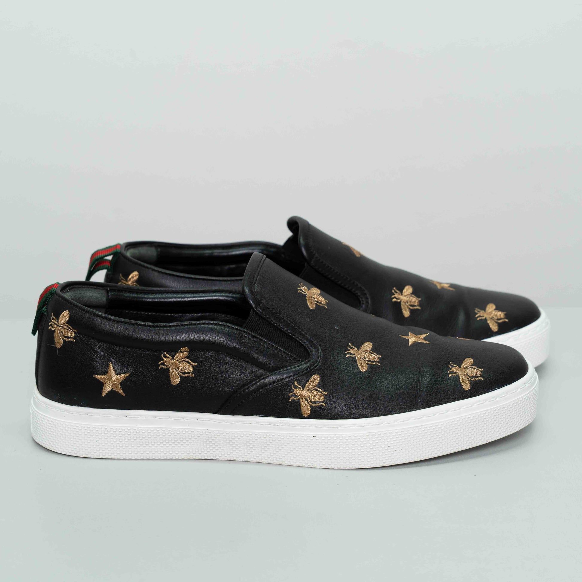 - Gucci Meesoo slip-on sneakers in black leather with gold embroidered bees and stars