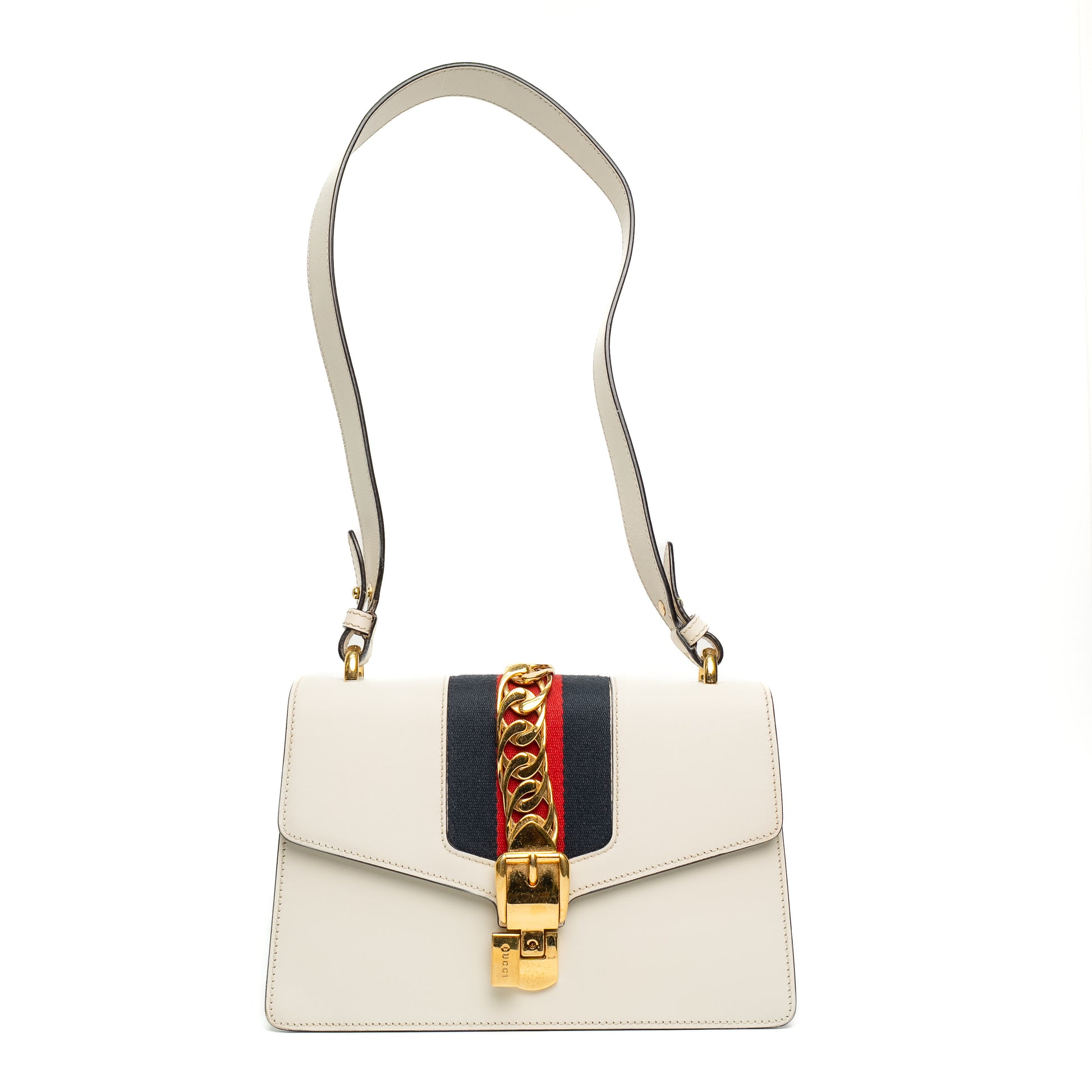 A timeless Gucci Sylvie bag in smooth calfskin featuring signature web stripe and gold chain detail.
