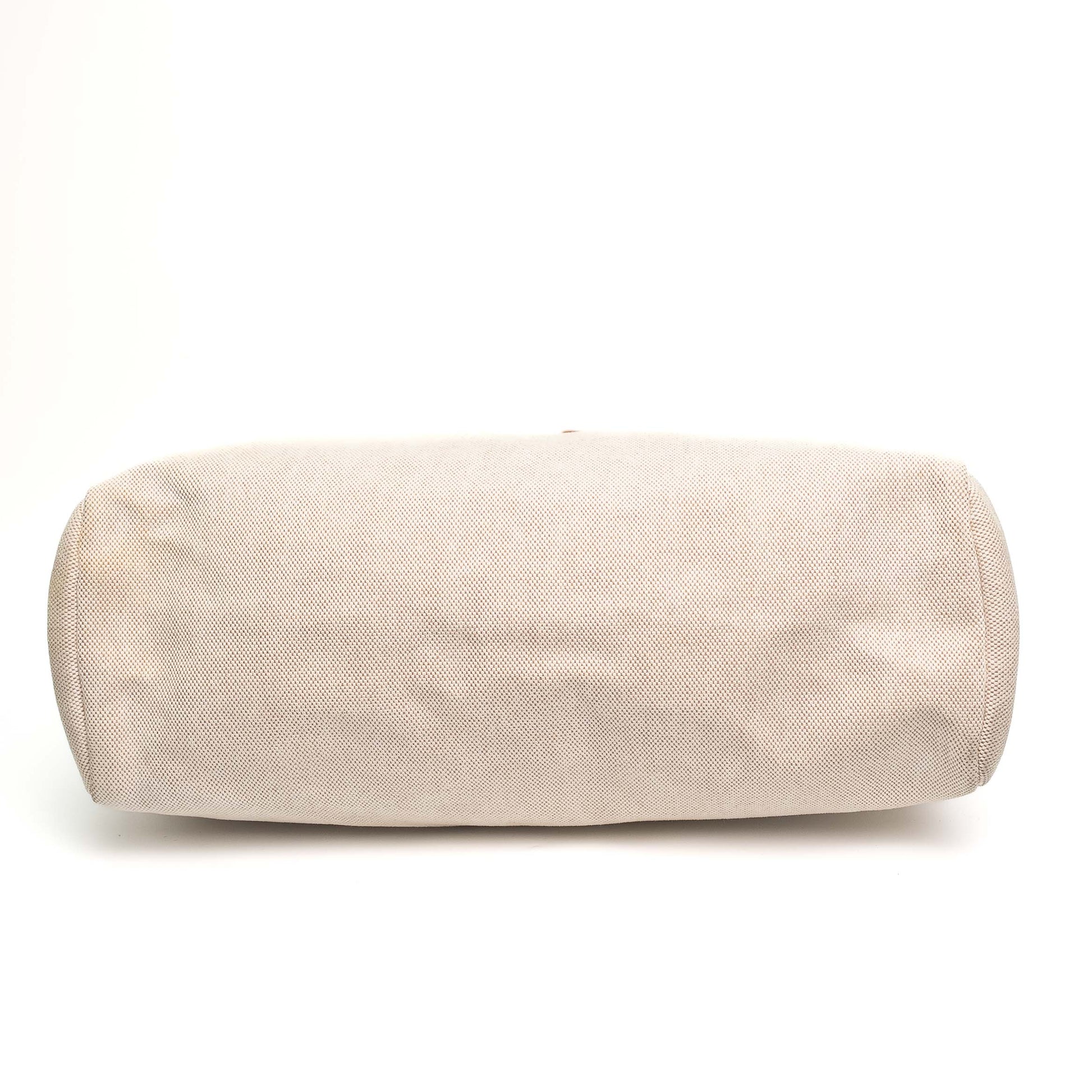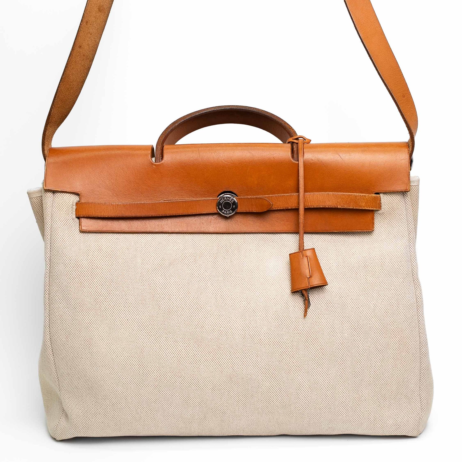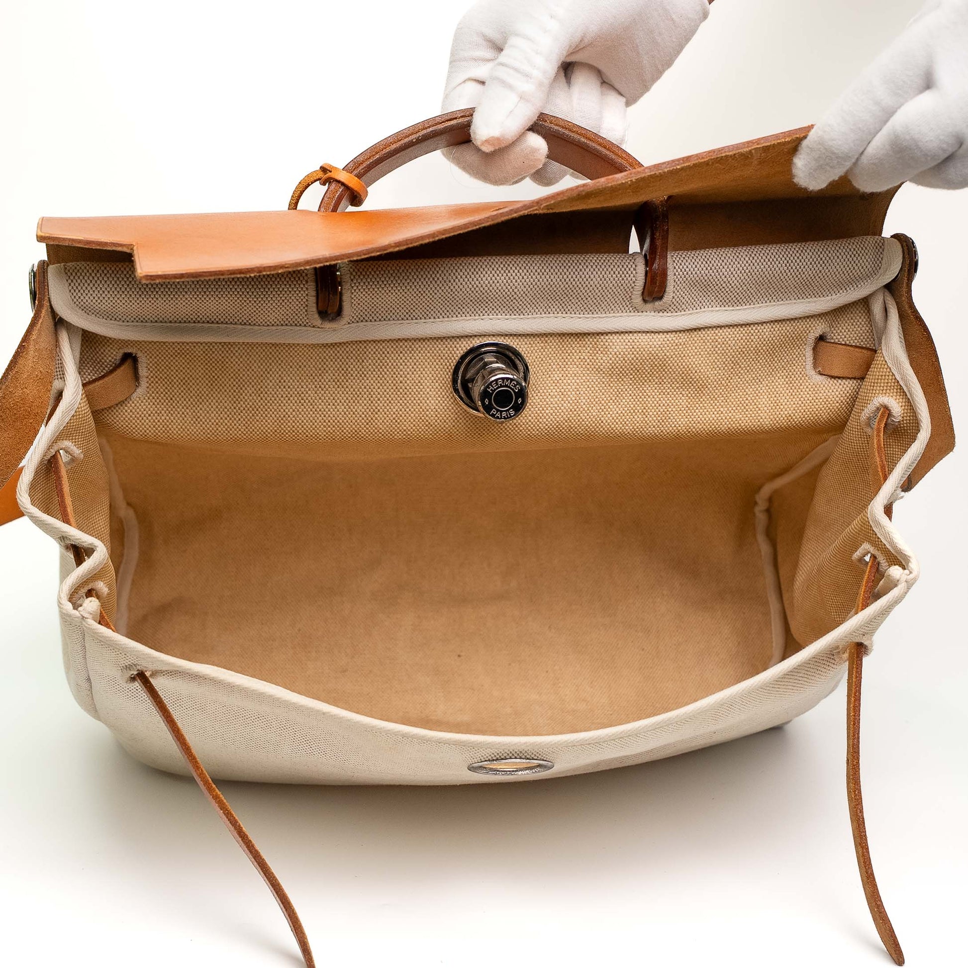 Timeless Hermès Herbag messenger crafted in beige canvas with tan leather trim, featuring the iconic saddle-style flap and versatile carry options.