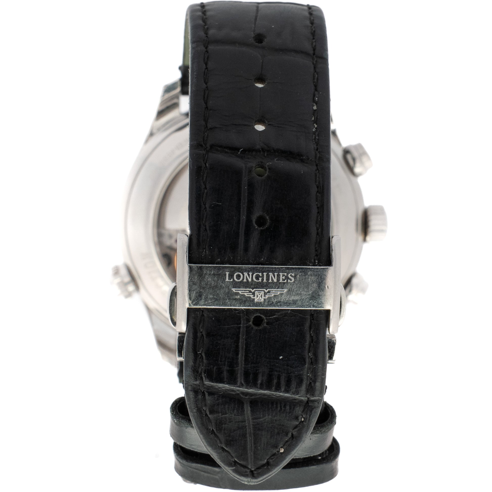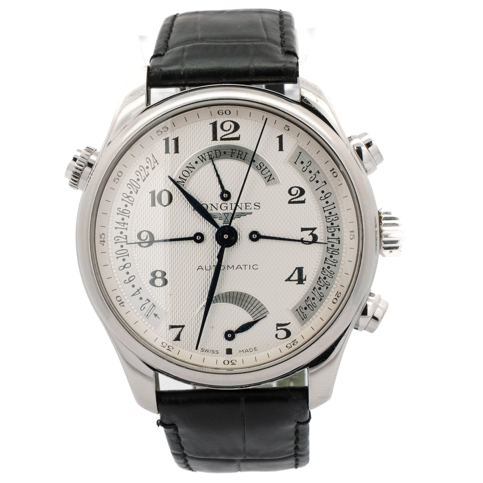 Elegant 44mm automatic Longines with retrograde complications and GMT.