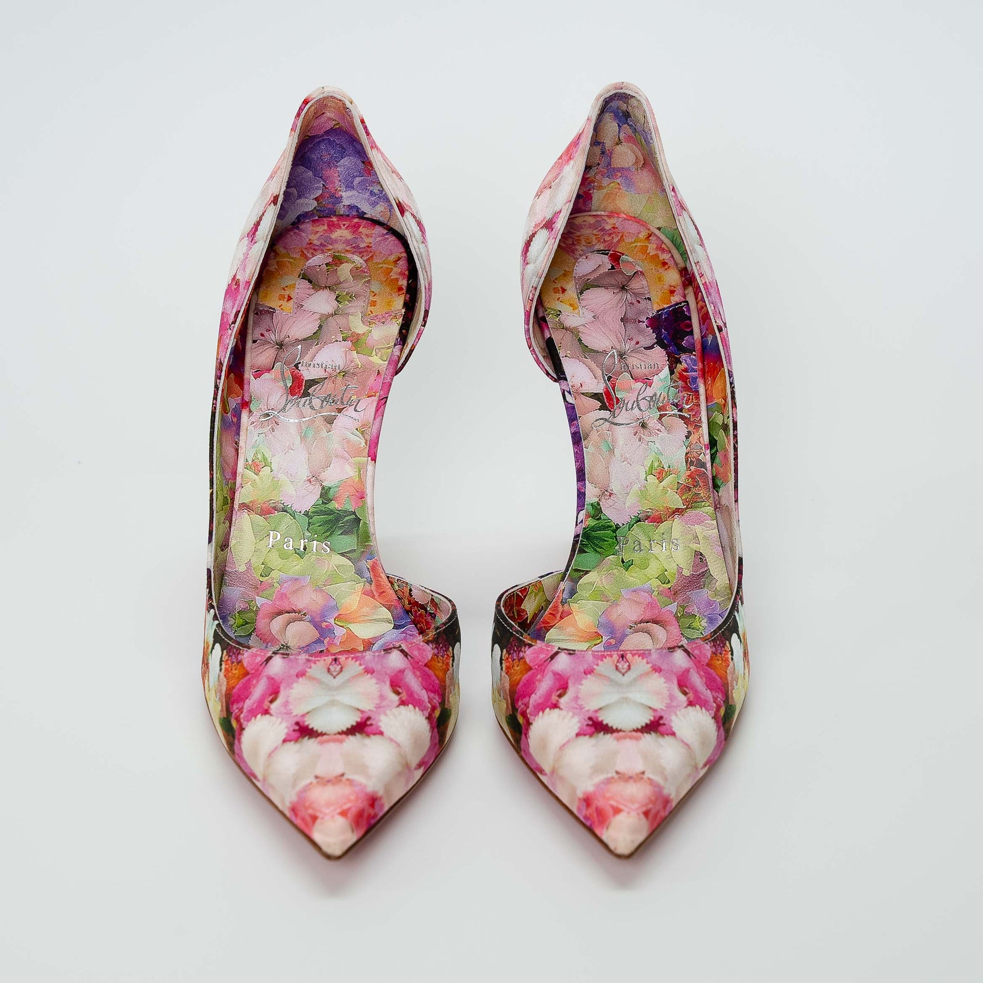 - Pointed-toe stiletto heels crafted in vibrant multicolour floral crepe satin.