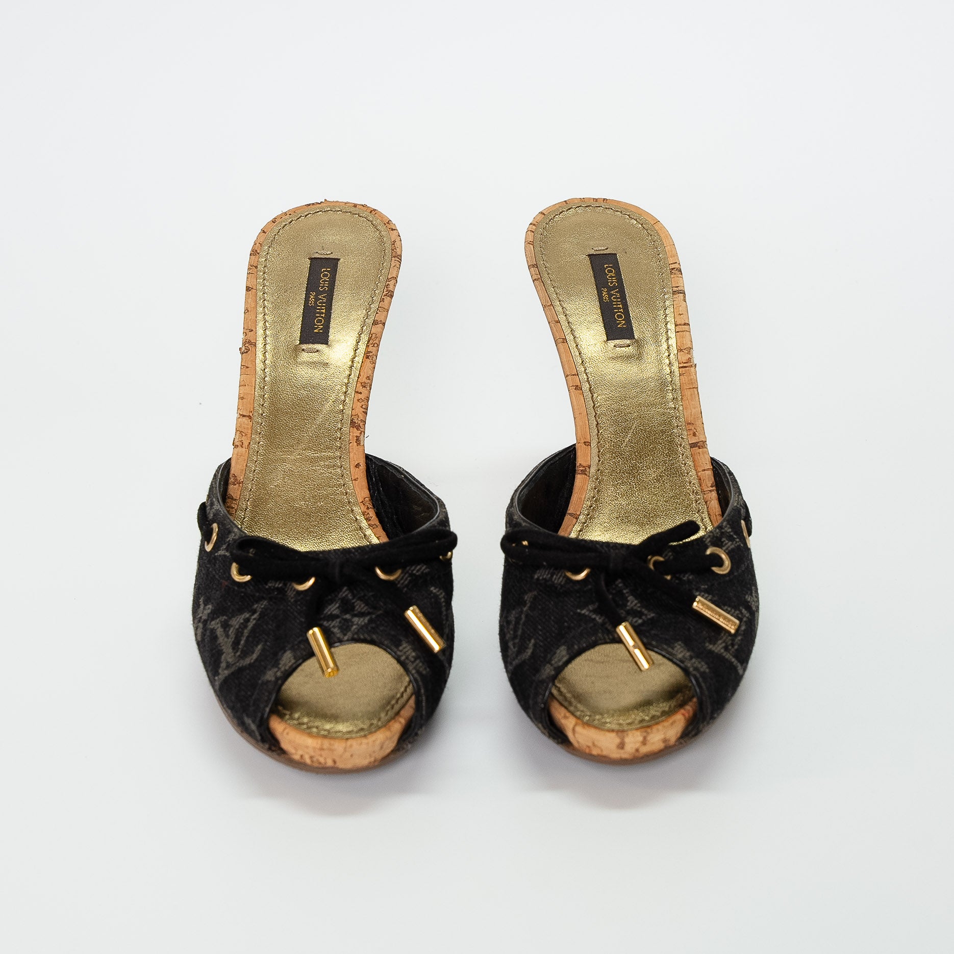 - Chic peep-toe stiletto slides crafted from black monogram denim with cork heels.