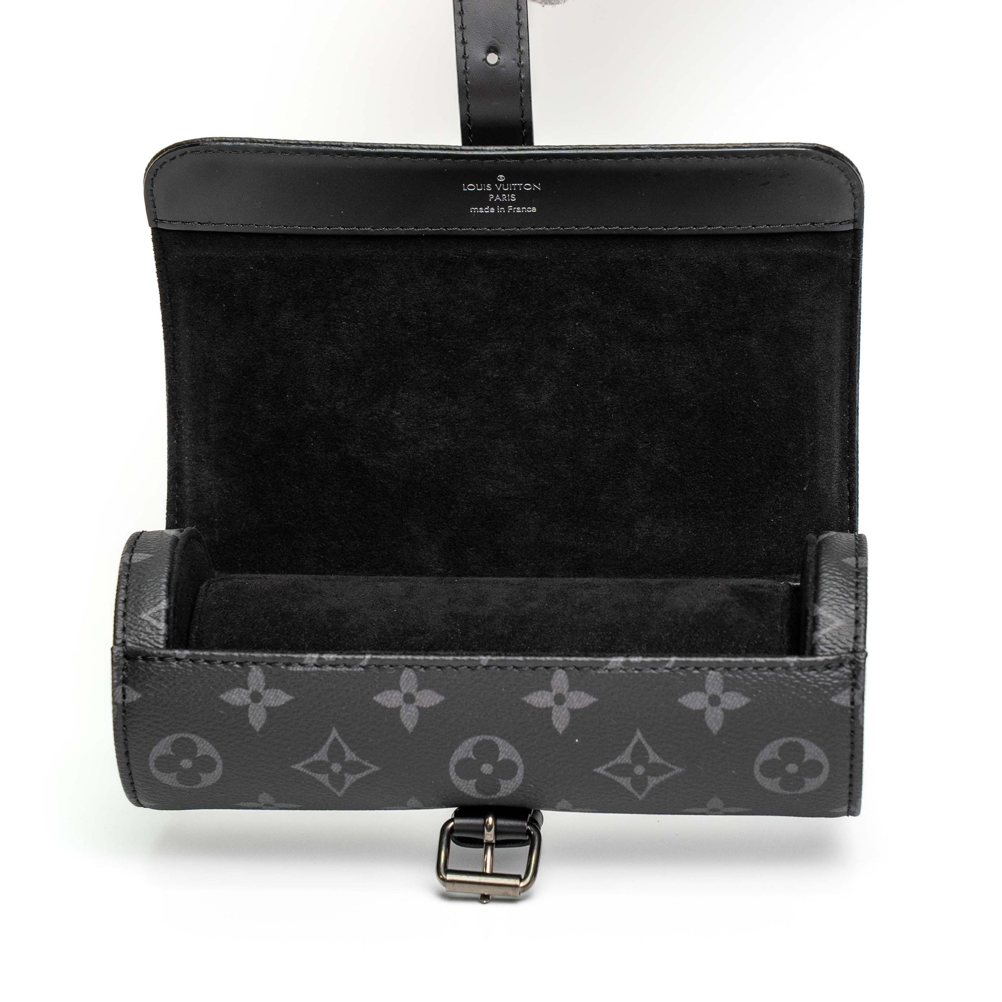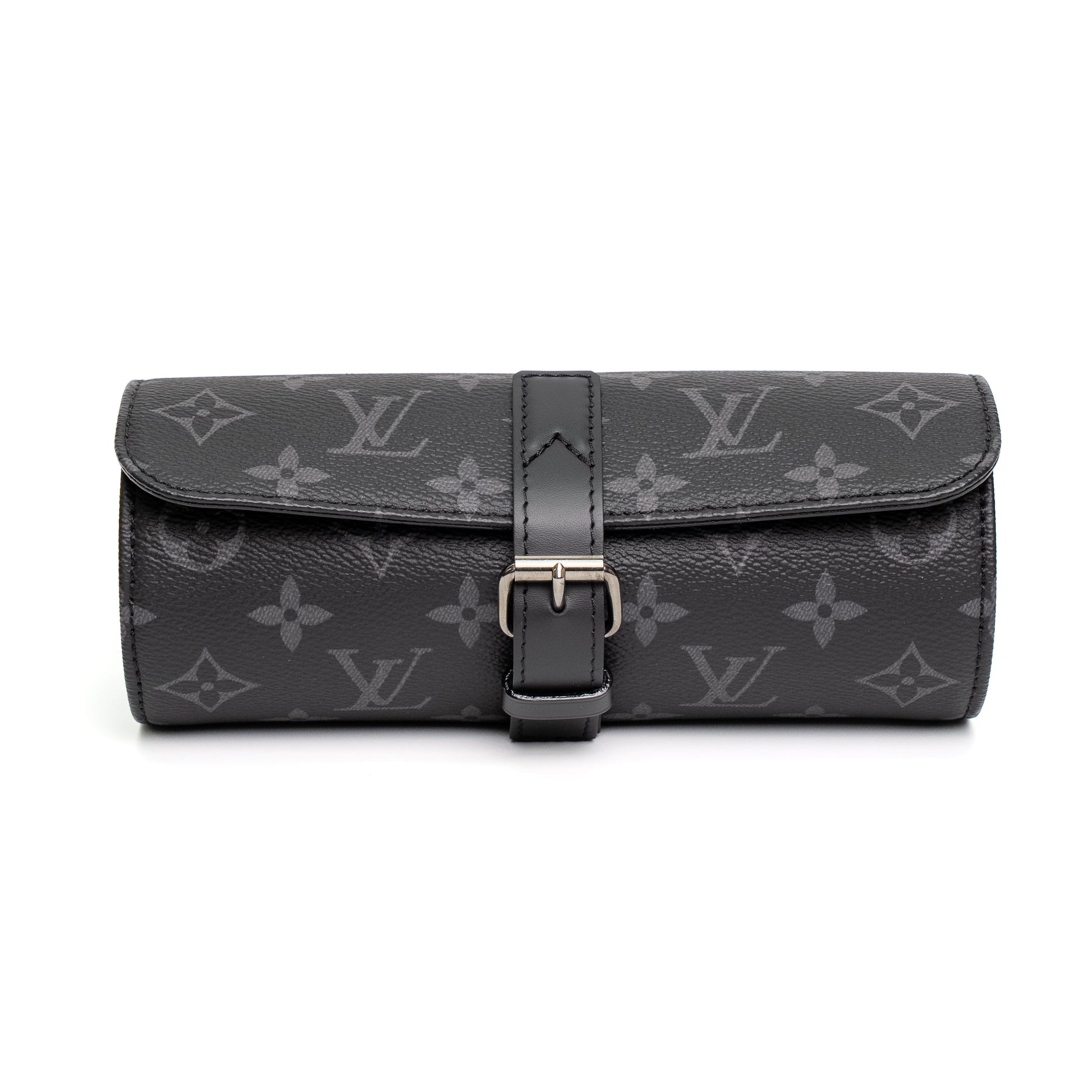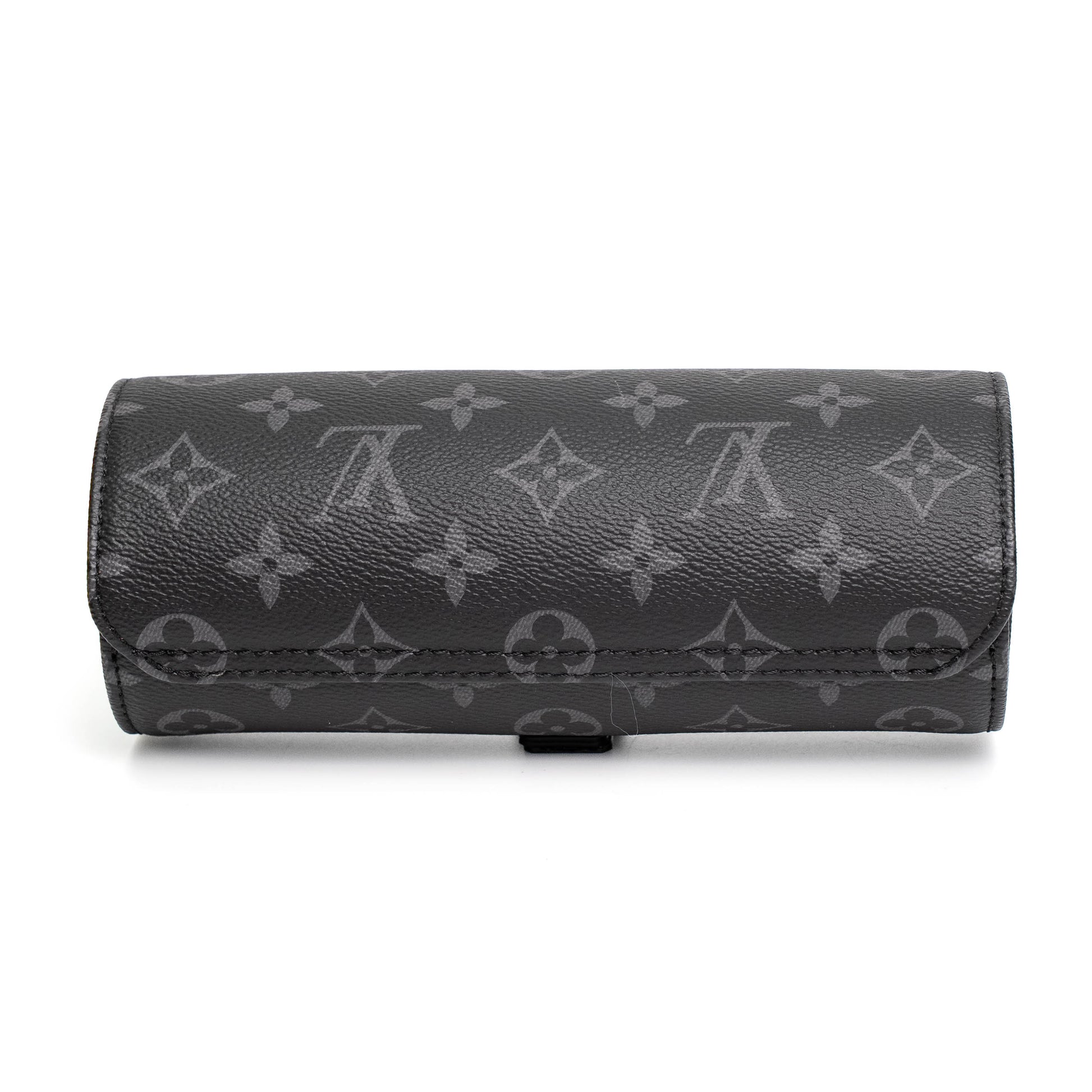 A refined Louis Vuitton watch case crafted in Monogram Eclipse canvas for secure and stylish storage.