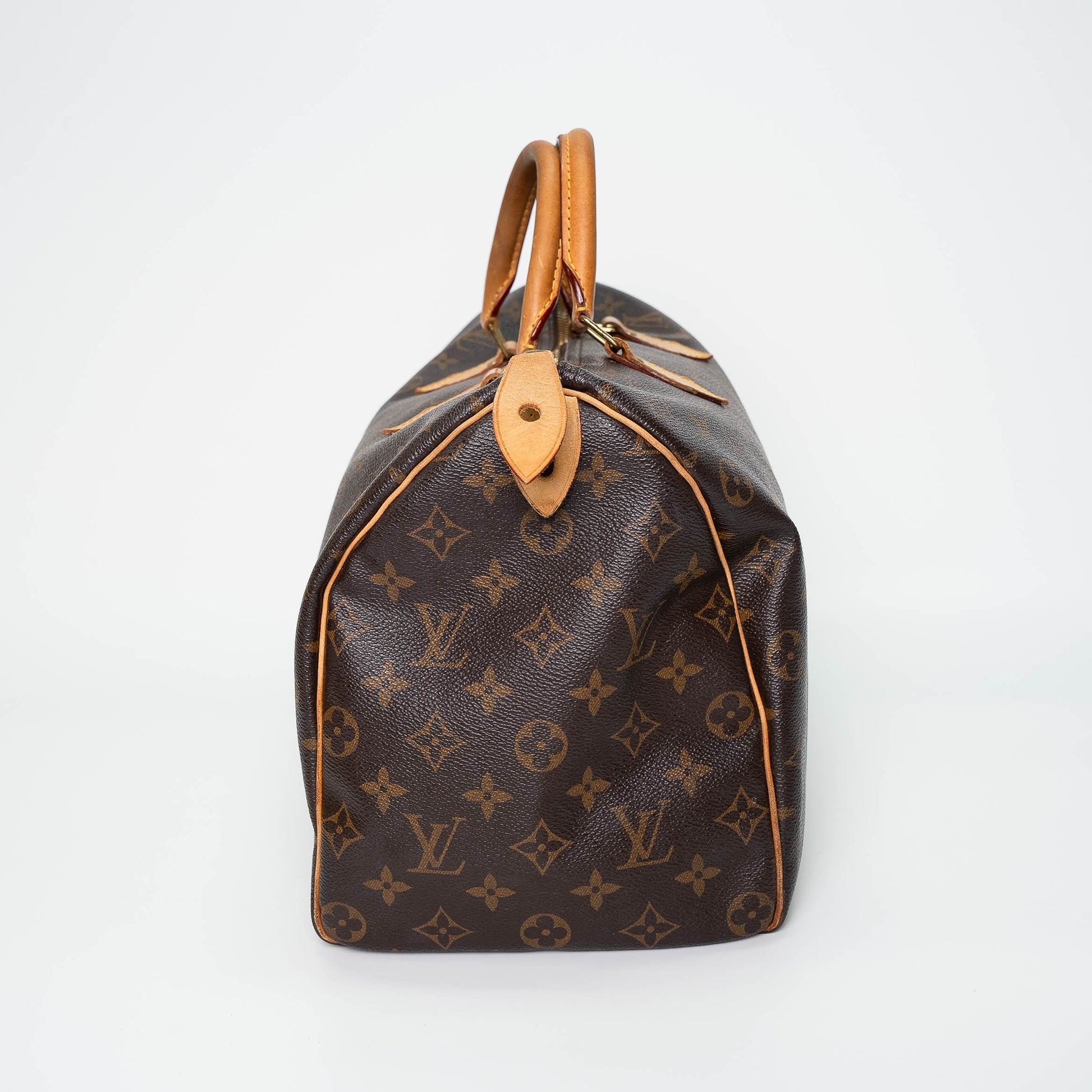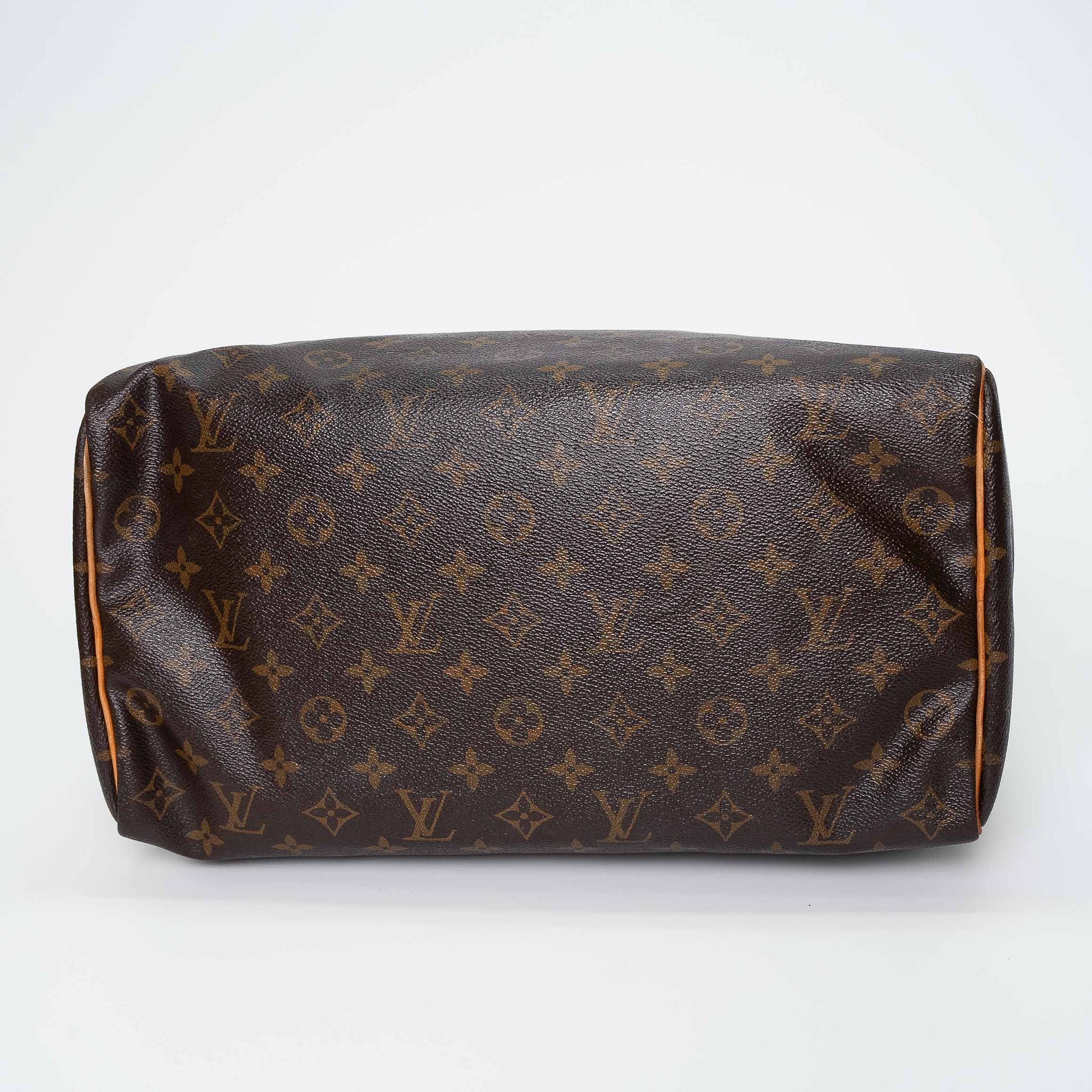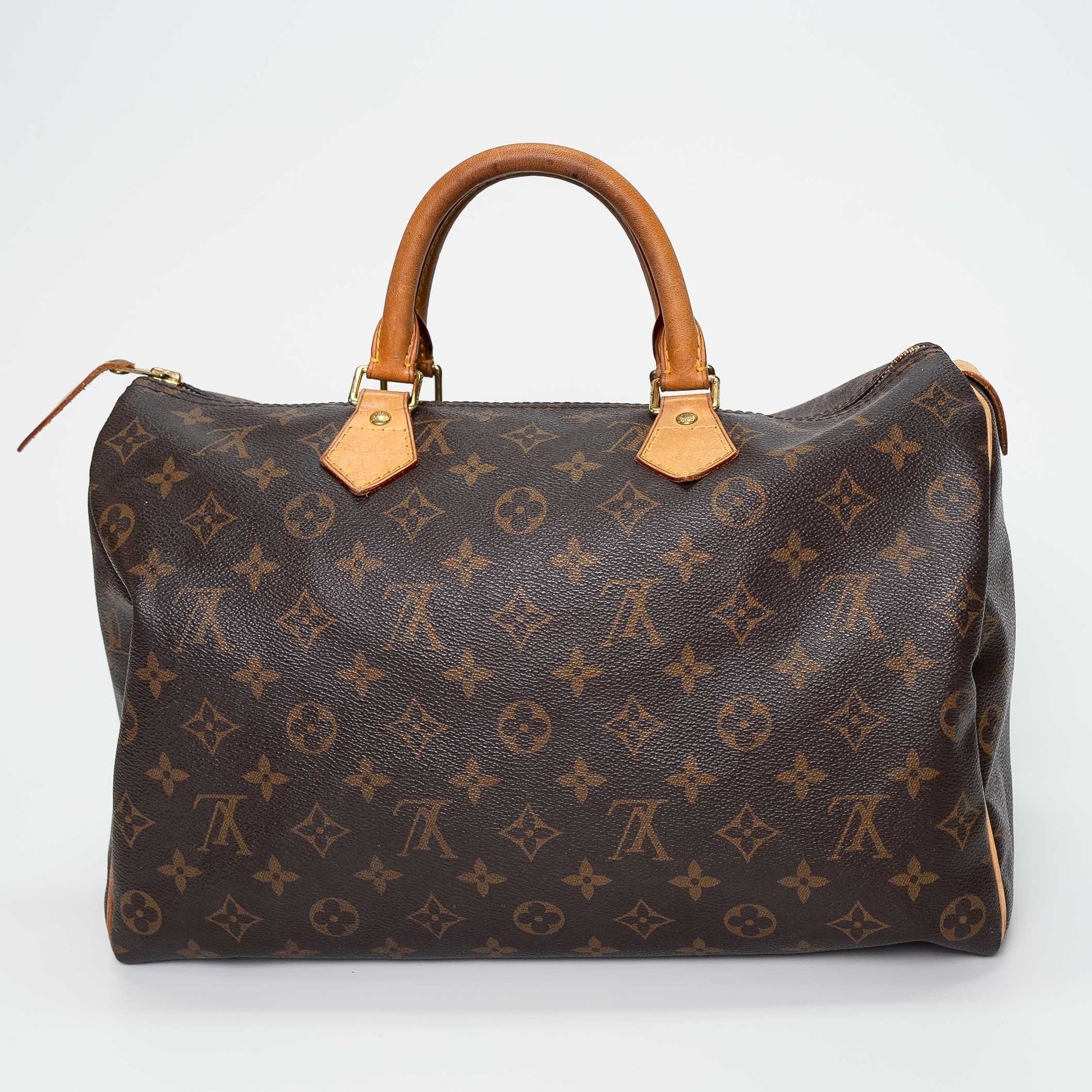 This Louis Vuitton Speedy 35 in classic Monogram canvas features golden hardware and natural vachetta leather trim for everyday elegance.