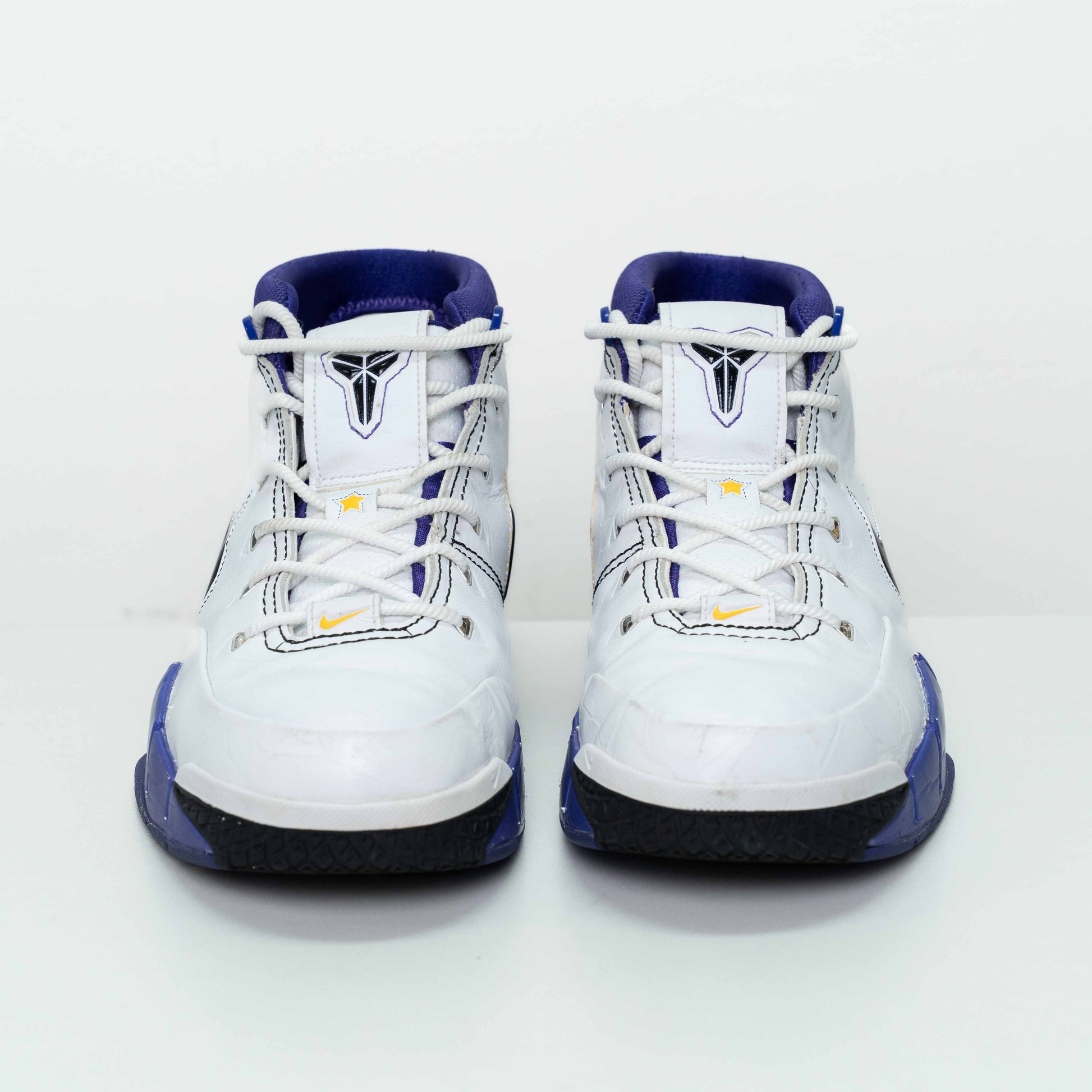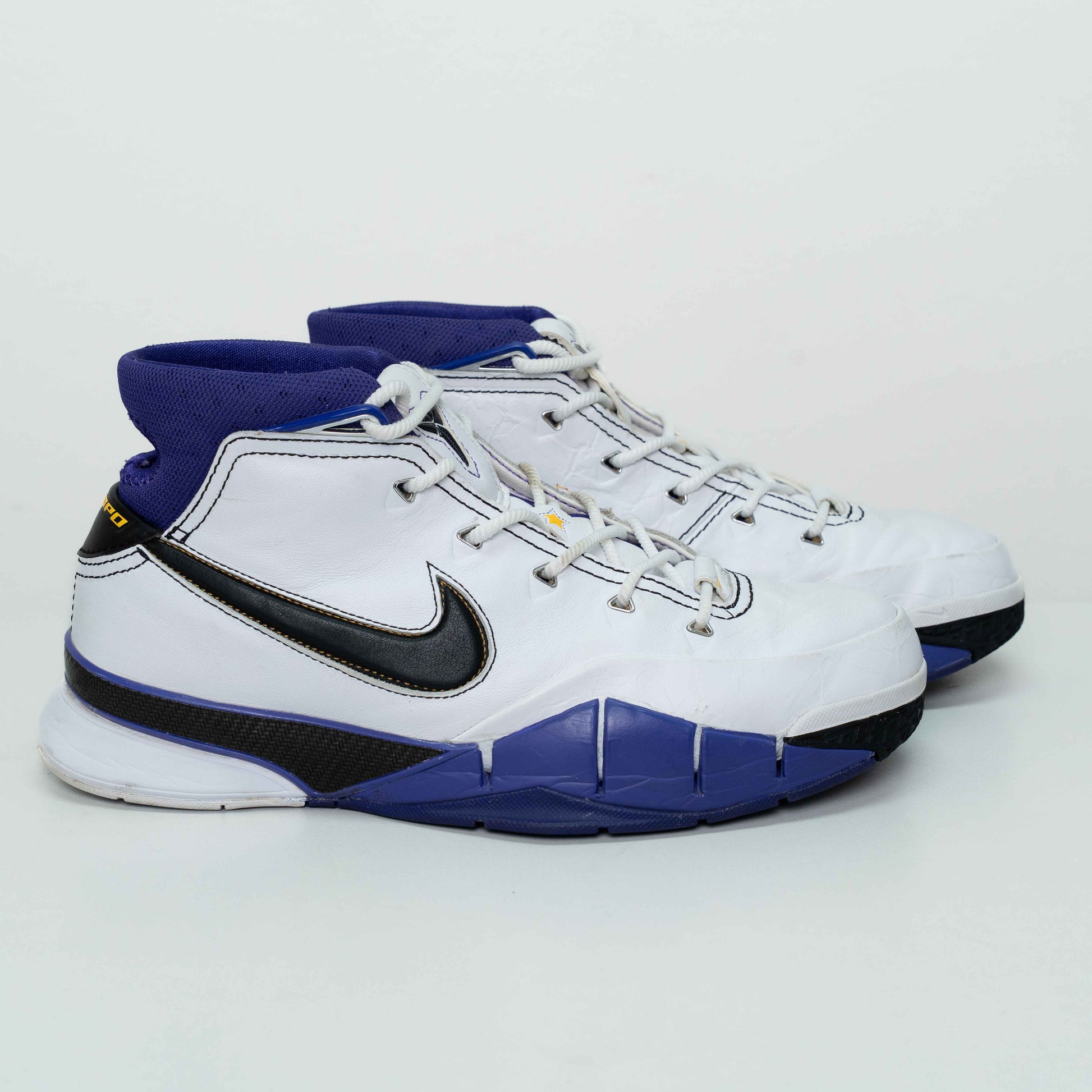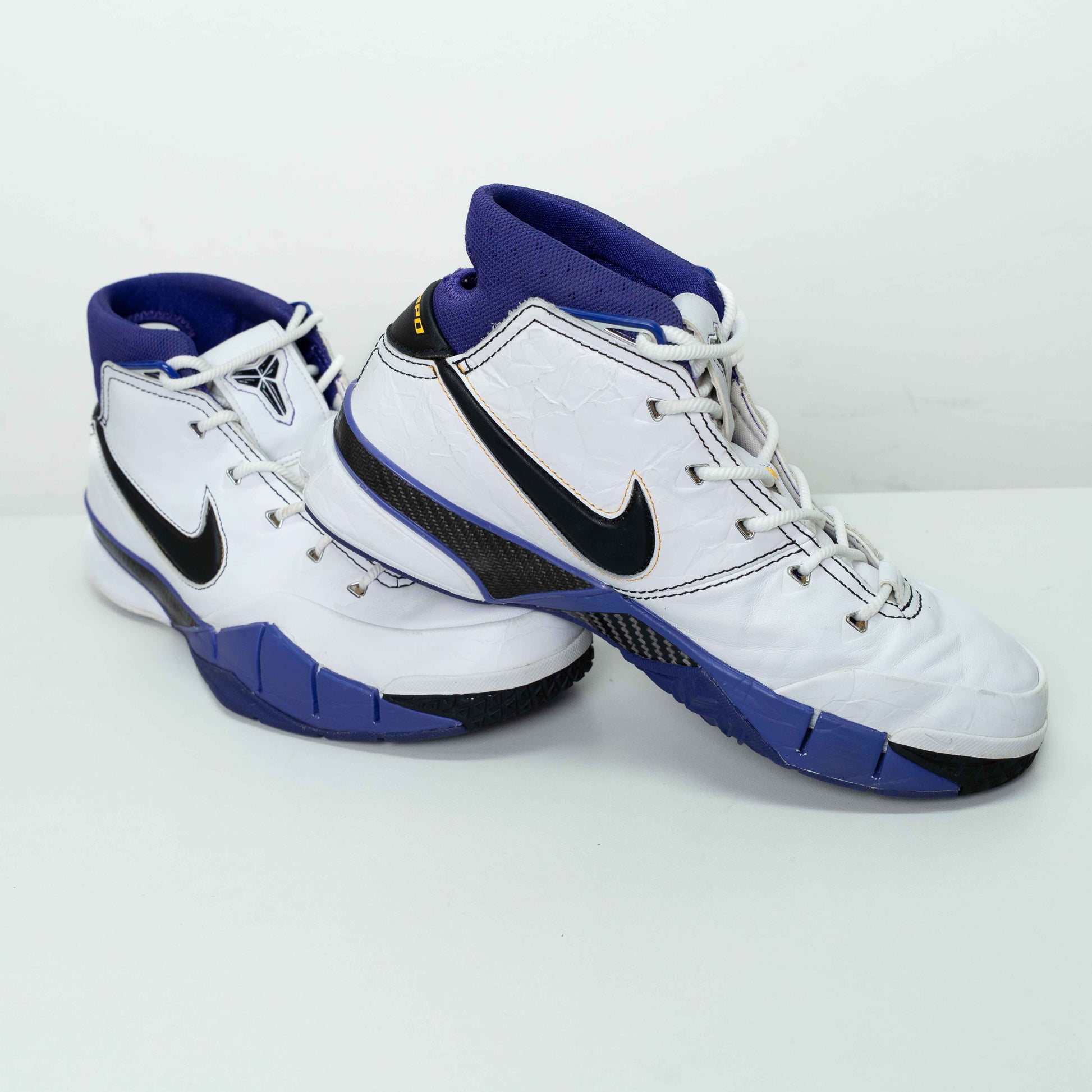 White, purple, and black Kobe 1 Proto high-top basketball sneakers featuring the classic Kobe logo on the tongue and Zoom Air cushioning.