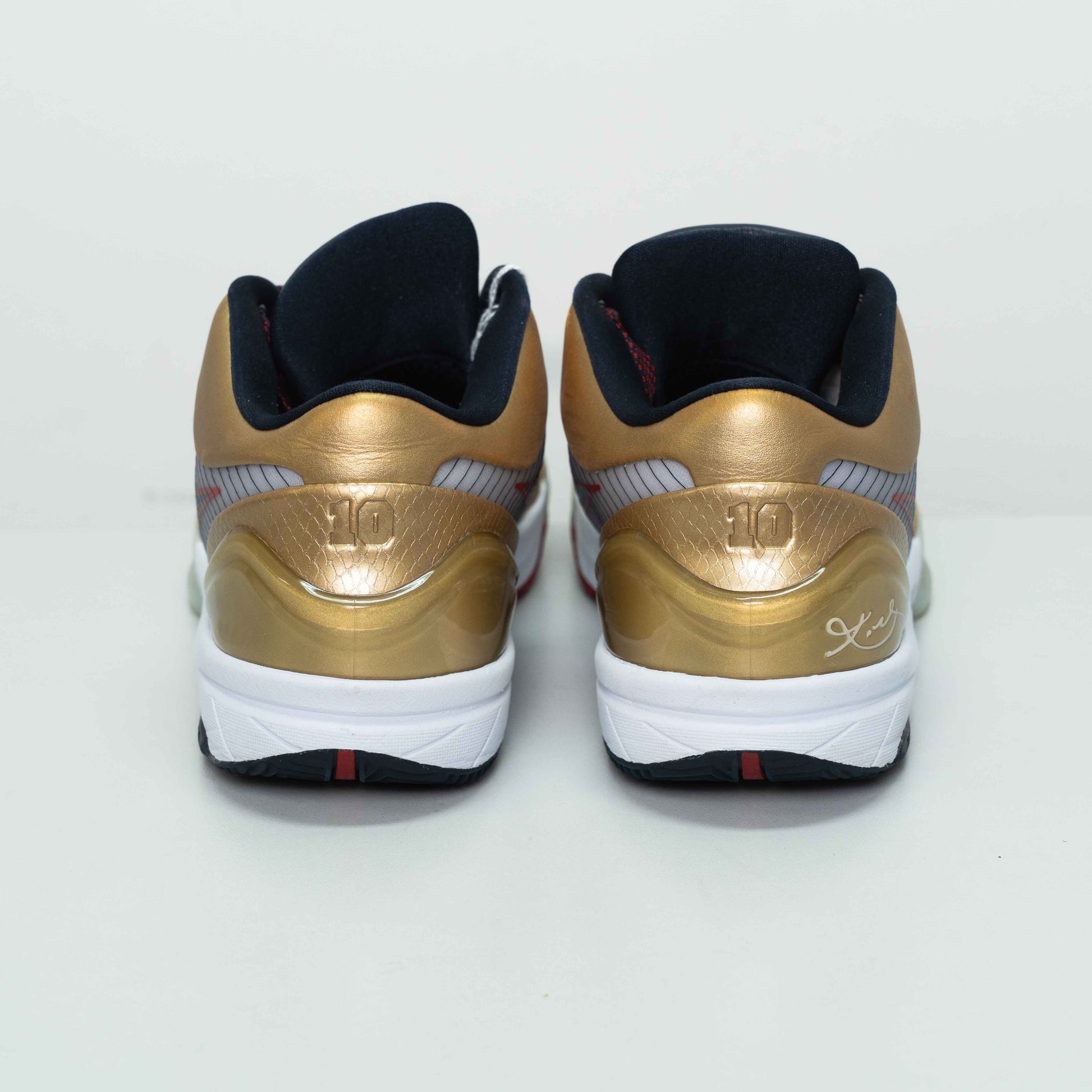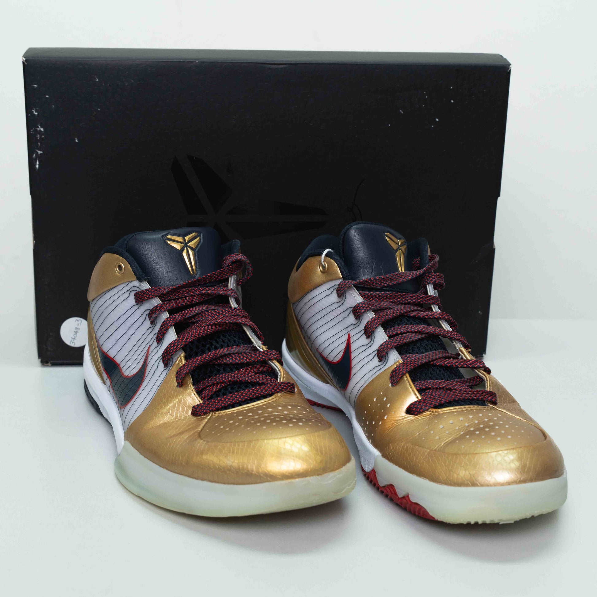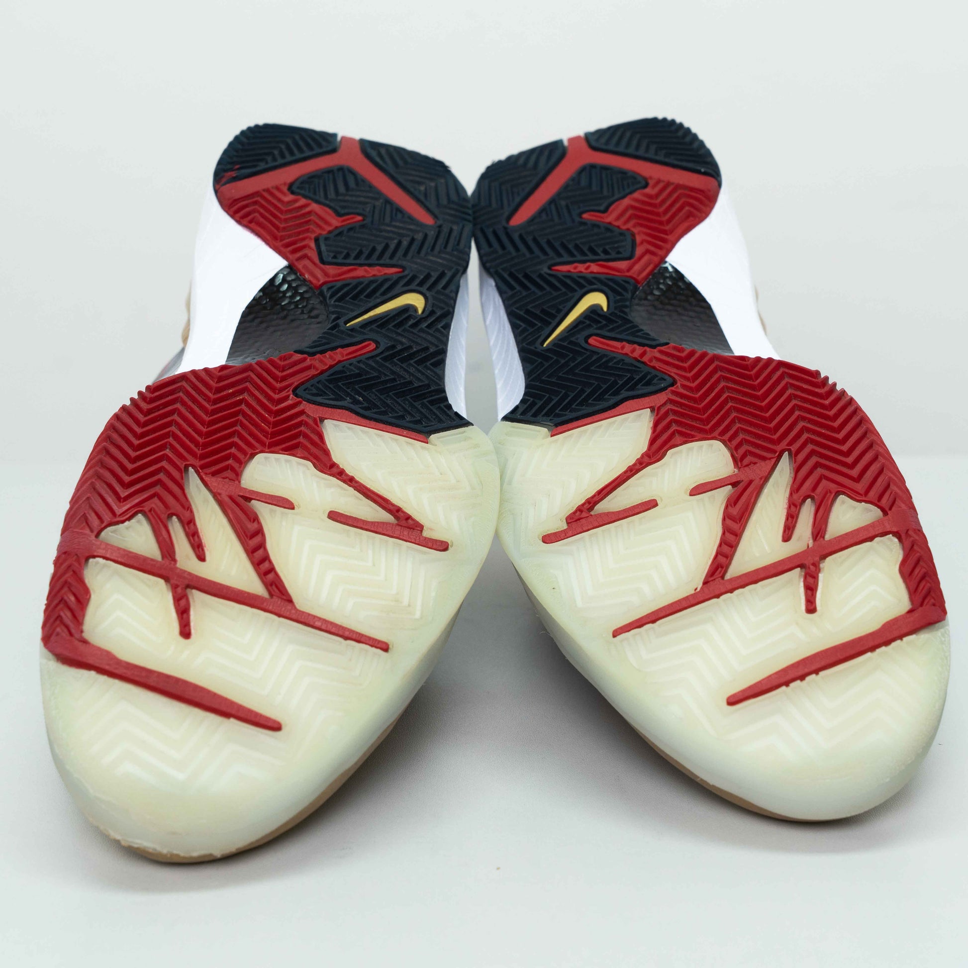 Nike Kobe V sneakers in gold, white, navy, and red accents