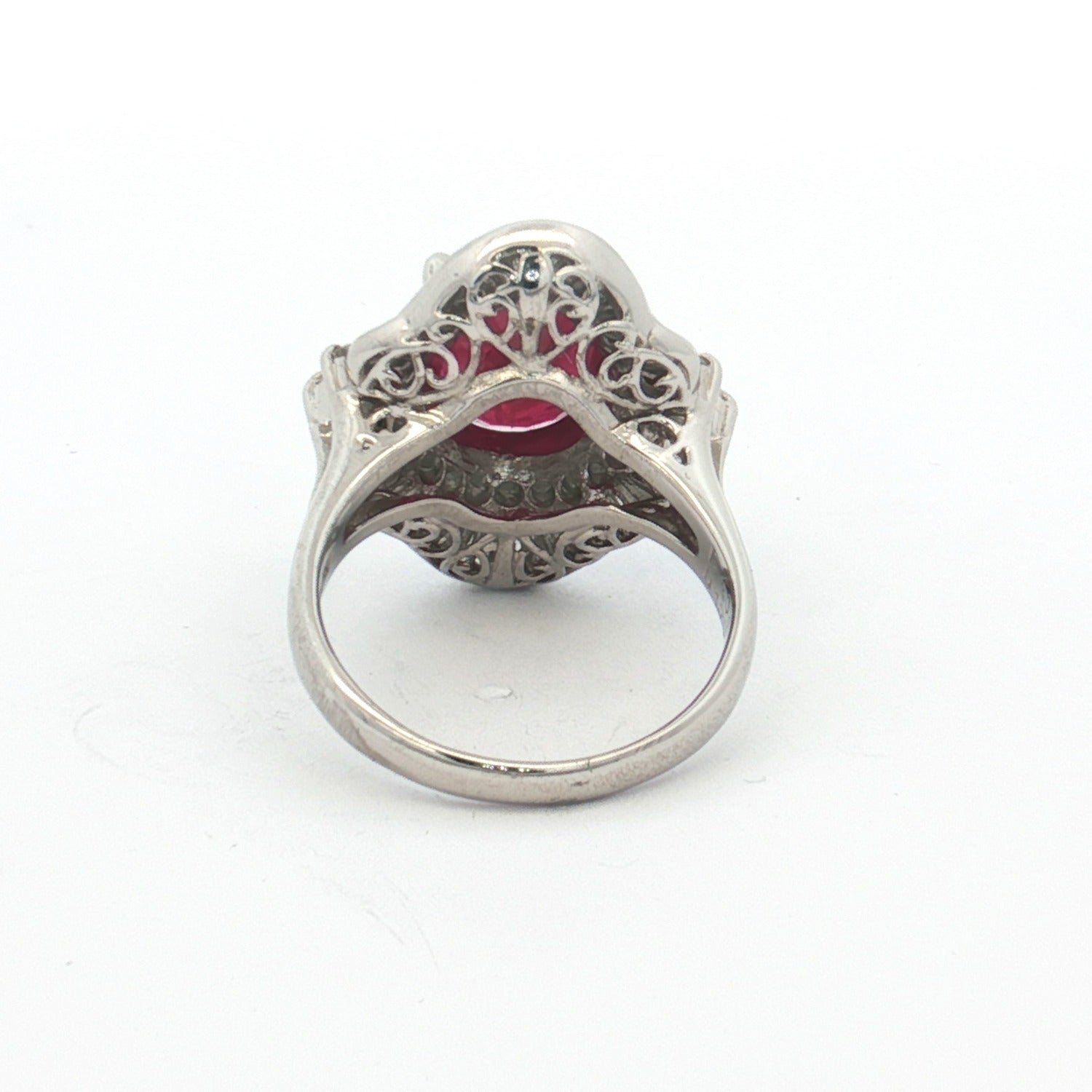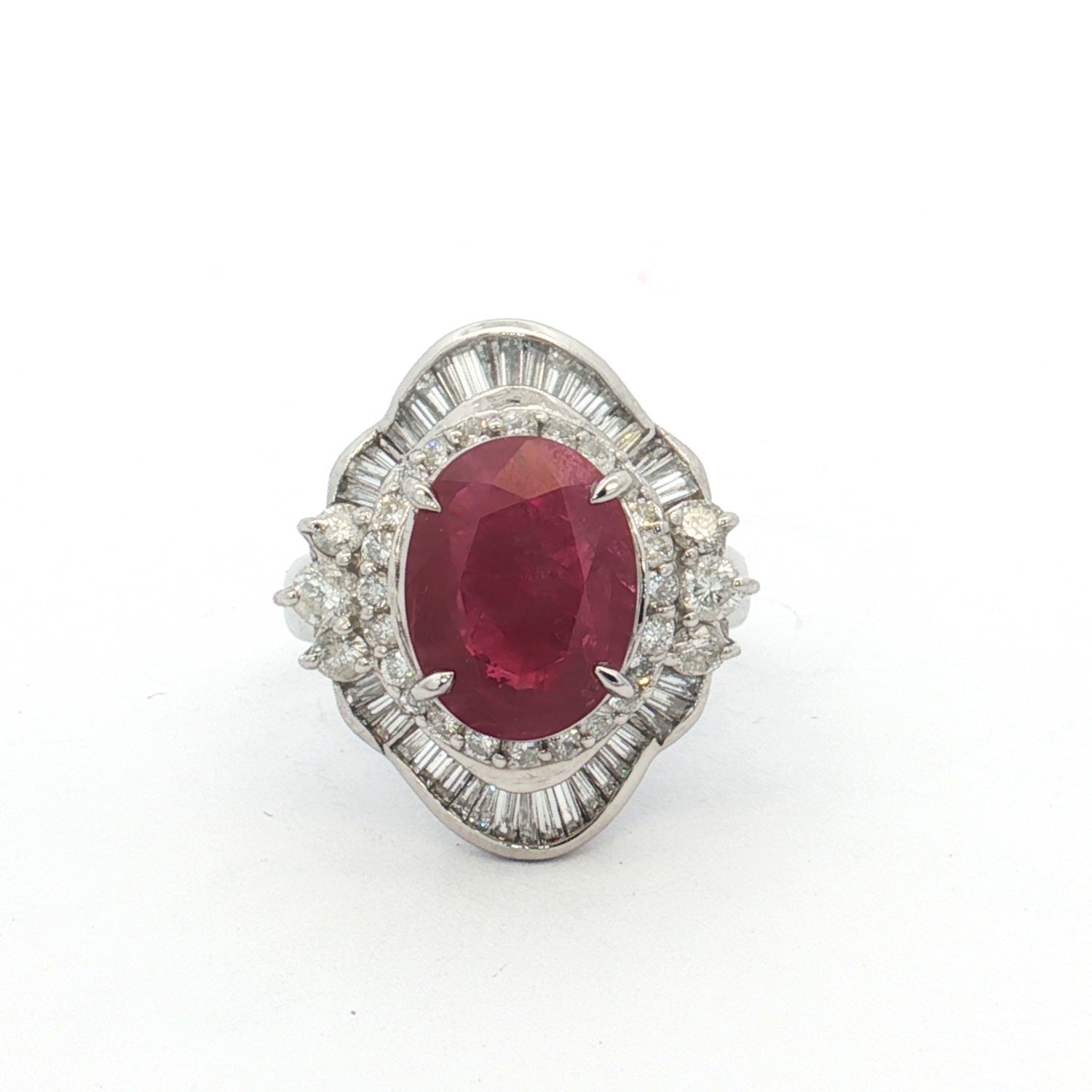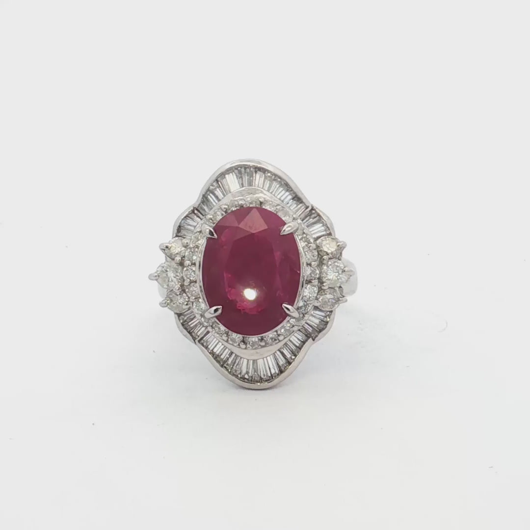 A striking platinum ballerina-style cluster ring featuring a vivid 4.08ct natural ruby from Myanmar (Burma), surrounded by a sparkling arrangement of round brilliant and tapered baguette diamonds. The elegant split-swept shoulders and scroll gallery craftsmanship exude timeless sophistication.