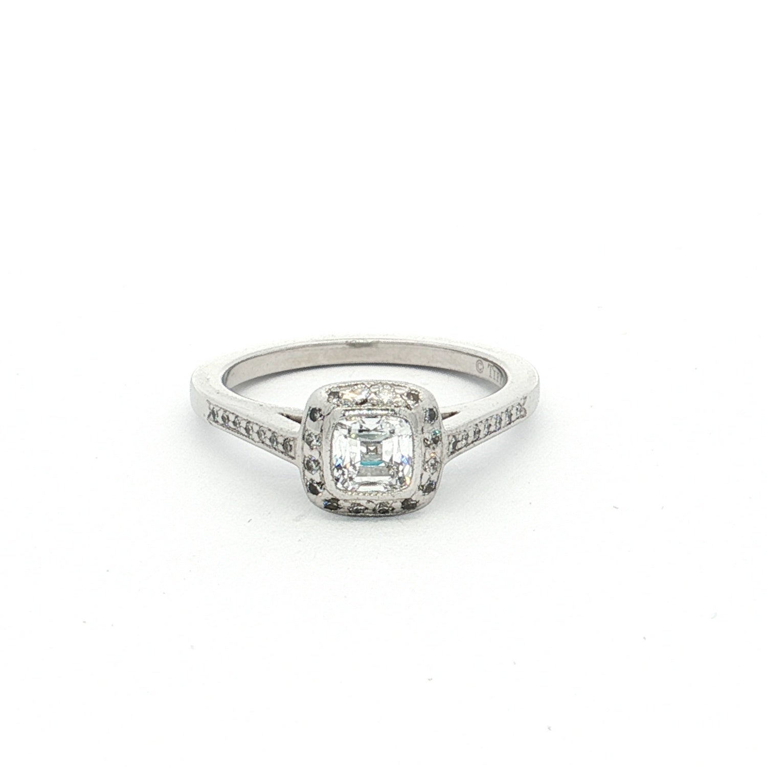 An elegant platinum Tiffany & Co. Legacy 33-stone diamond cluster ring featuring a cushion-cut centre diamond surrounded by brilliant cut diamonds in a classic Legacy design. A timeless luxury piece.